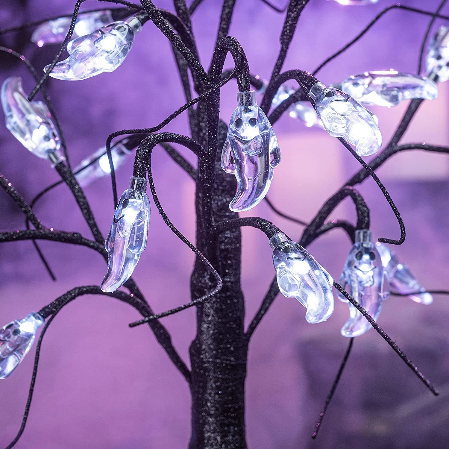 - Unique design & easy to use. Our white ghost and adjustable branches can be reused to create a Halloween-themed christmas tree. The led lights on the tree will give your home a spookier look for trick-or-treaters and guests. It is available in black and white with a white ghost or white bulb