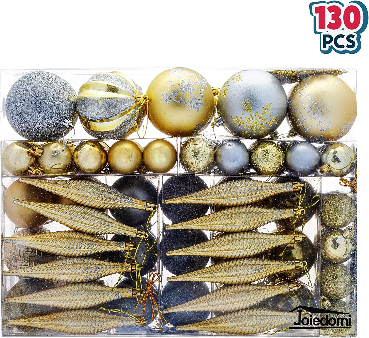 - Our Fantastic Blue & White Christmas Decoration set includes 133 pcs Assorted Christmas Ball Ornaments of 15 Blue Shiny Balls, 15 White Balls, 14 Blue Matte Balls, 13 Disco Balls, 13 Blue Glitter Balls, 12 Stripes Icicles, 12 Zigzag Balls, 10 Blue Snowflakes, 9 White Snowflakes, 8 White Glitter Balls, 4 Quilted Balls, 2 Swirl Balls, 2 Spirals Balls, 2 Snowflake Balls, 2 Christmas Tree Balls. Perfect for indoor and outdoor decorations. Measuring 1.57, 2.36, 3.15 inches.