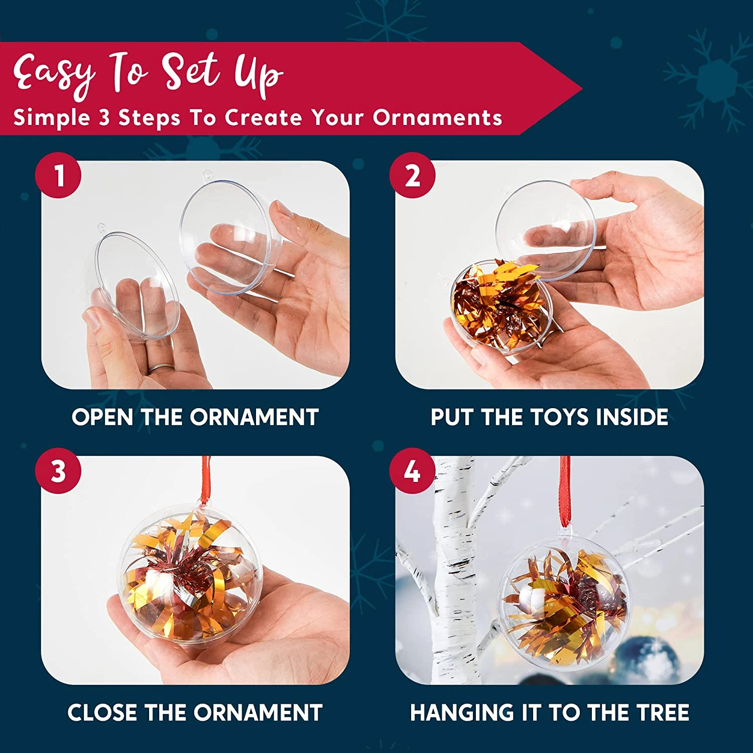 - REAL FUNCTION. These hanging christmas ornaments are shatterproof as it was made out of a heavy duty polystyrene material. This is easy to use as each sphere can be separated into two parts in order to close and open it. Put your favorite gifts inside or decoratives! Hang this on the tree. Even if the ornaments are crushed, it will not have any harmful effects as this is safe for kids and even pets around.