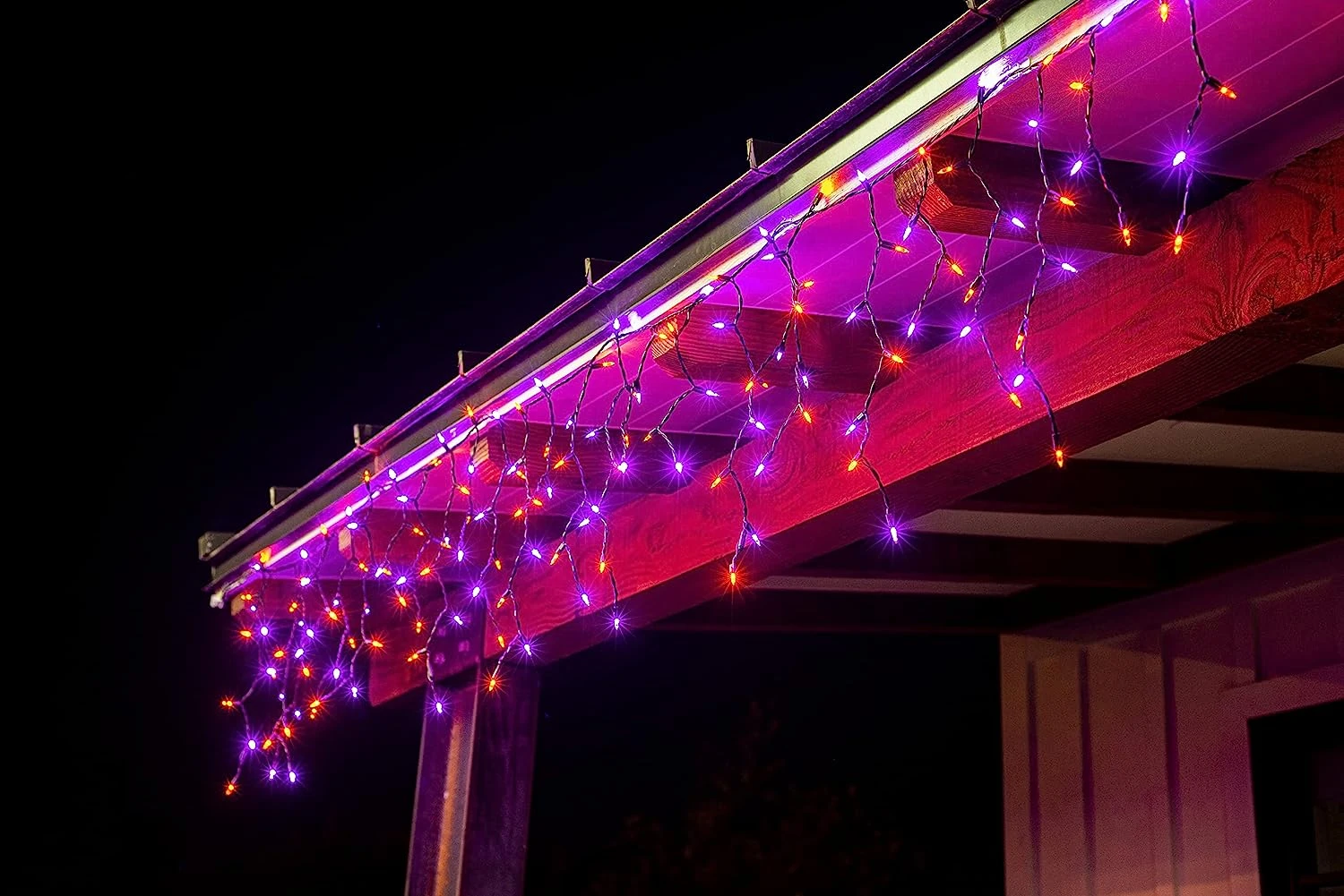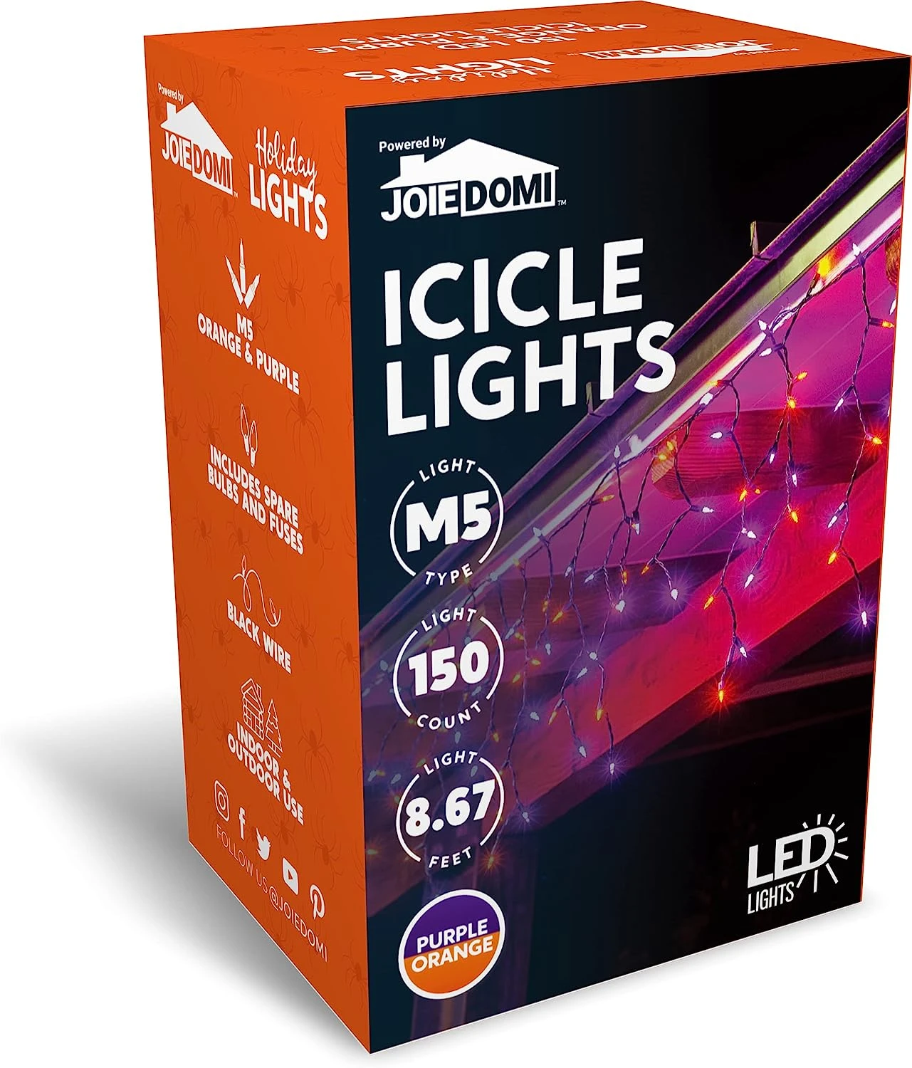 - Our Halloween LED Icicle Lights have a total of 150 LED Orange & Purple M5 Bulbs with Black Wire. 7.2W 120V. Total Lighted Length is 8.67 Feet. Total Wired Length is 10 Feet. Bulb Spacing 3 inches. Drop Spacing 4 inches. High Voltage.
