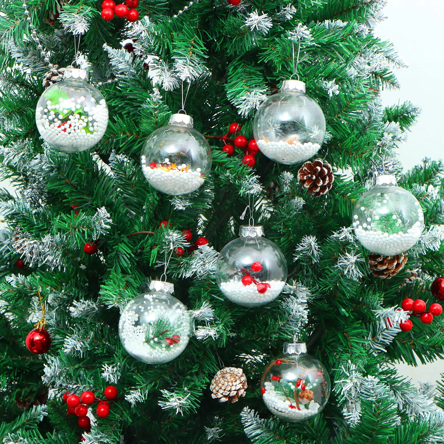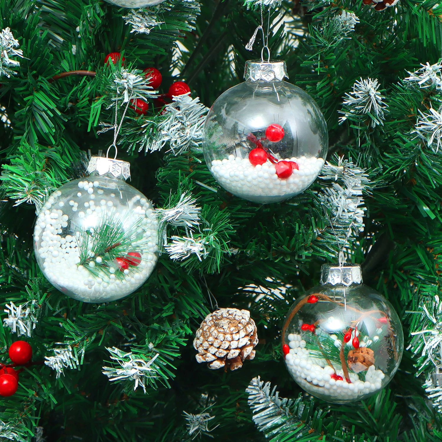 - Our fantastic Christmas decorations include 16 pcs 3.5inch snow filling Christmas ball ornaments in clear plastic. Perfect for indoor and outdoor decorations.