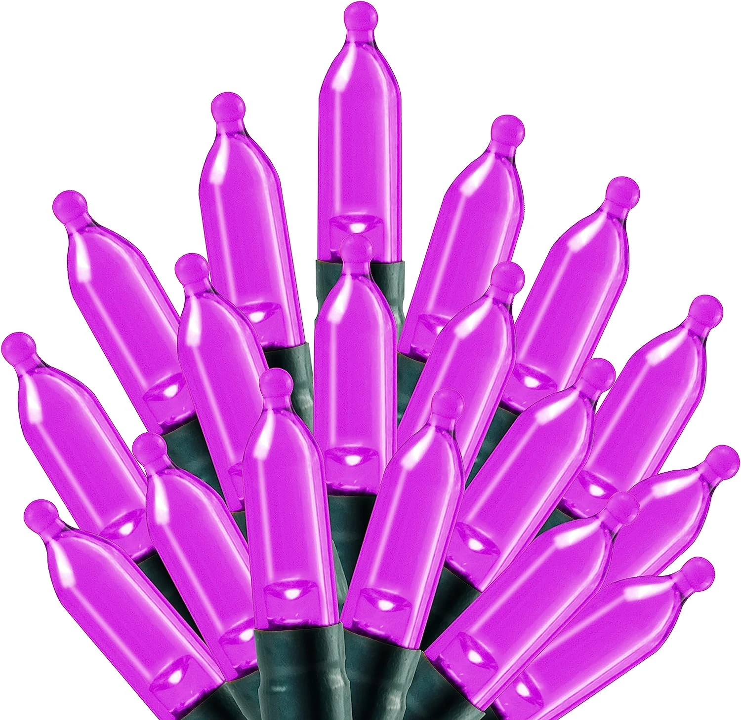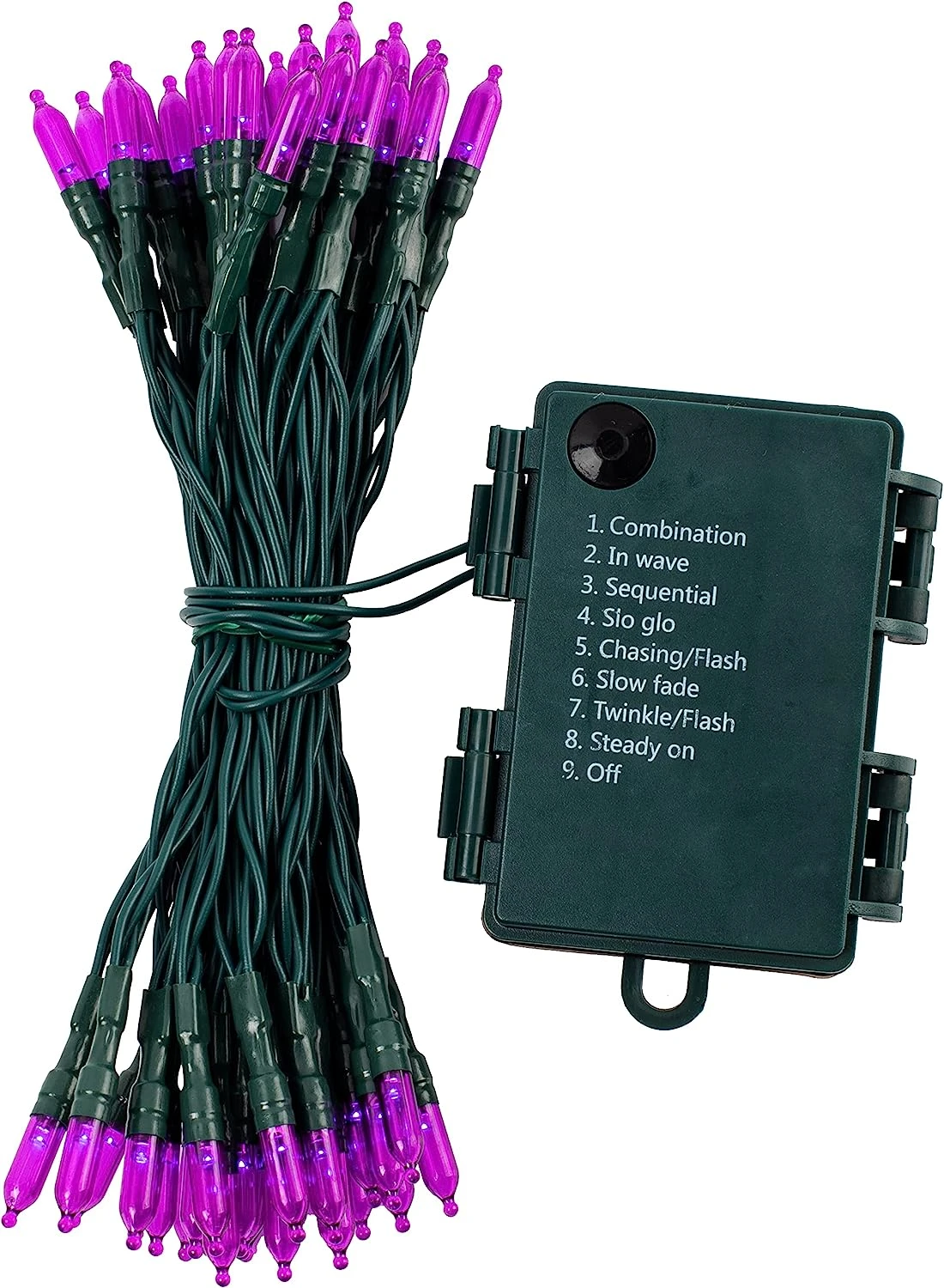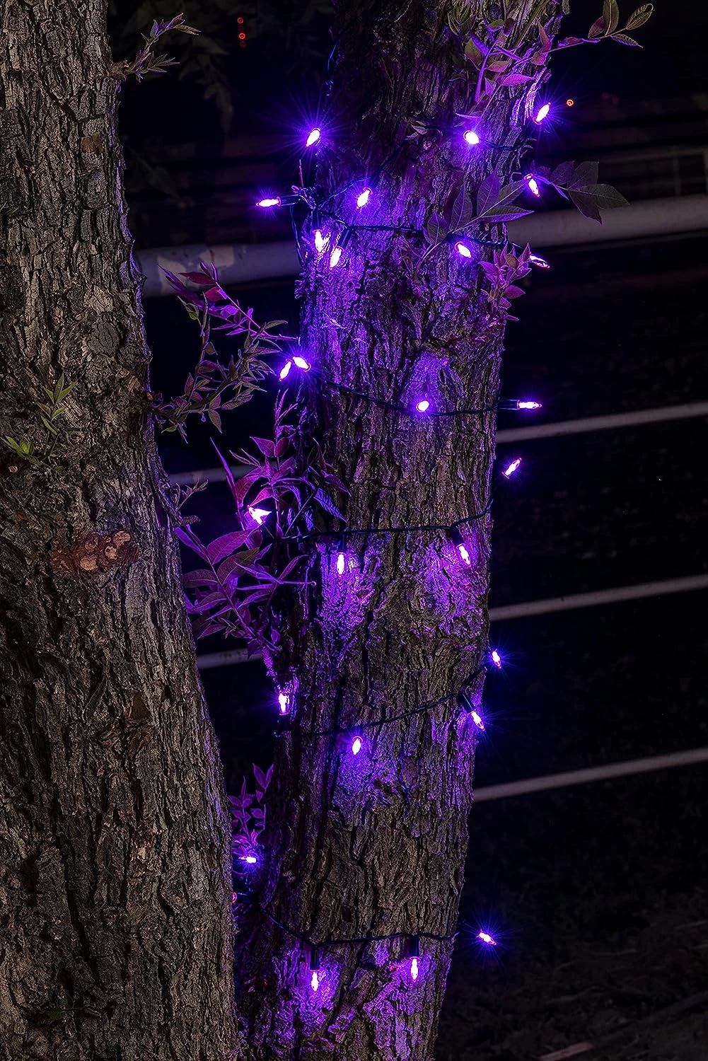 - Our Halloween LED String Lights has a total of 50 LED Purple T5 Bulbs with Green Wire. The total Lighted Length is 16.3 Feet. Total Wired Length is 17.3 Feet. Bulb Spacing 4 inches. Battery Powered.