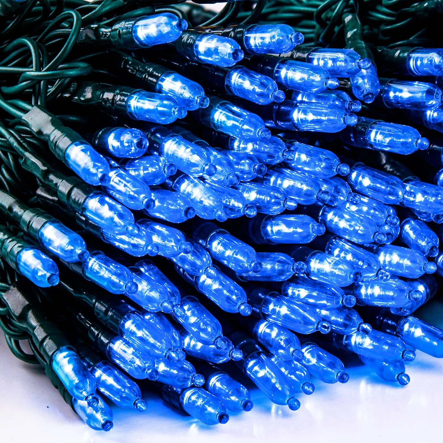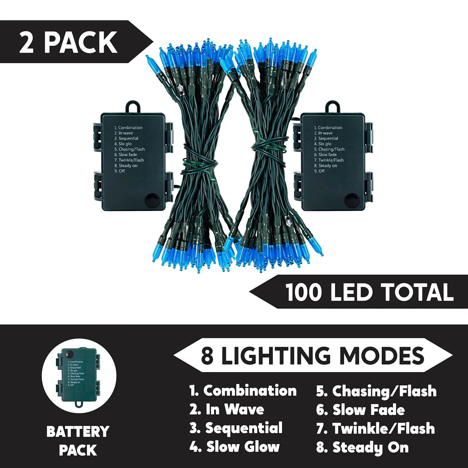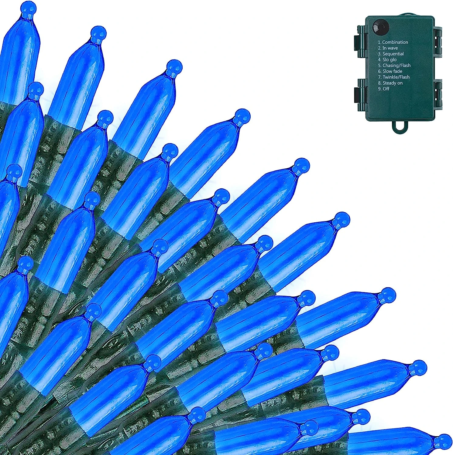 - Our Christmas lights set includes 2 packs of battery powered string light. Each set has 50 counts of blue LED bulbs and measures at 17.3ft. The bulbs interval is at 4 inches and its individual size is 3mm*16mm.