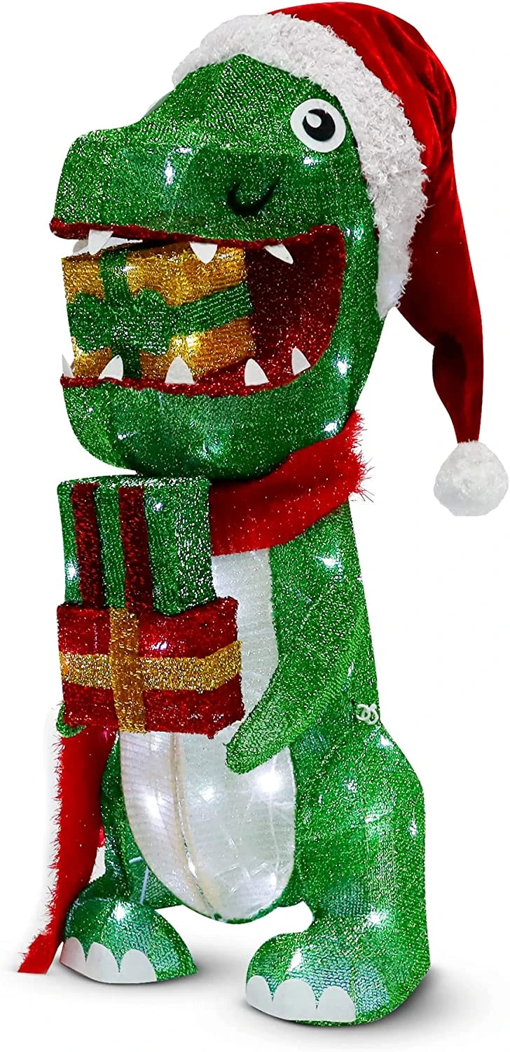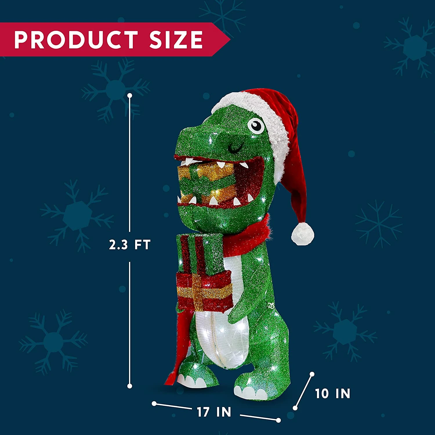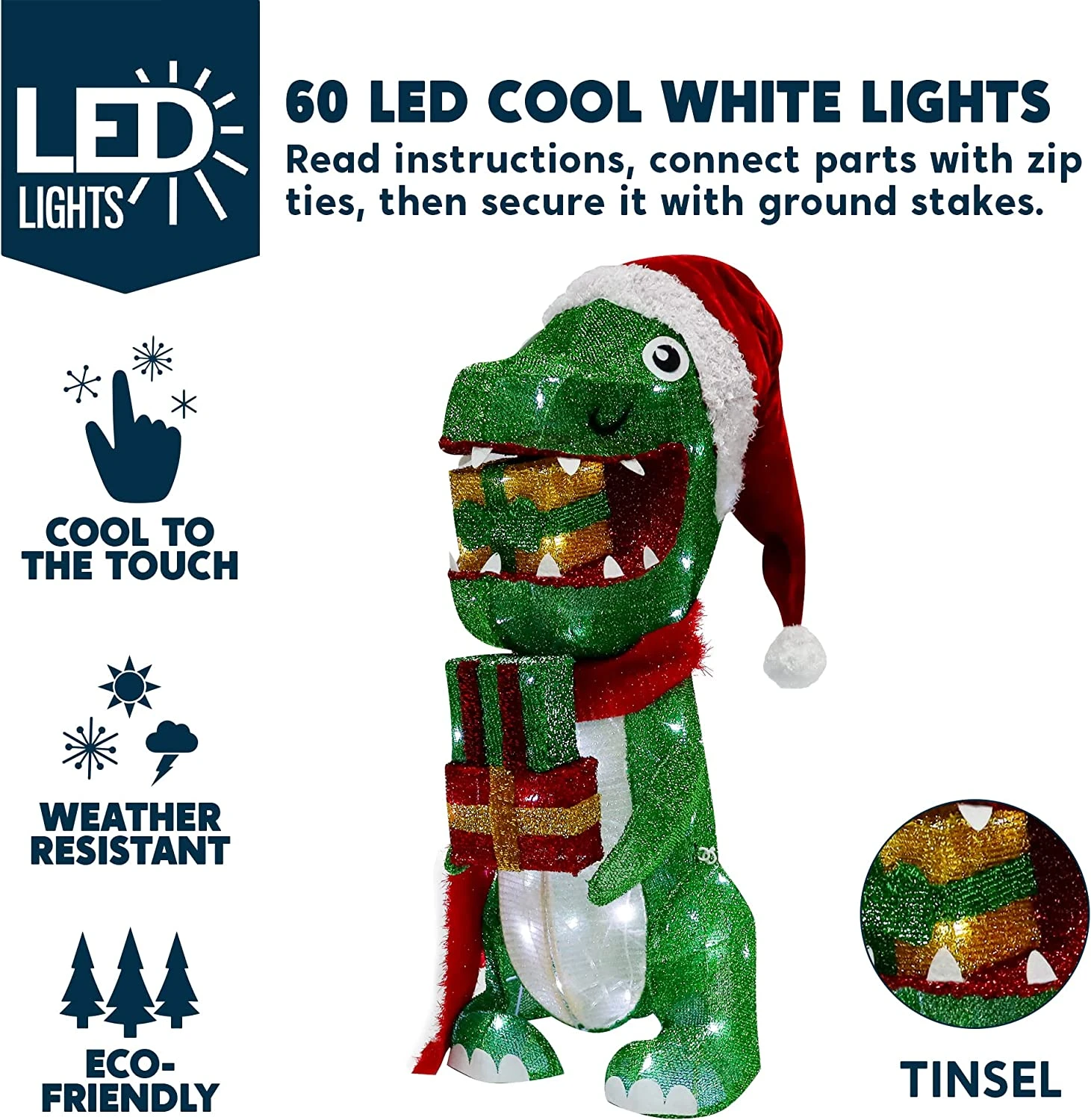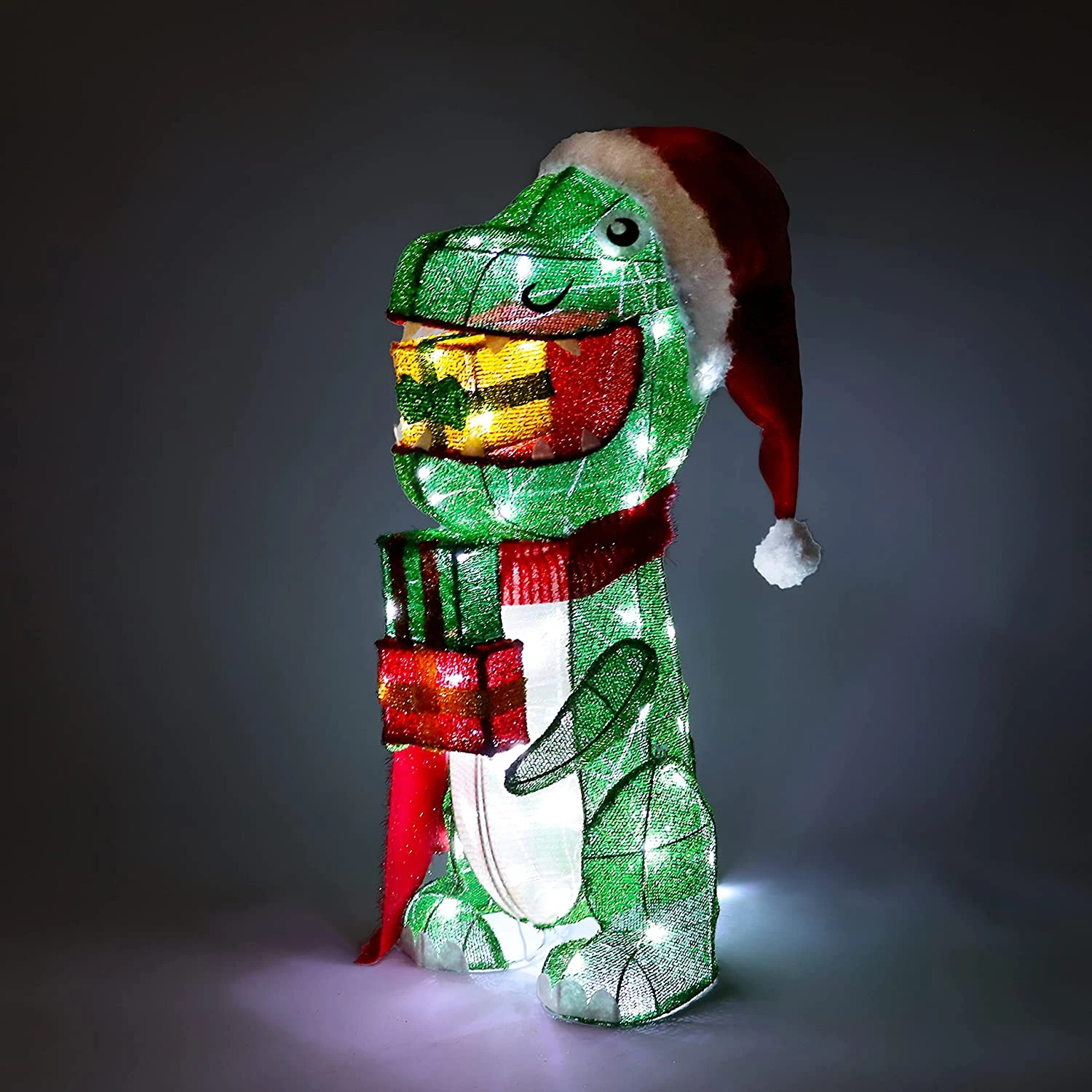 - Our christmas LED yard lights include a 2.3 feet tall green dinosaur with 60 LED cool white lights in clear wire, and 4 metal stakes. Made of metal frame and tinsel fabric.