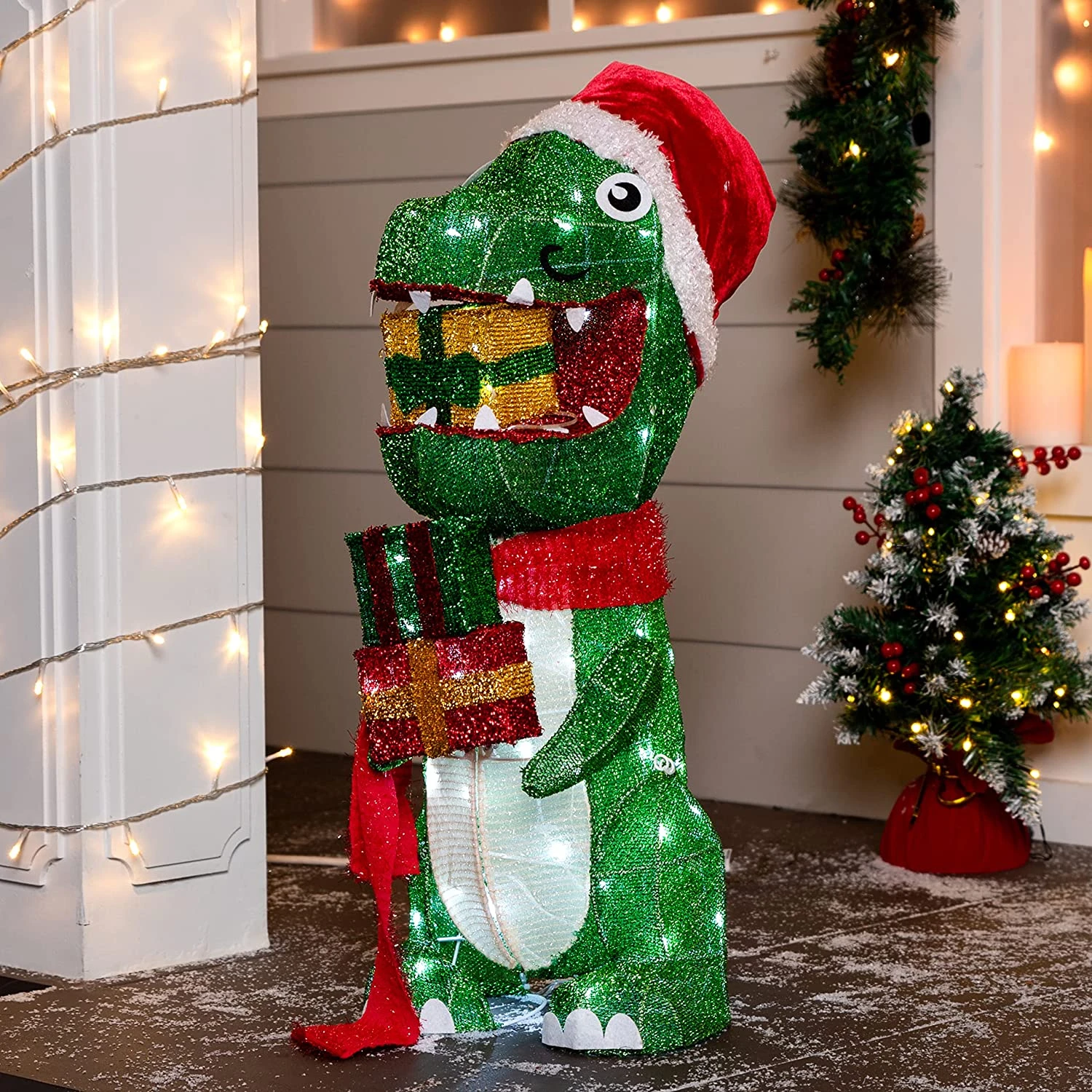 - Unique design & easy to use. Our own unique dinosaur with scarf and gift boxes of christmas yard light is easy to set up. It has pre-wired frames and is very durable. Perfect for indoor/outdoor use.