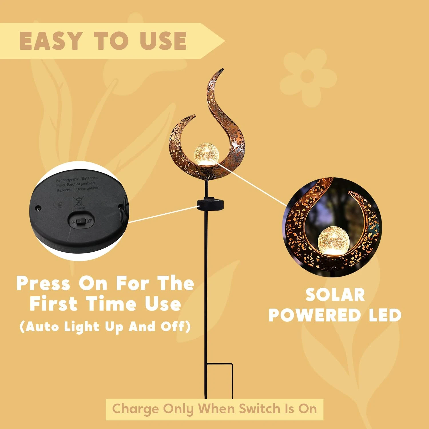 - SOLAR POWER. This solar-powered yard stake light charges during the day (ensure the switch is in “ON” position) and turn on automatically at night for up to 6 hours of nighttime illumination. The reflection of the pattern is beautiful enough to create a romantic atmosphere.