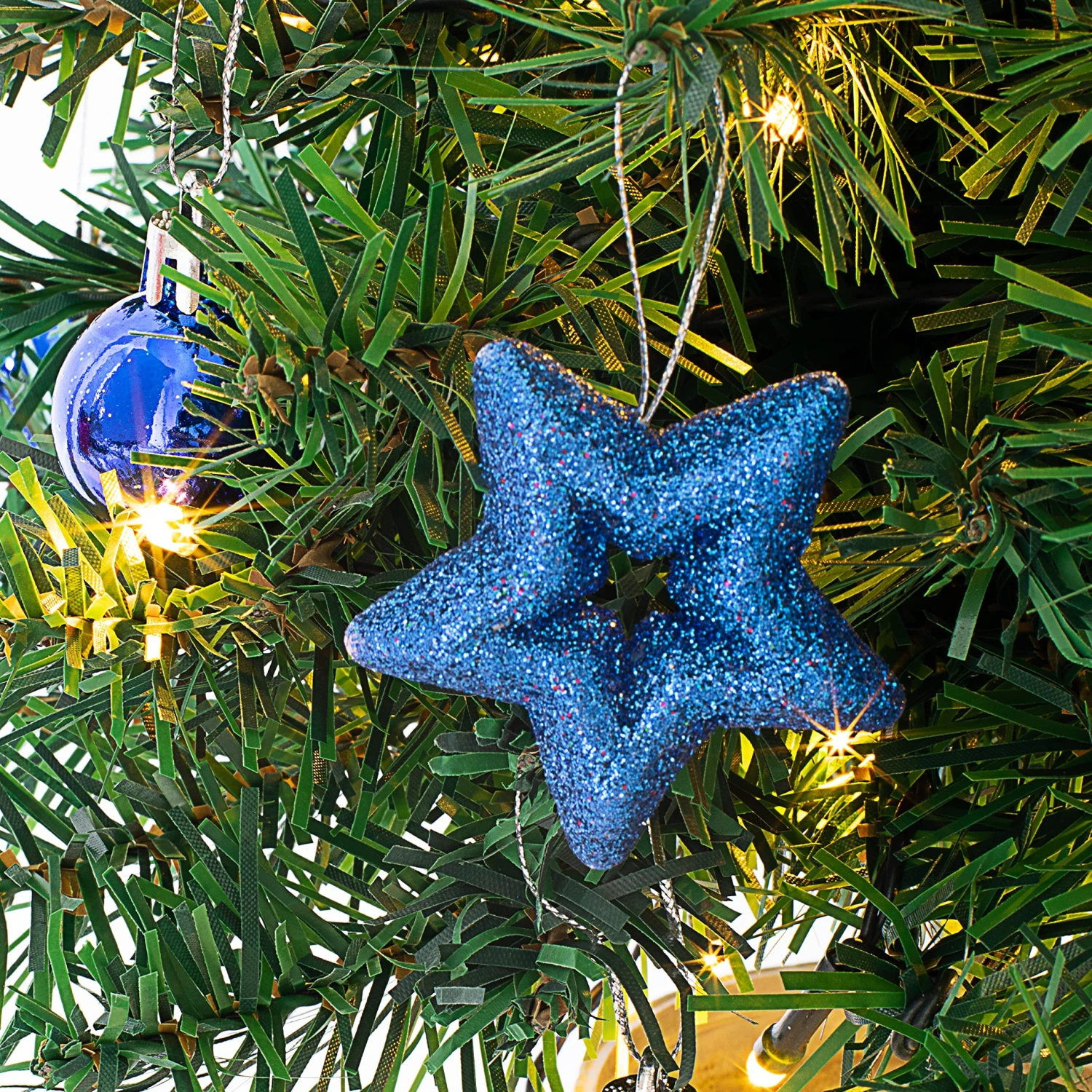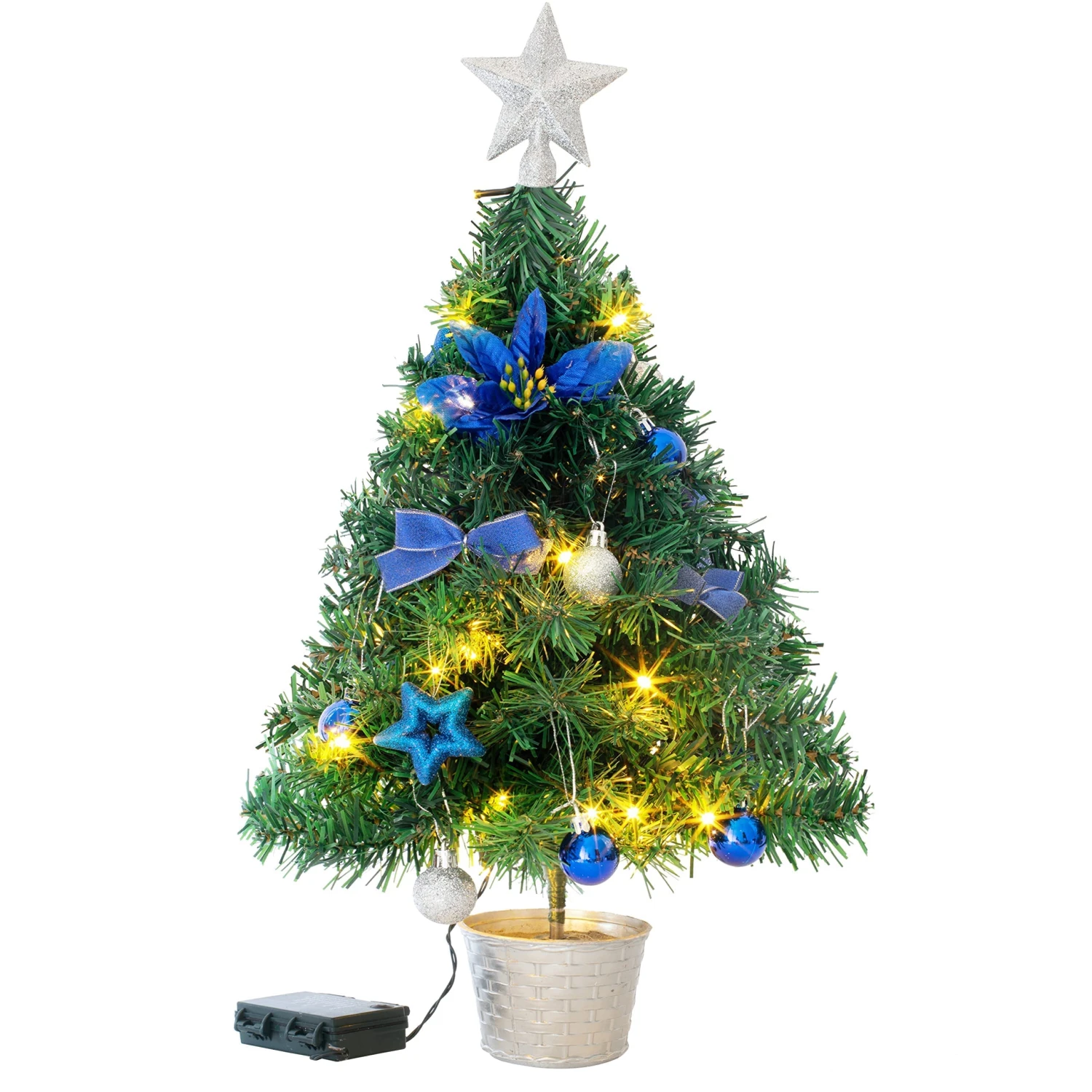 - Our decorative holiday tree includes 24 inches battery-powered tabletop mini Christmas tree with 50 LED warm white string lights. This comes with one treetop star,12 Christmas balls ornaments(6 blue and 6 silver),4 beautiful bows,3 five-pointed stars,3 beautiful flowers,1 sturdy silver flowerpot. Build your own Xmas tree and bring yourself a fun festive memory!