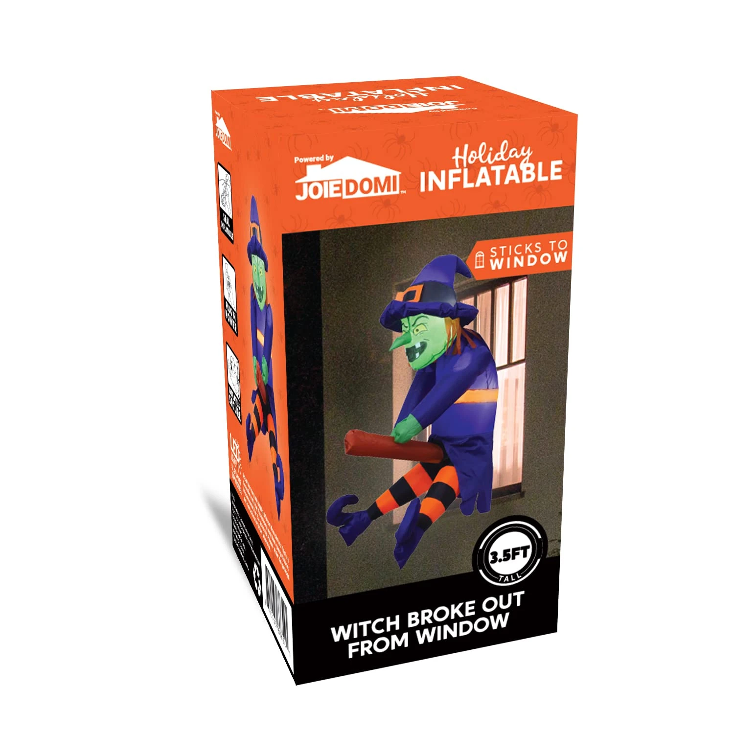 - Our 3.5 ft Tall Flying Witch Window Crasher Halloween Inflatable that comes with an extended cord, fastened ropes,screw sucker and a plug with UL certification.