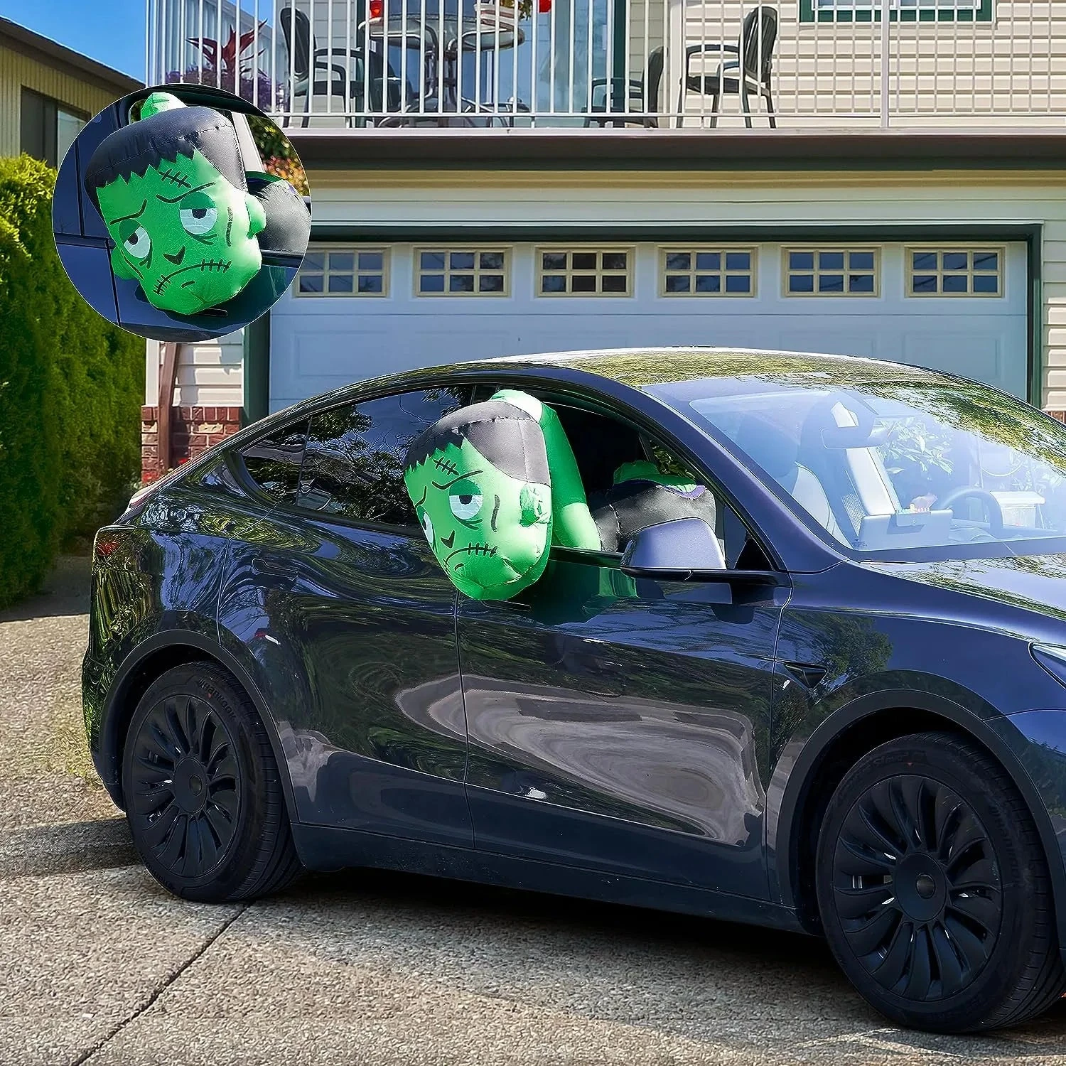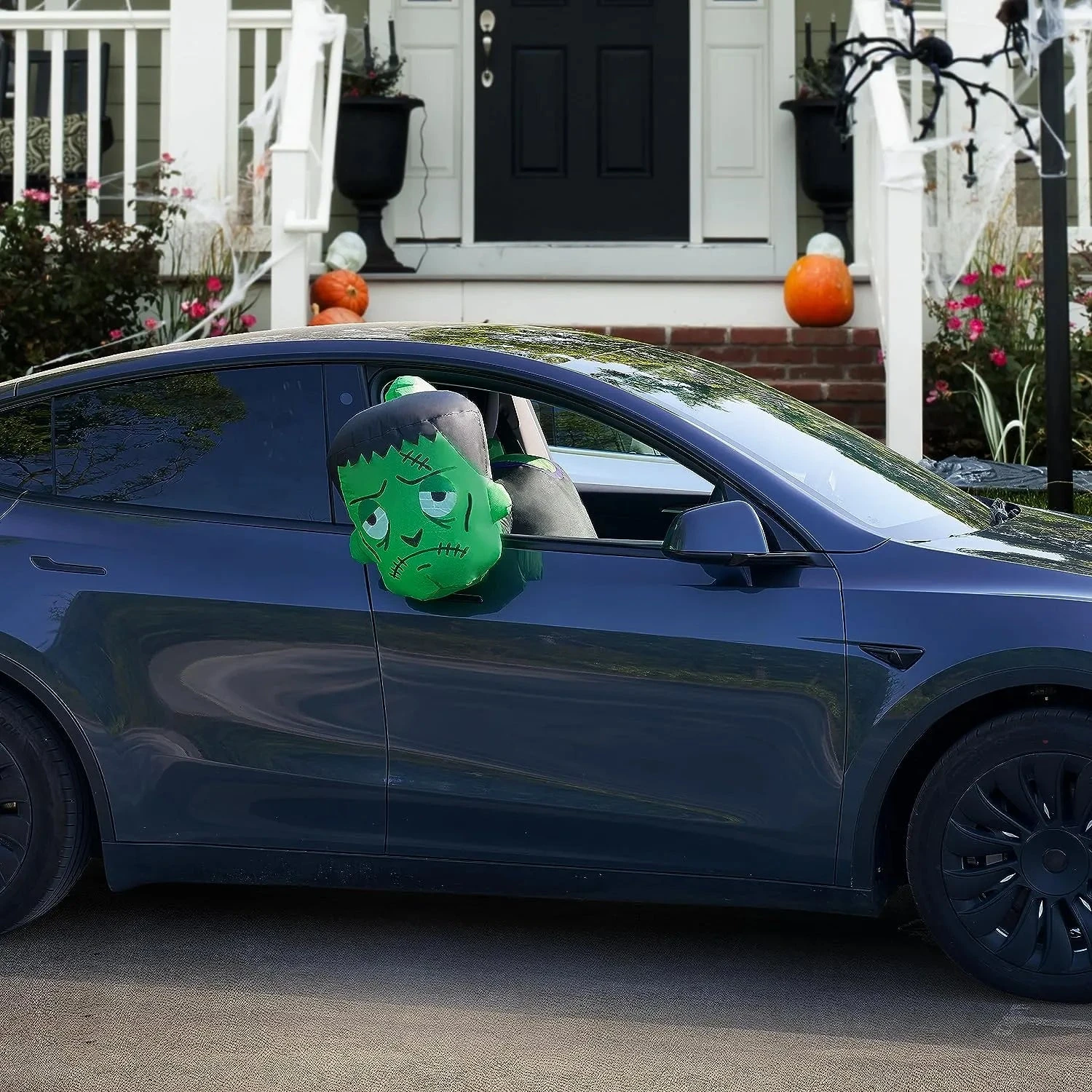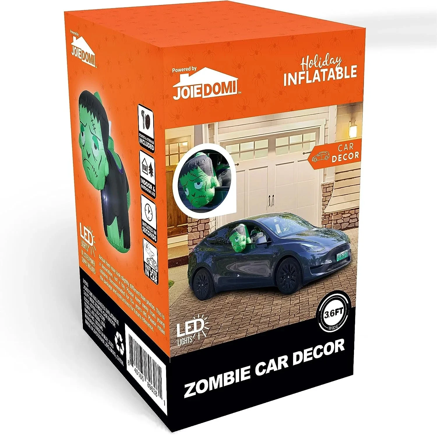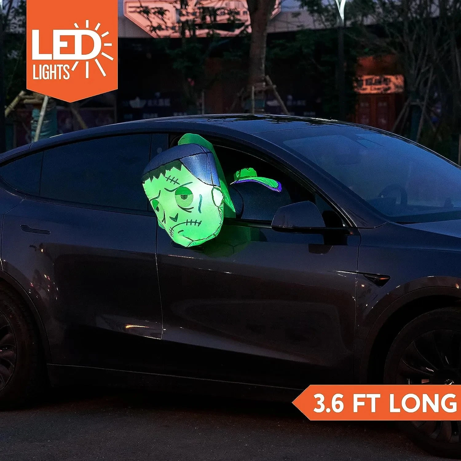 - Great Functions. The inflatable zombie body part is designed to sit inside the car while the head extends outside the car window. This unique arrangement gives the illusion of a zombie hitching a ride and creates a memorable Halloween experience for onlookers. With built-in LED lights, the blow-up outdoor decoration is a great decoration for Halloween night. Compatible with all car types.