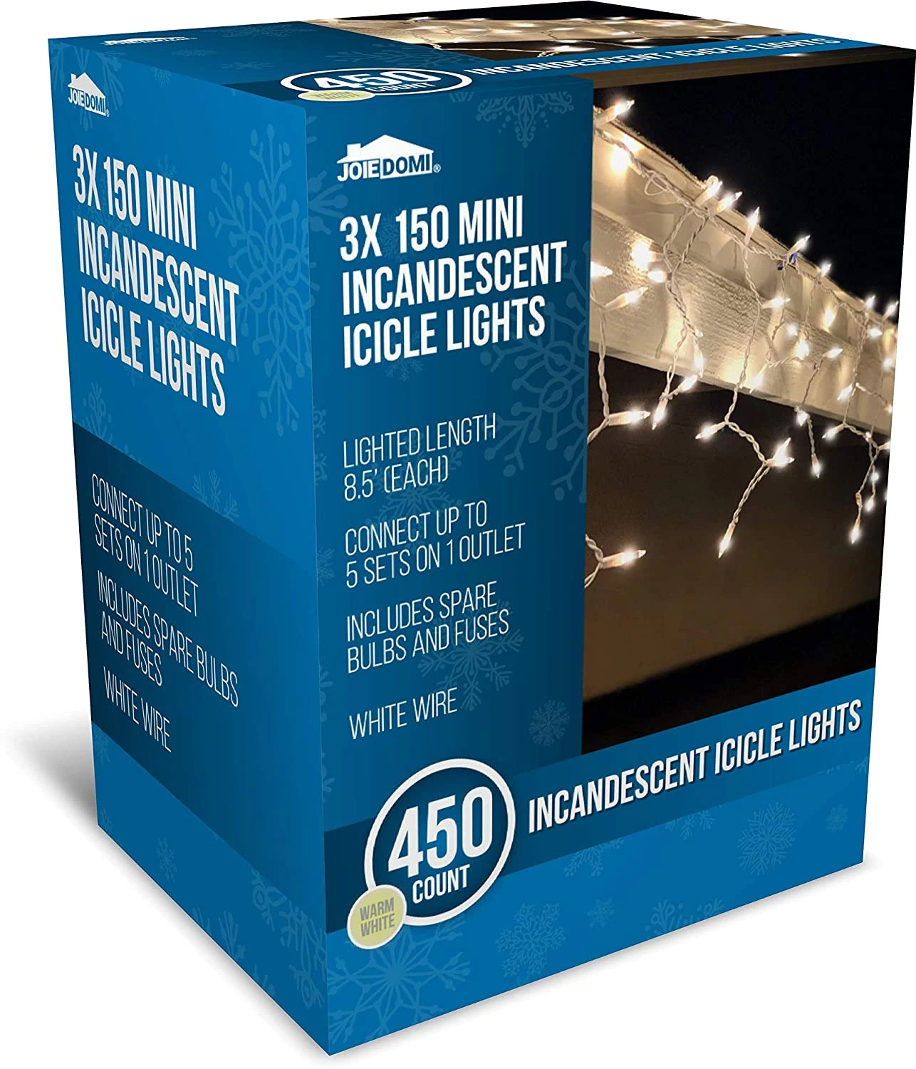 - SUPER VALUE PACK. Joiedomi LED Icicle Christmas Lights includes 3 sets of 150 bright Warm White Incandescent bulbs with white wires, spare bulbs and fuses. Each set has a lighted length of 8.5 Feet. High Voltage.