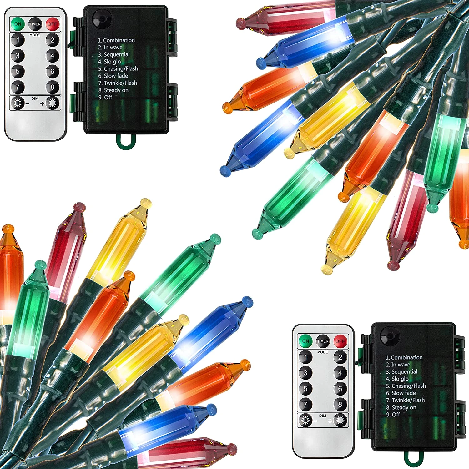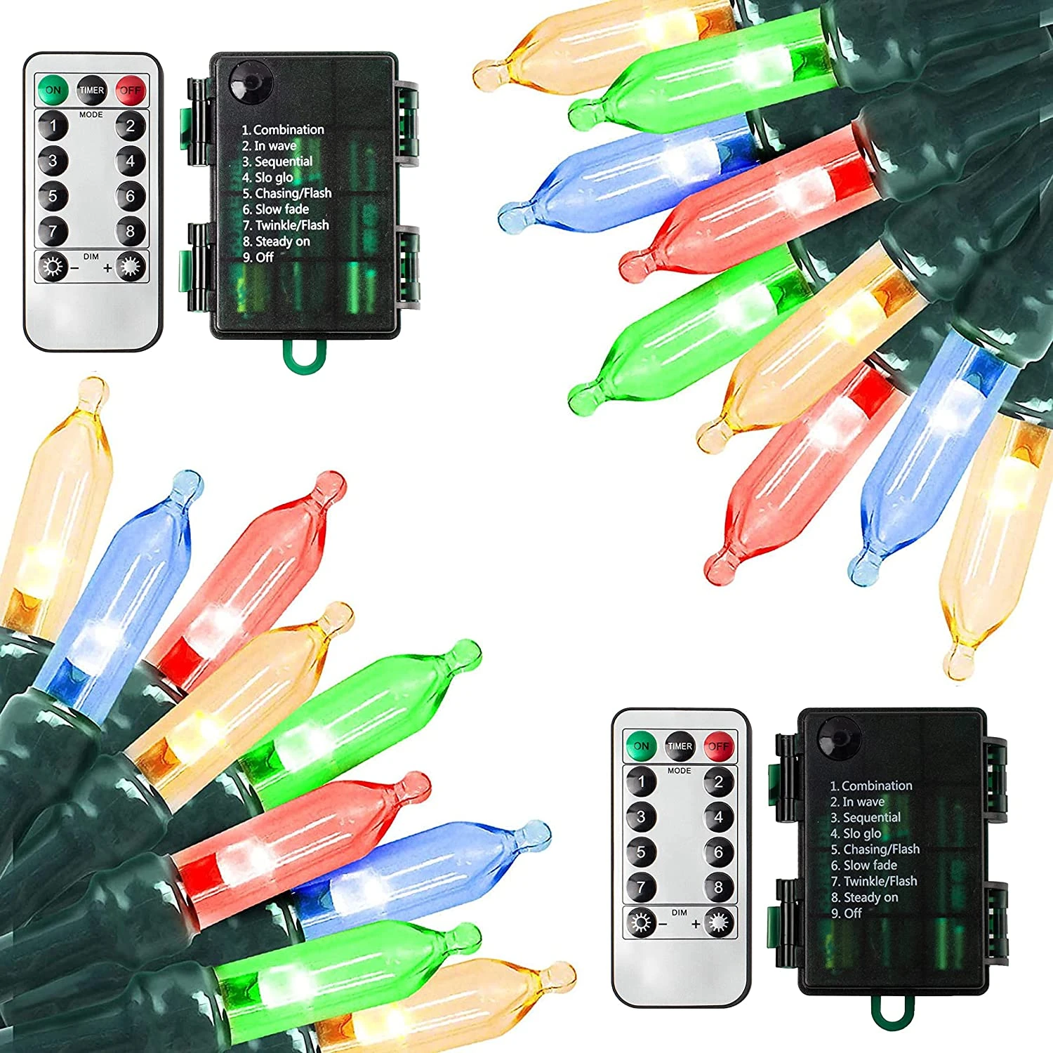 - Our string lights set includes 2 packs of 50 count multicolor led green wire string lights with 8 lighting modes. Each set is 17.3 feet long and has 50 counts of orange and purple LEDs with 4 inches spacing in between each bulb. The bulb’s size is 3 mm x 16 mm. These lights are battery powered, operated by remote control with a 6-hour timer.