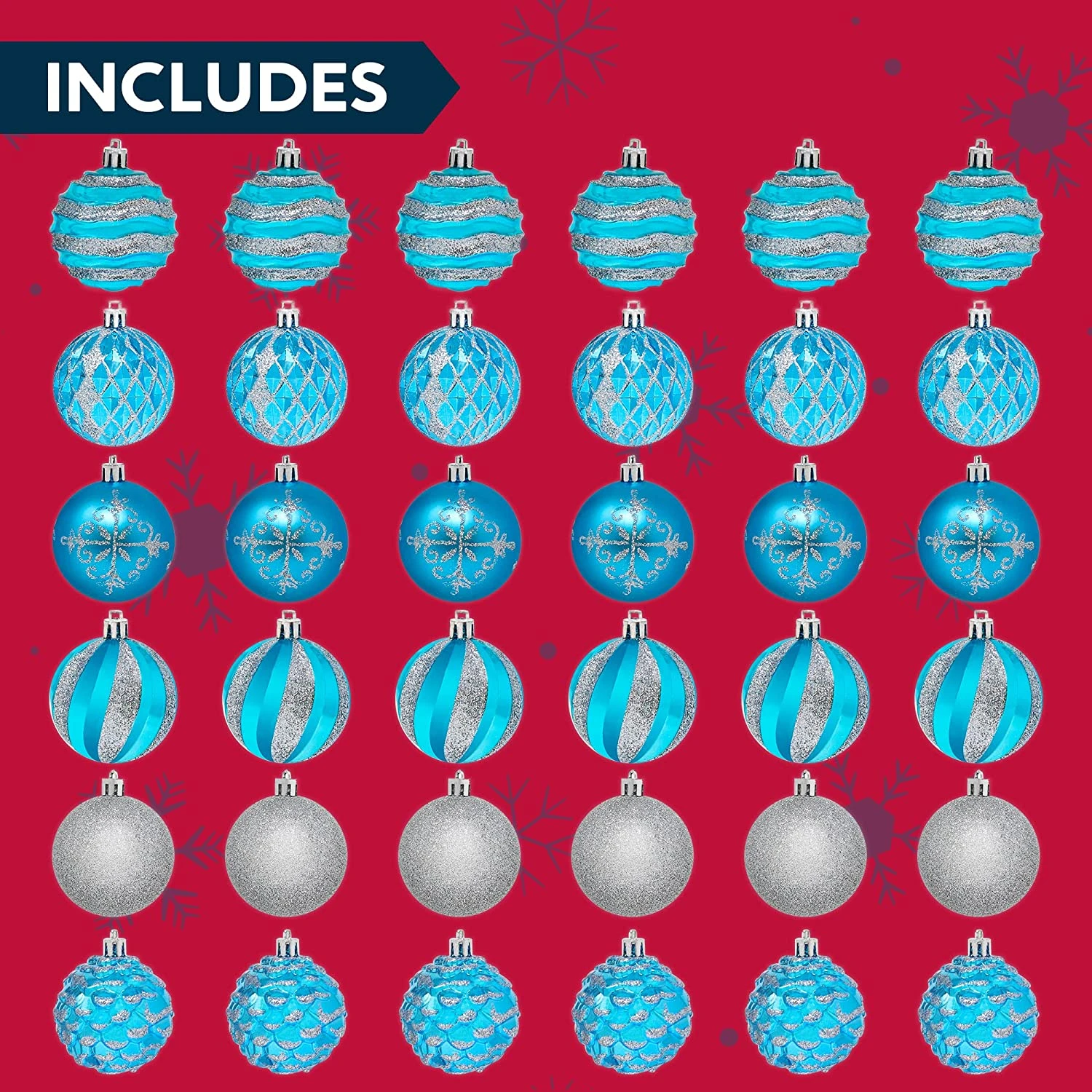 - COMPREHENSIVE SET. Christmas Tree Balls include 6 stripes balls, 6 plaid balls, 6 spirals balls, 6 swirls balls, 6 glittery balls, 6 snowy pinecone balls