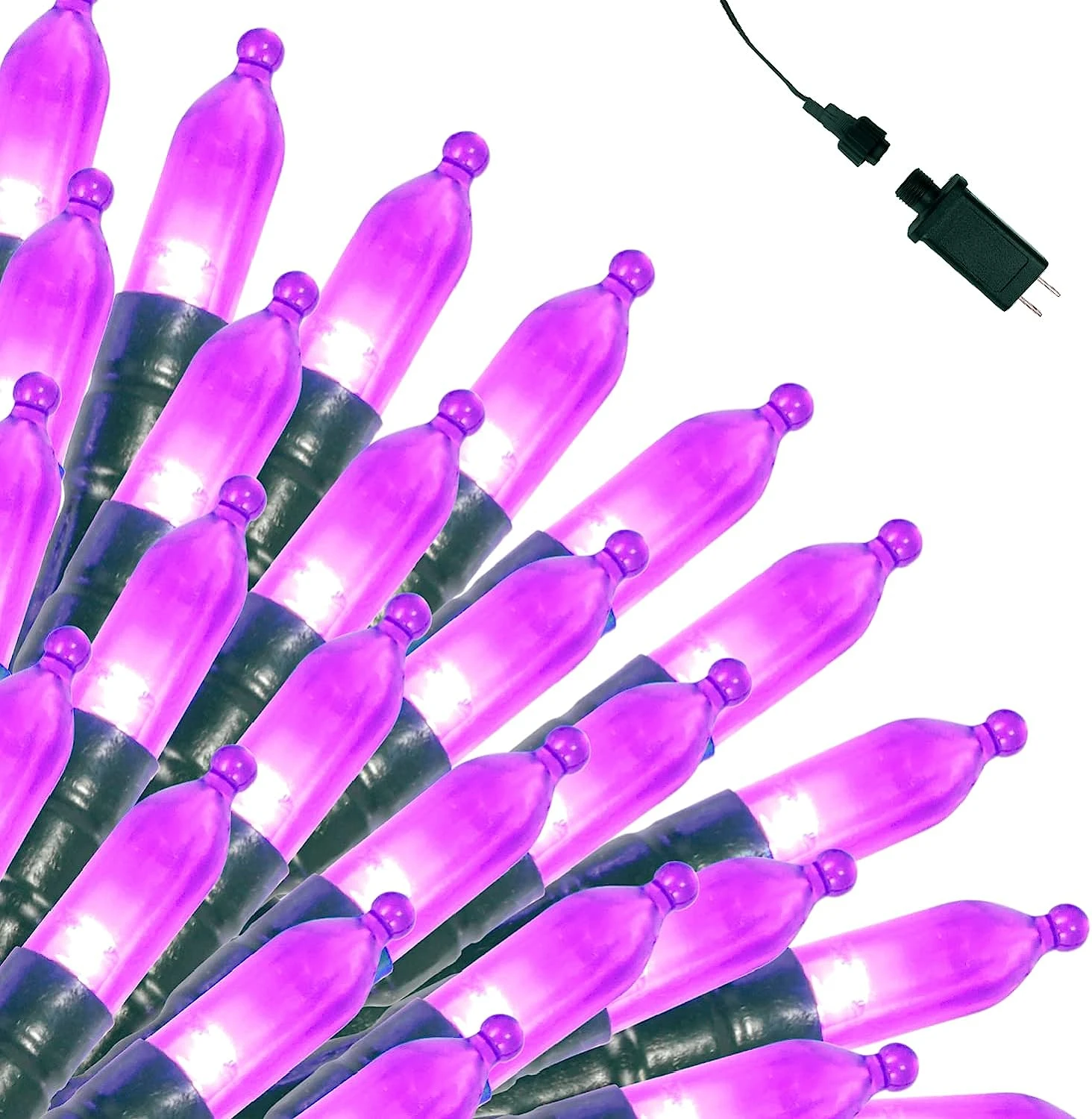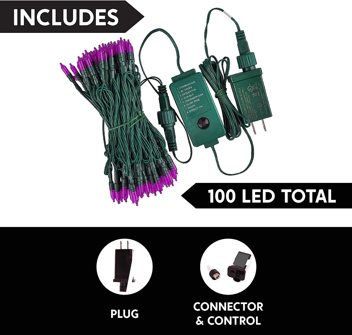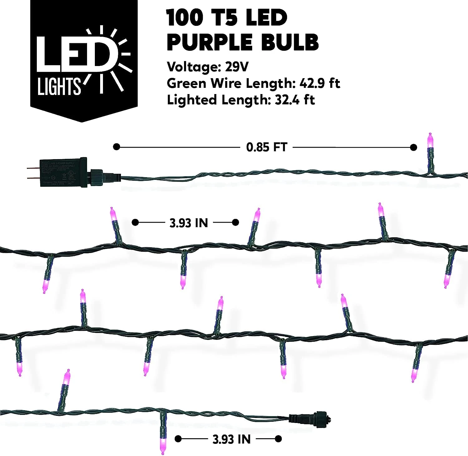 - Our Halloween LED String Lights has a total of 100 LED Purple T5 Bulbs with Green Wire. 29V. Total Lighted Length is 32.4 Feet. Total Wired Length is 42.9 Feet. Bulb Spacing 3.93 inches. Low Voltage.