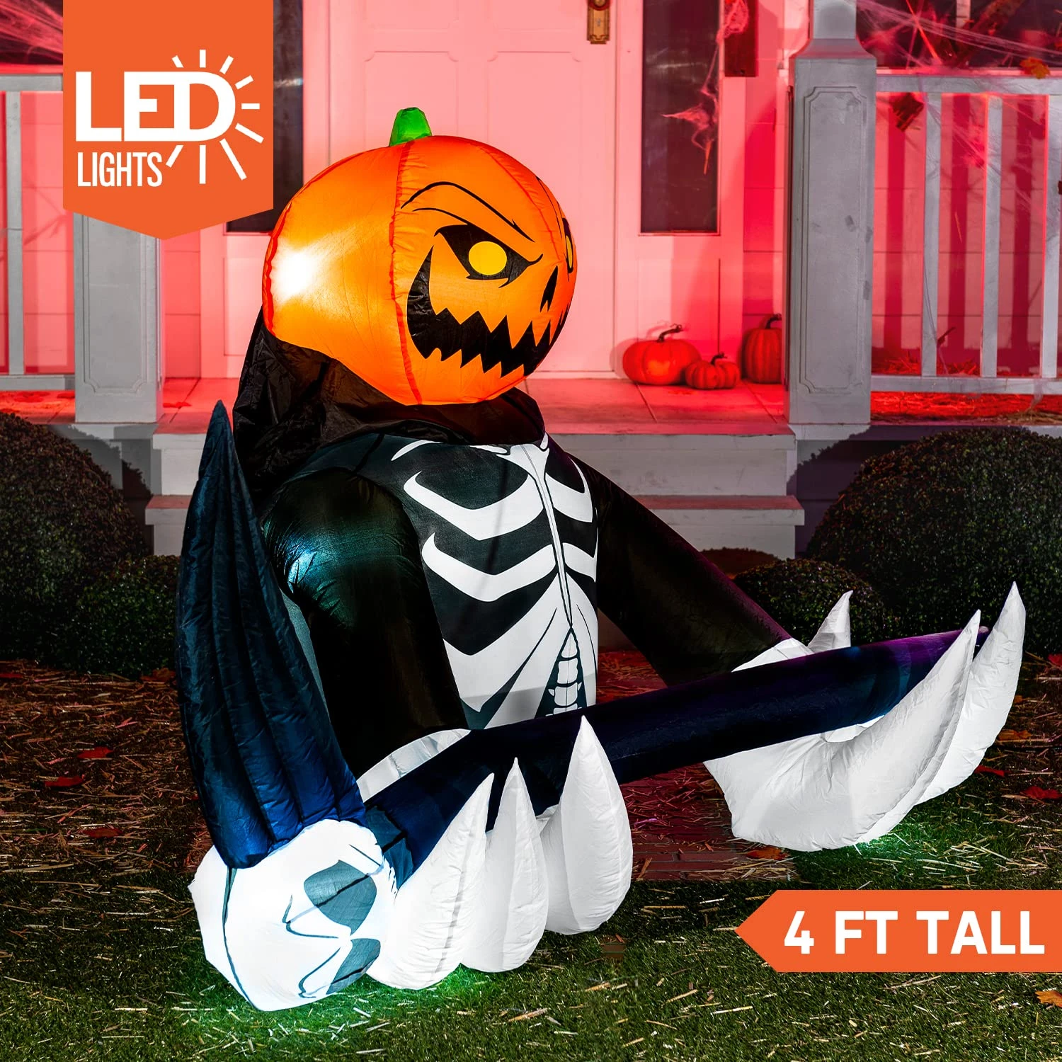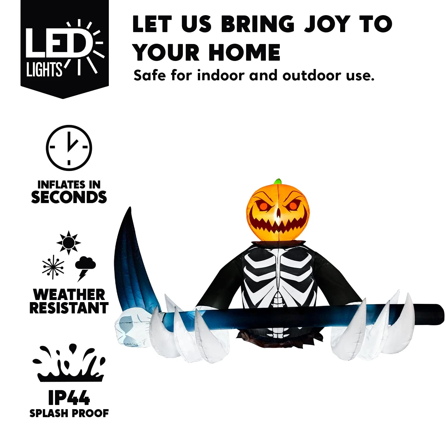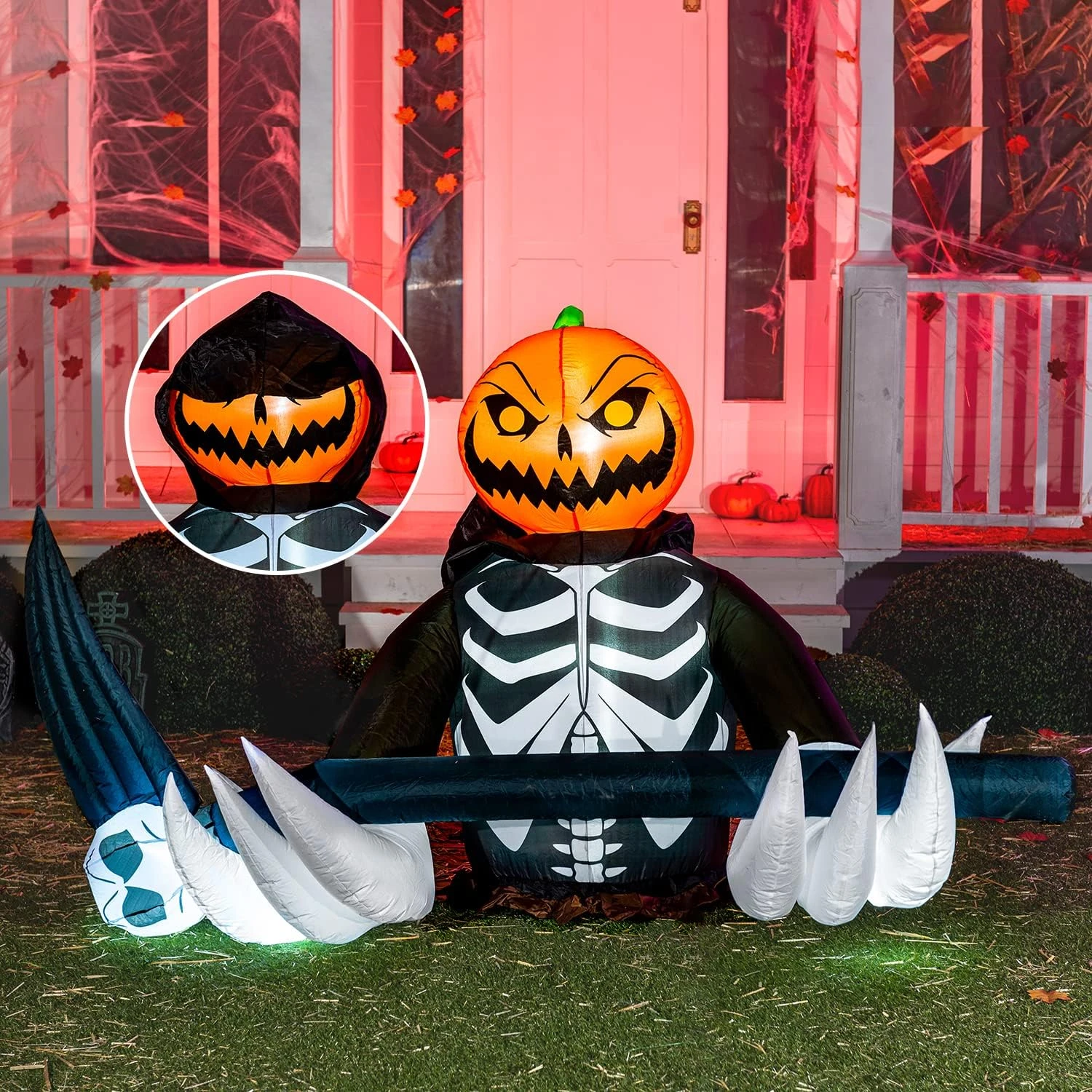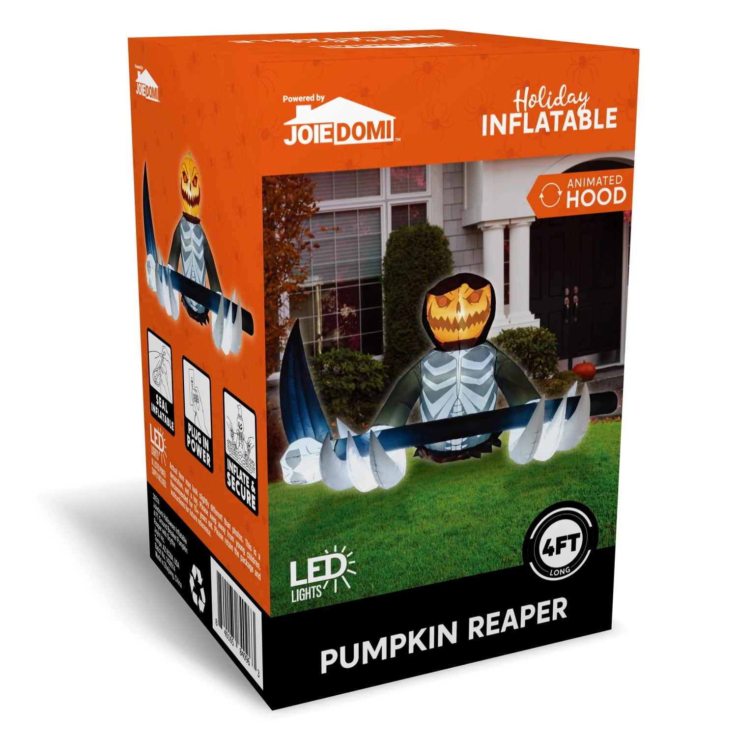 - Our 4 Feet tall ground breaker pumpkin reaper with scythe halloween inflatable comes with extended cords, ground stakes, fastened ropes, built-in sandbags, and a plug with UL certification.