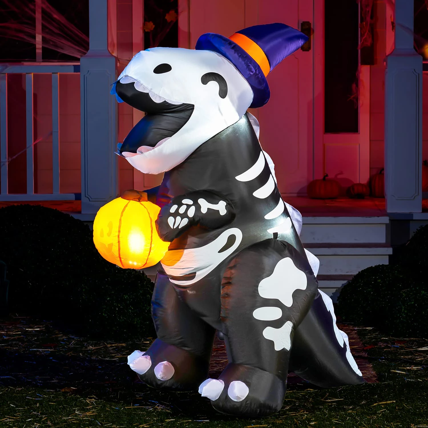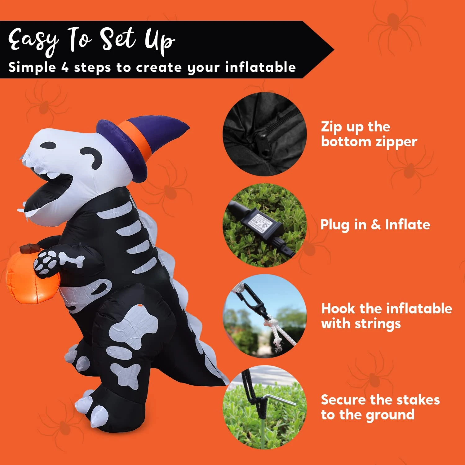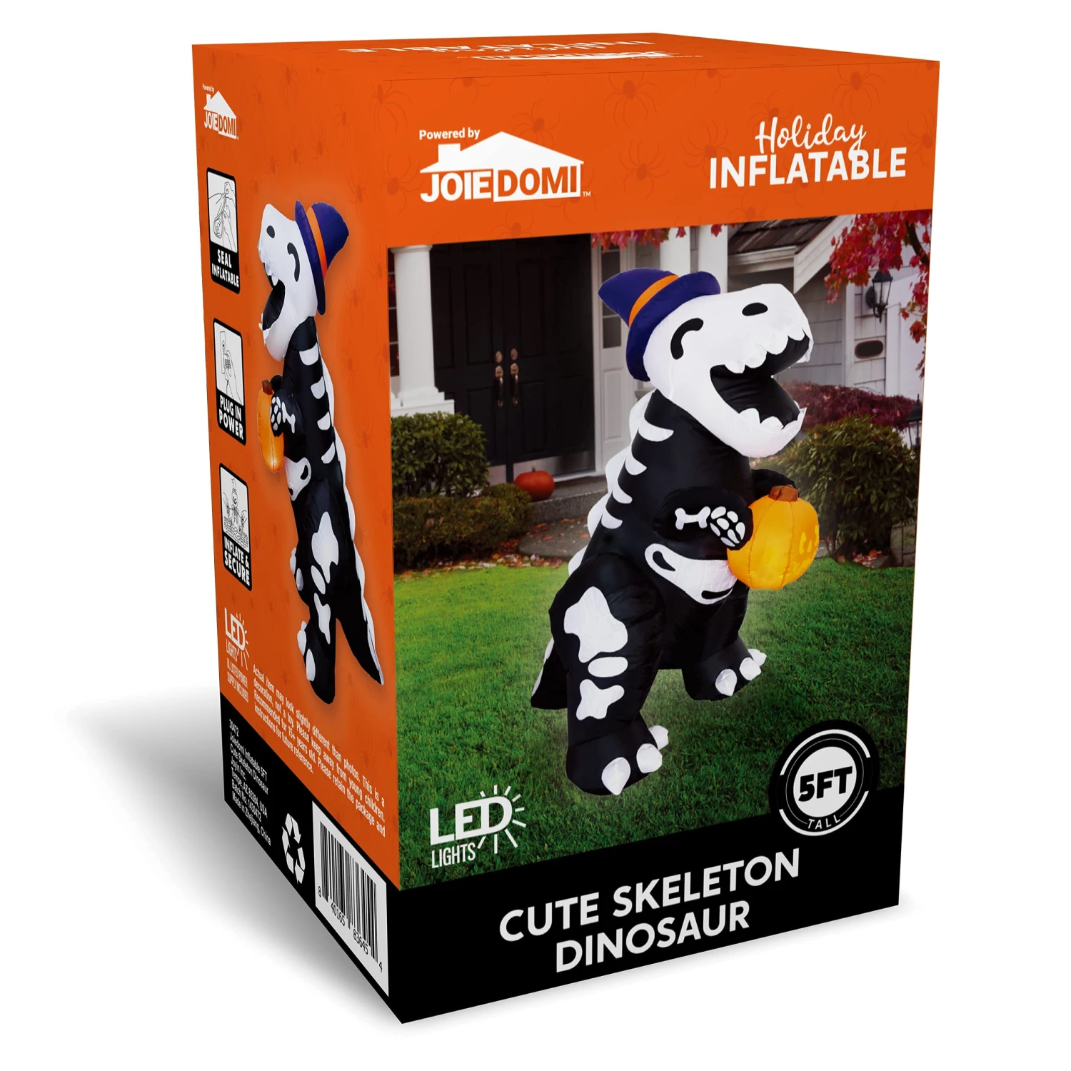 - Our 5 Feet tall cute skeleton dinosaur inflatable comes with extended cords, ground stakes, fastened ropes, built-in sandbags, and a plug with UL certification.