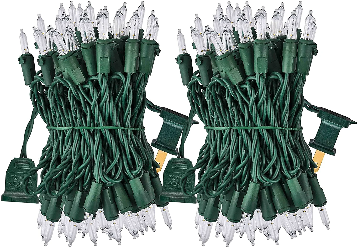 - Our 52.5 FT 200 Count Christmas Clear Green Wire. Conventional household power supply 120 volts 9.6 watts. 22 sets can be connected end to end with 4 extra bulbs 2 fuses included.