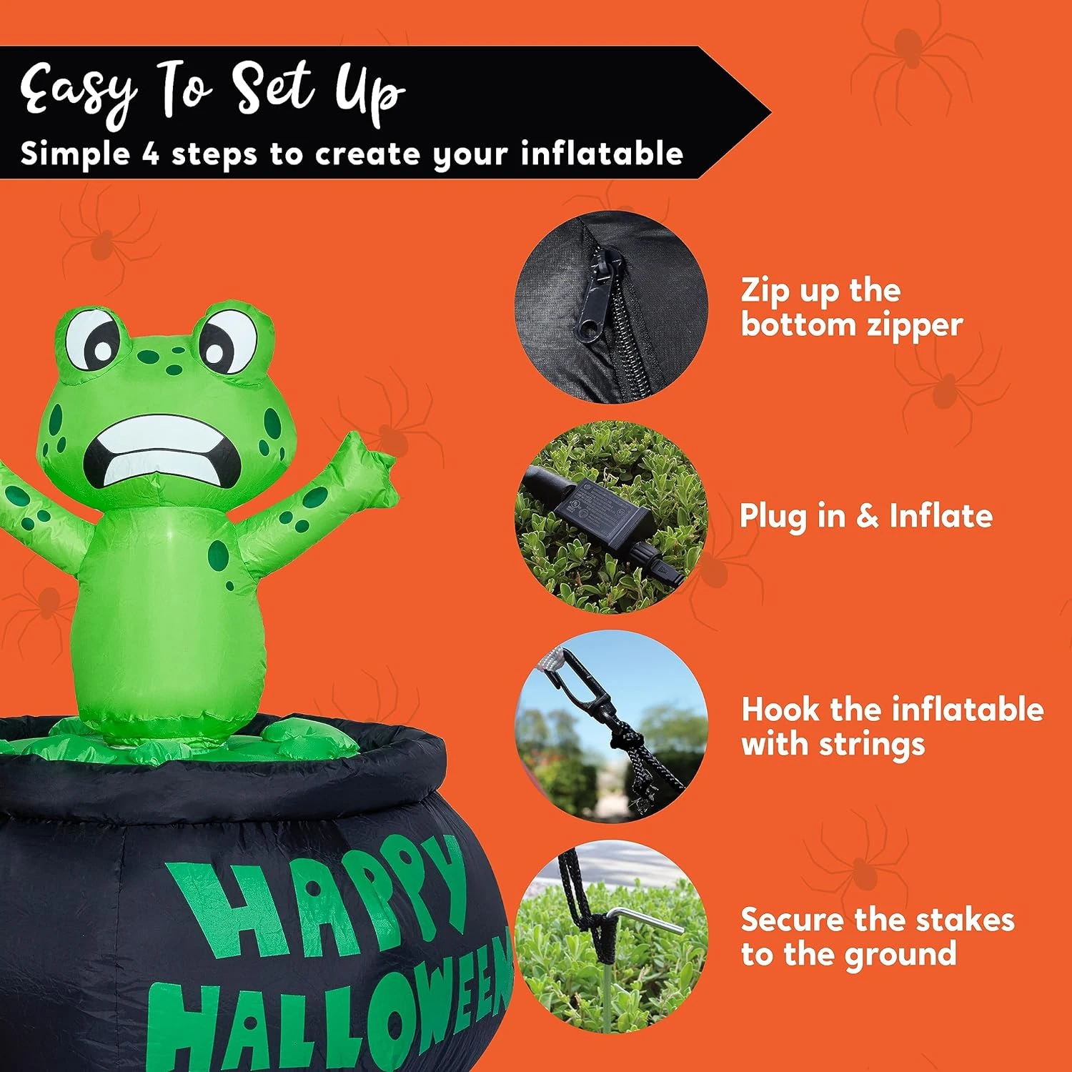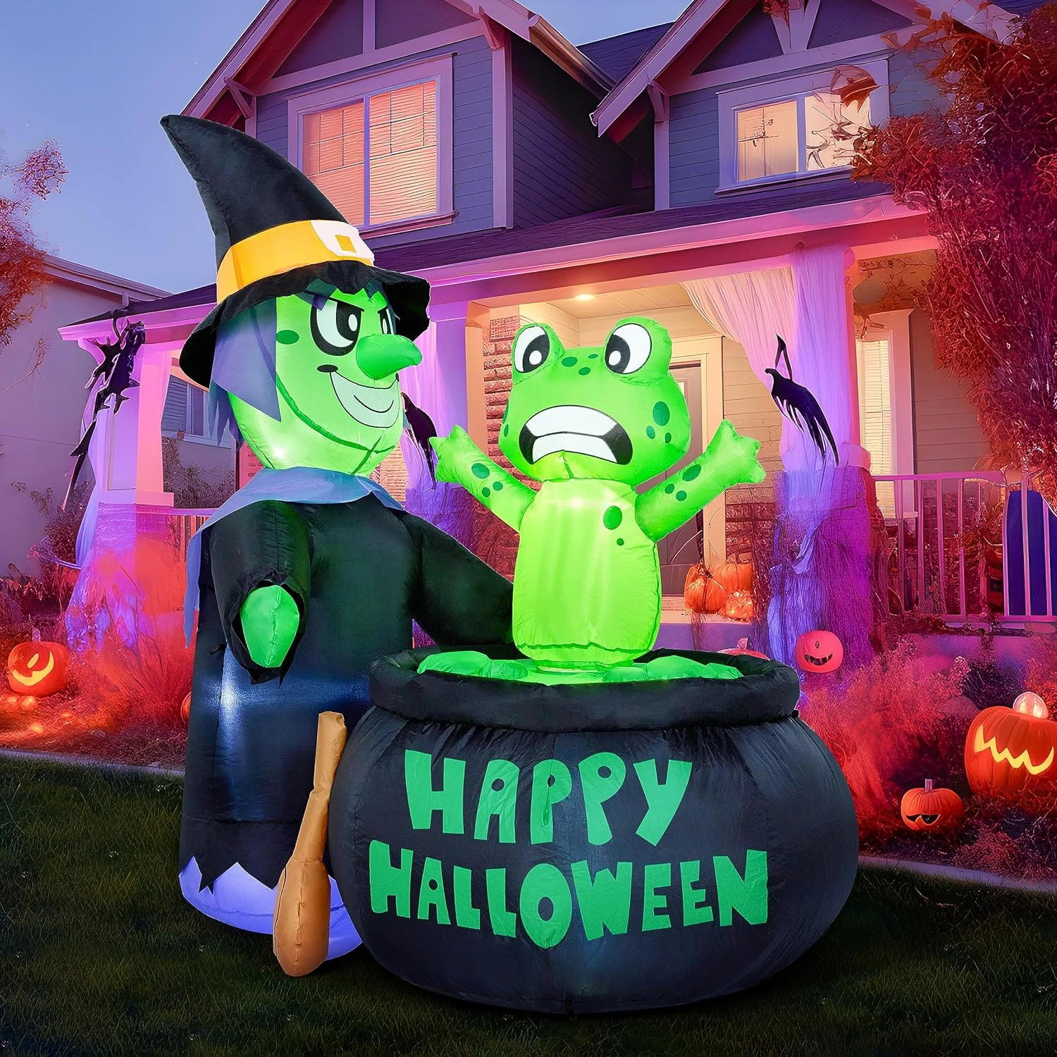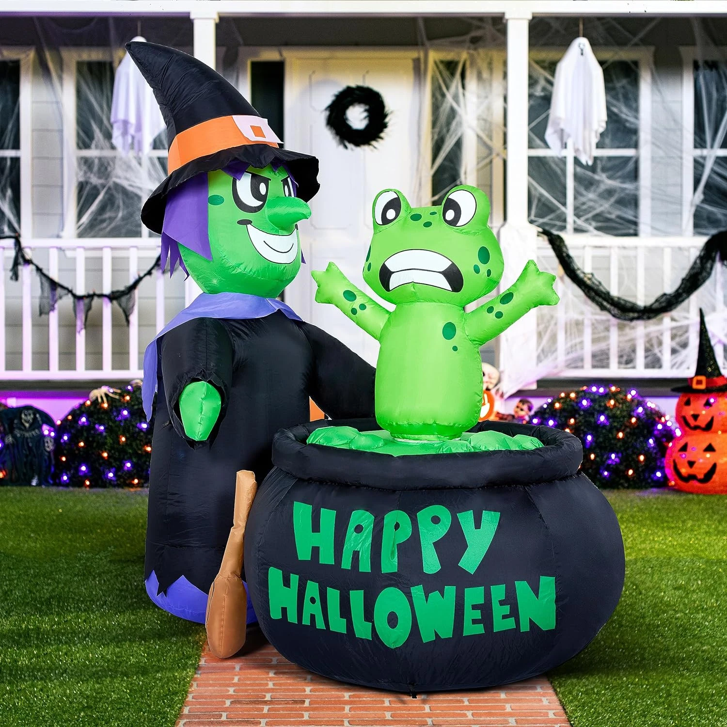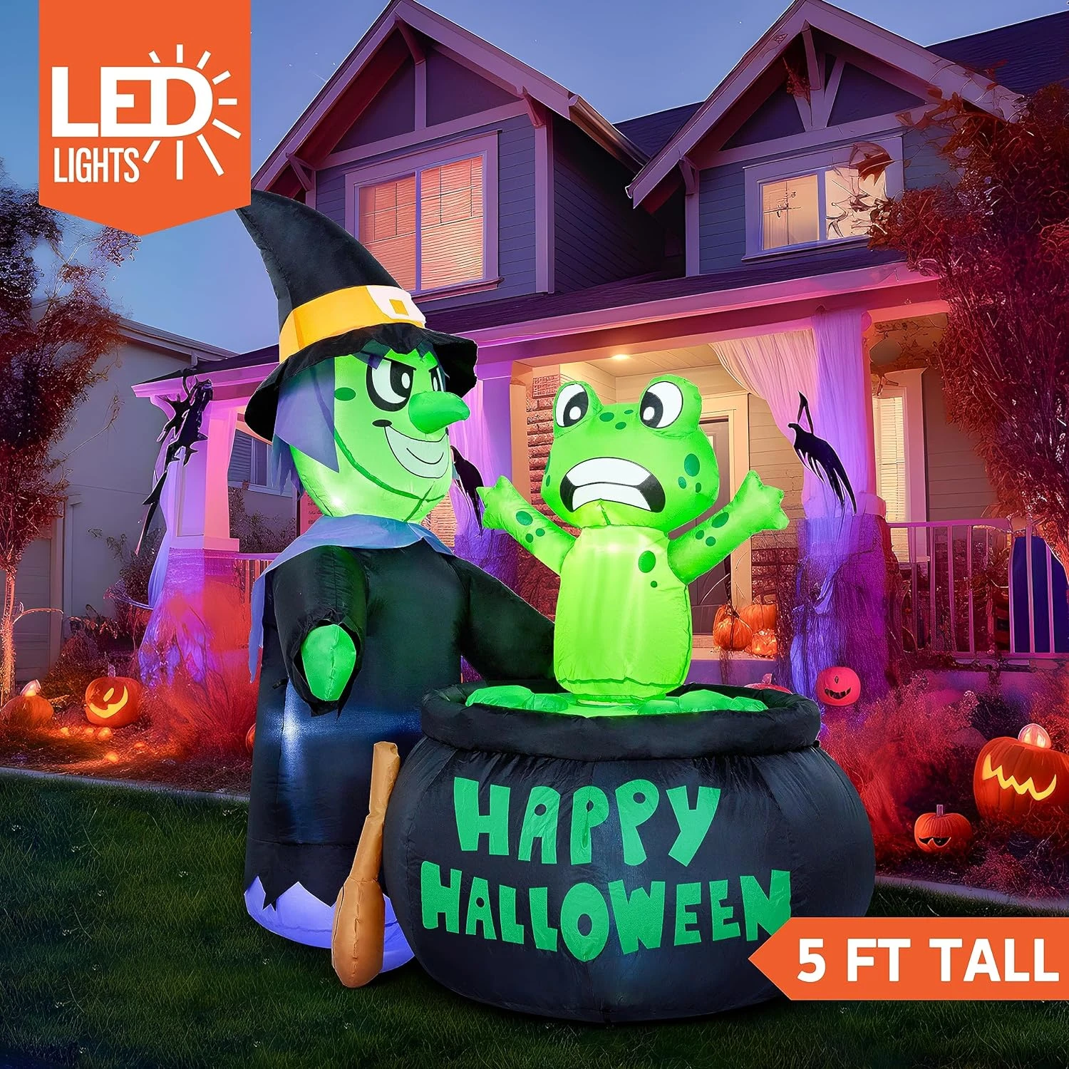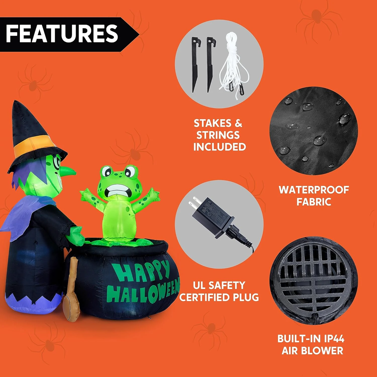 Perfect Design: This 5ft halloween inflatable witch with a frog and cauldron features a perfect design. The spinning frog also adds a scary atmosphere to Halloween. This inflatable comes with an extended cord, ground stakes, fastened ropes, built-in sandbags, and a plug with UL certification.