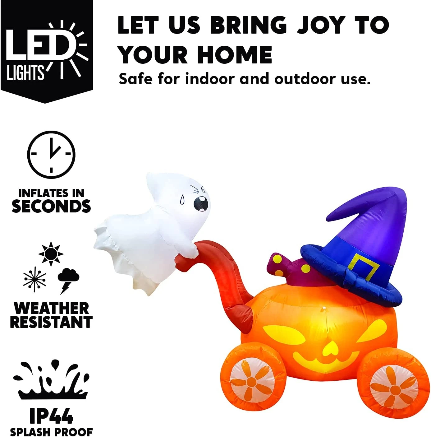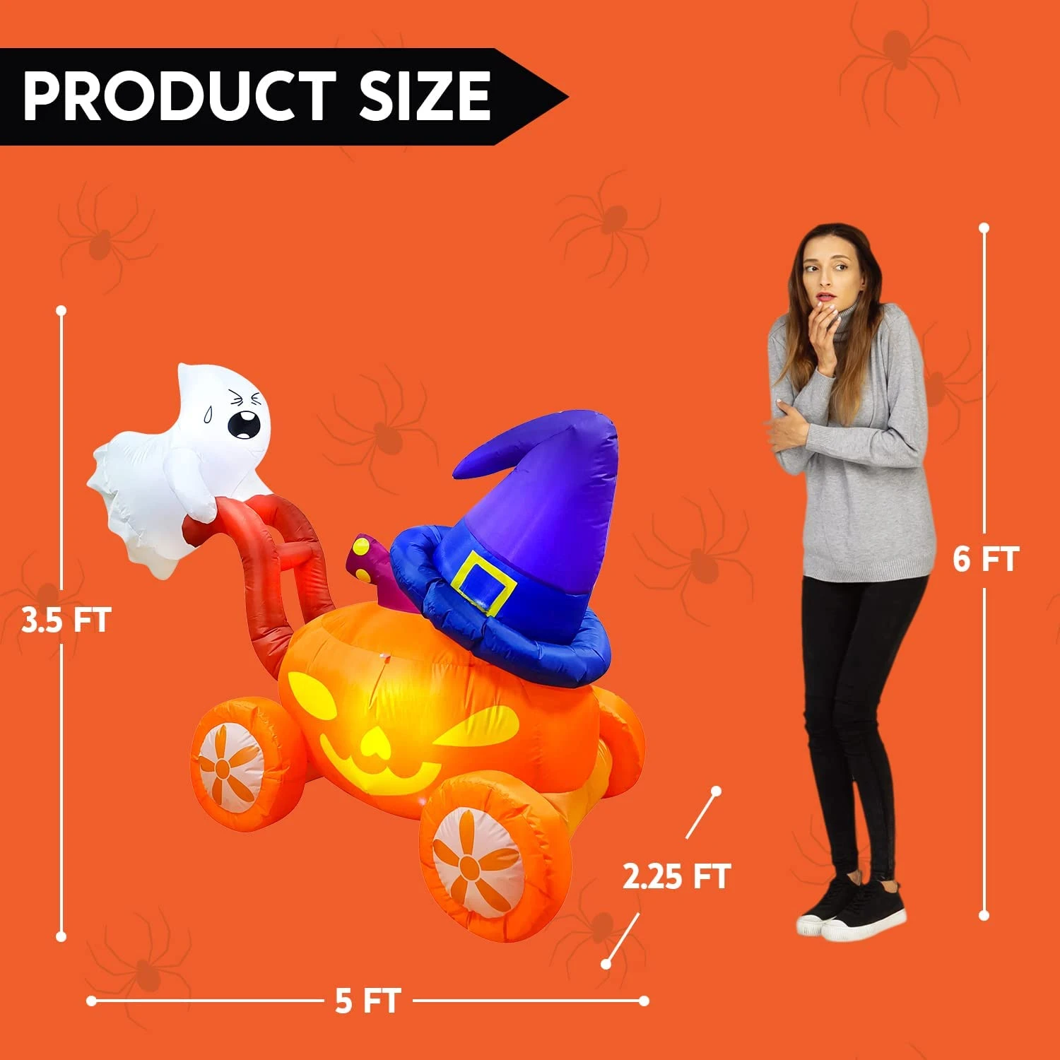 - Our 5 Feet long cute long Halloween pumpkin carriage with a witch hat with a hanging ghost pushes pumpkin carriage comes with extended cords, fastened ropes, built-in sandbags, and a plug with UL certification.