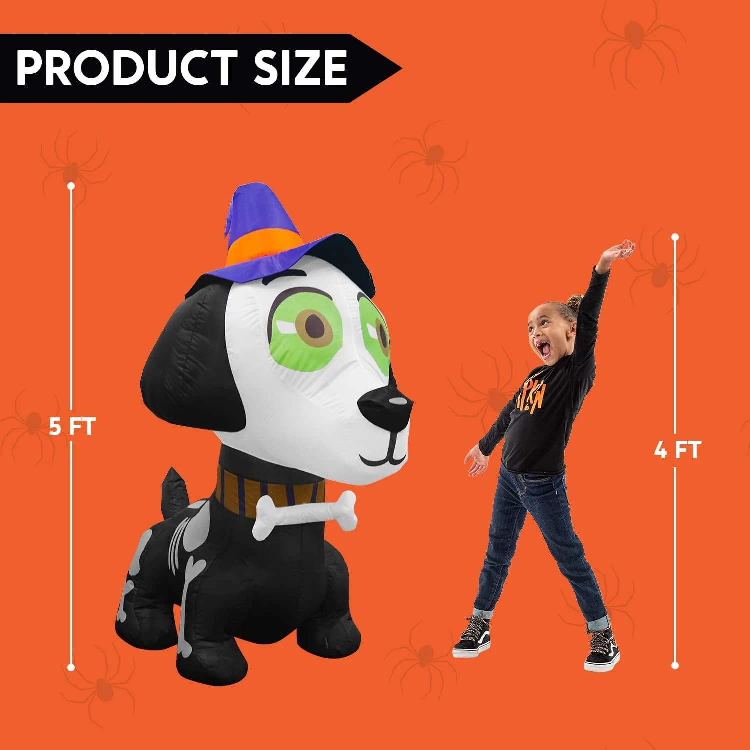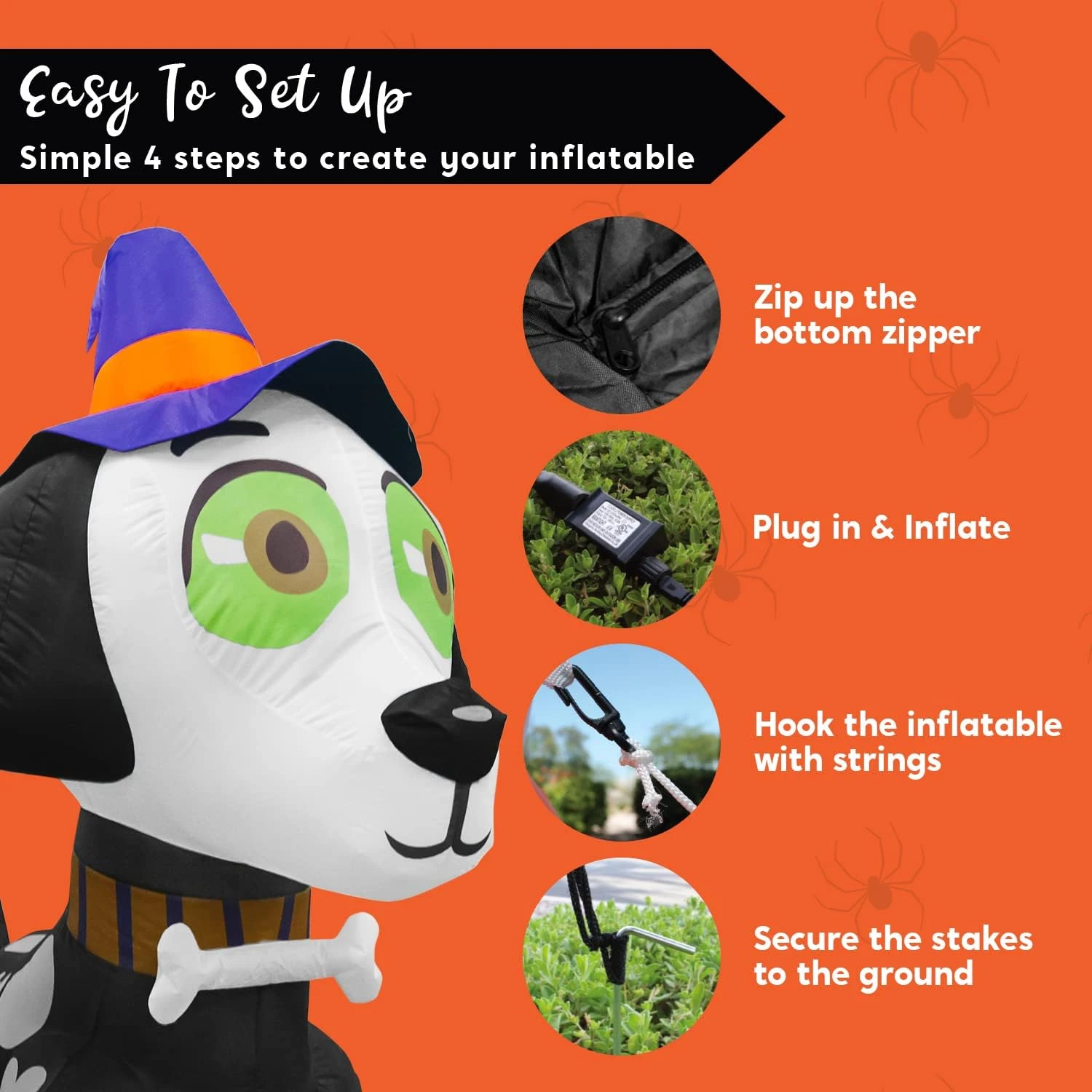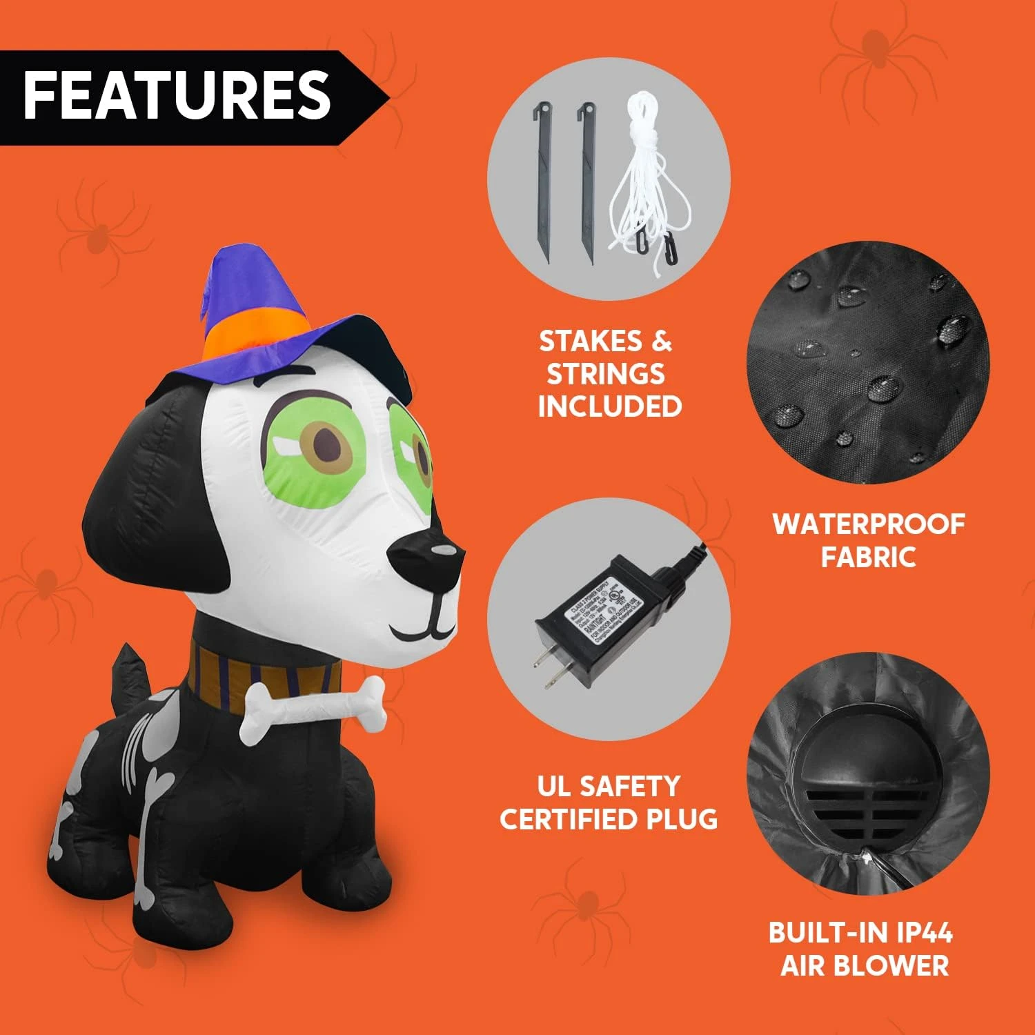 - Our 5 feet tall witch hat skeleton dog inflatable comes with extended cords, ground stakes, fastened ropes, built-in sandbags, and a plug with UL certification.