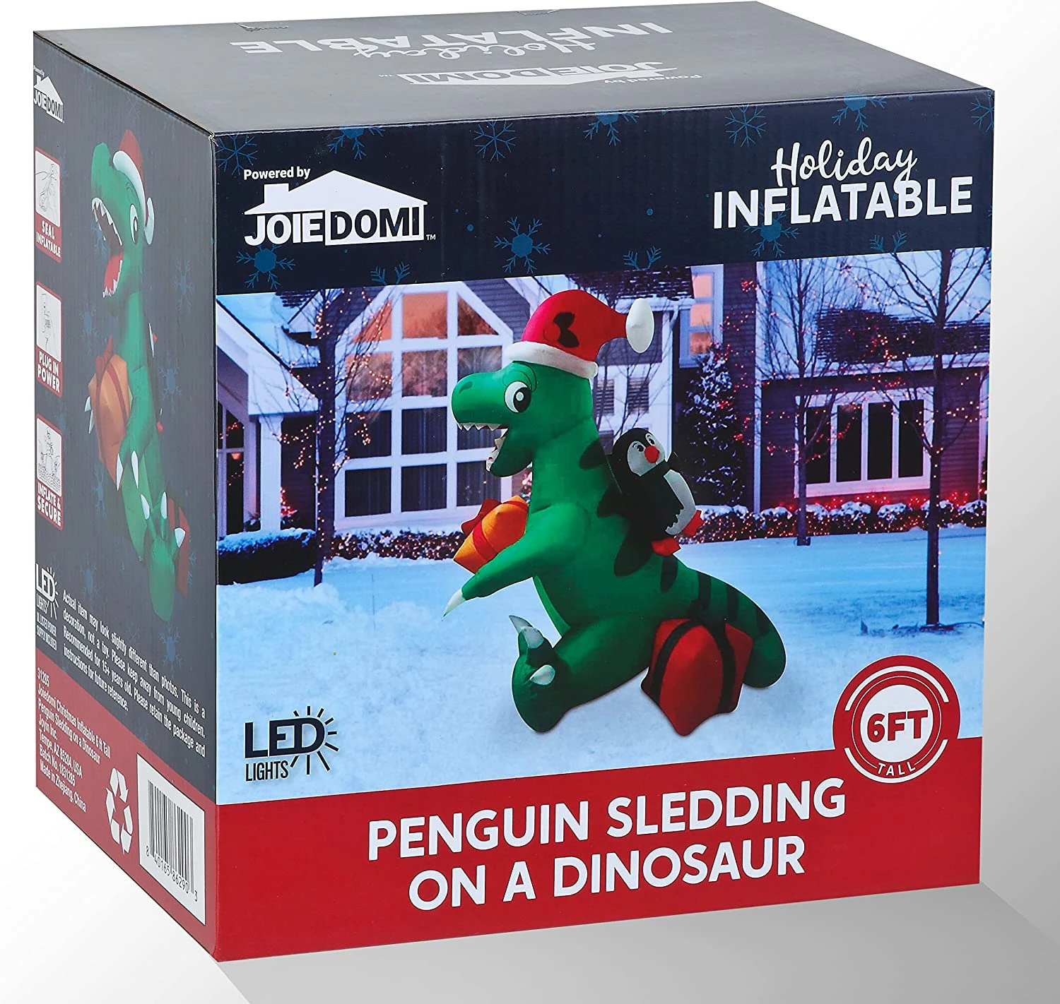 - Our 6 feet tall penguin sledding on a dinosaur inflatable comes with an extended cord, ground stakes, fastened ropes, built-in sandbags, and a plug with ul certification.