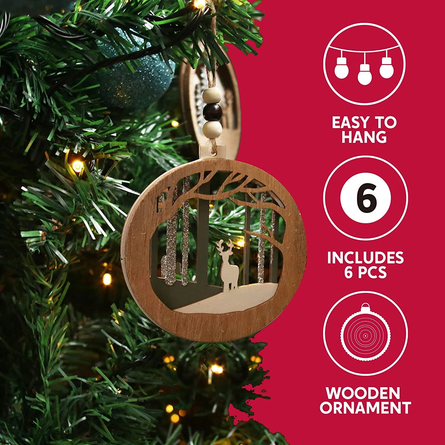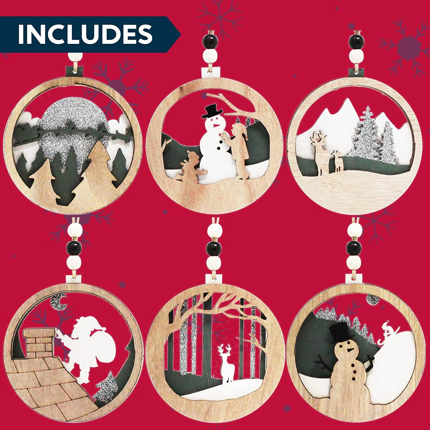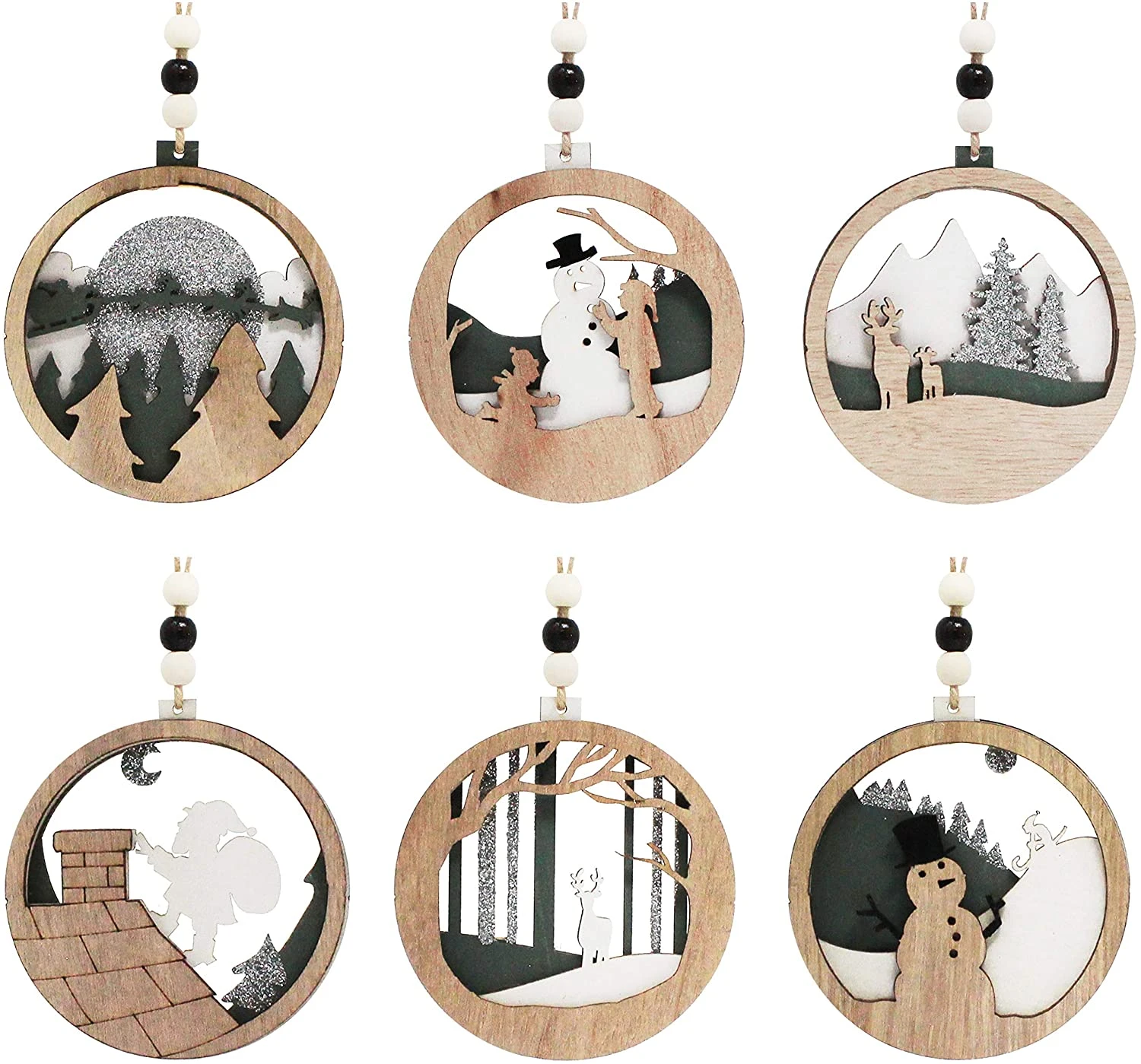 - COMPREHENSIVE SET. Our Christmas Ornament Set includes 6 designs of Christmas Wooden Hanging Ornaments, 2 Snowman, 2 Reindeer, 1 Santa Climbing Chimney, 1 Santa with Reindeer Sleigh. The hanging wooden ornaments are made of natural wood and glitter to make it look classy. Perfect for Christmas Tree Indoor/Outdoor decorations.