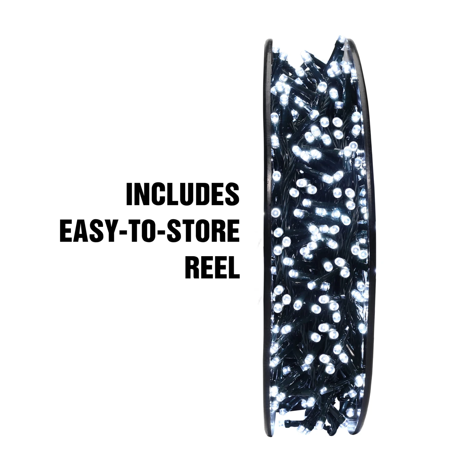 - Our LED string Christmas lights have 600 bright cool white LED bulbs with green wire. Lighted length of 98.3 feet. Features 8 lighting modes. Low voltage.