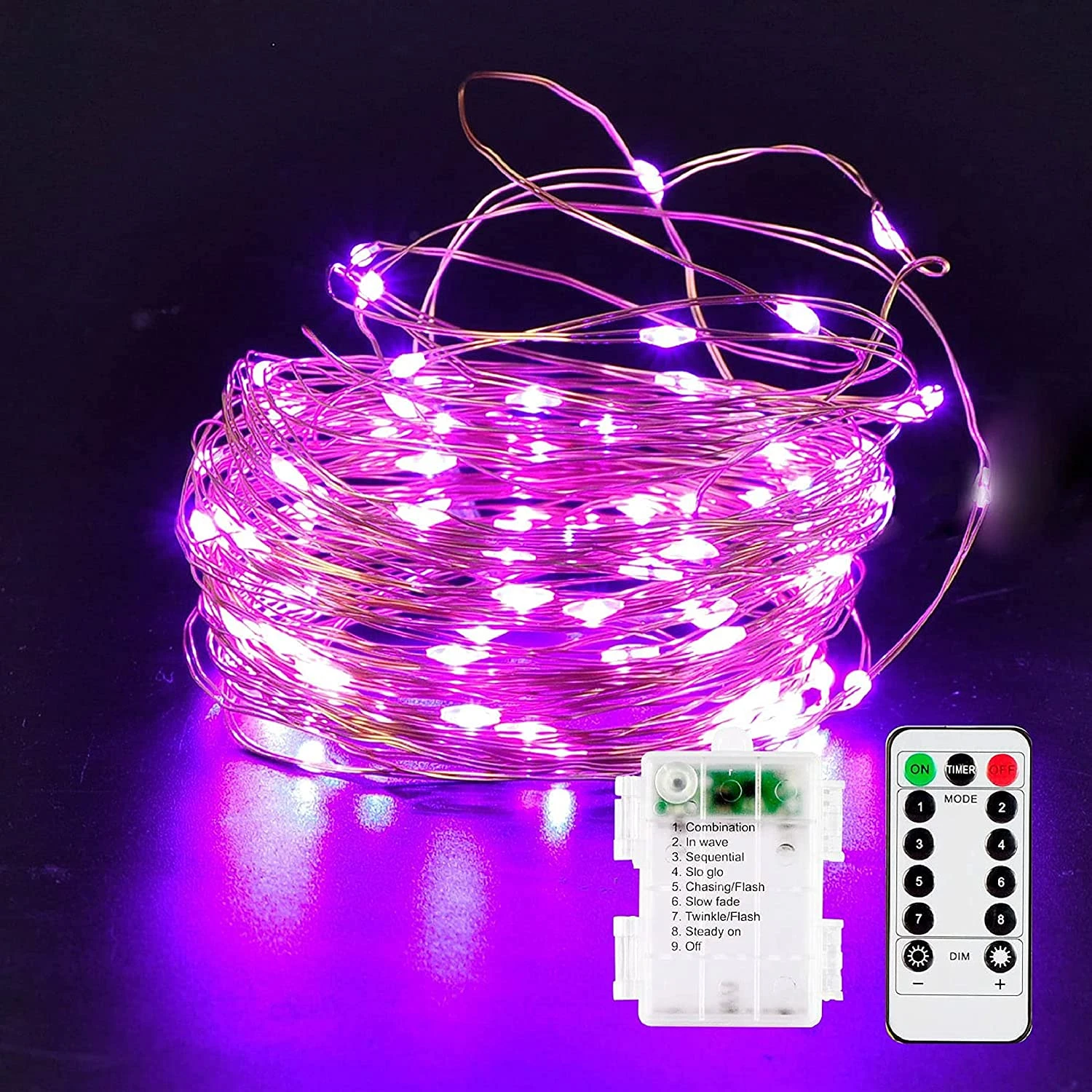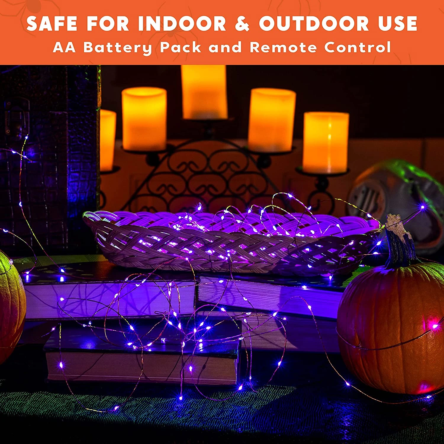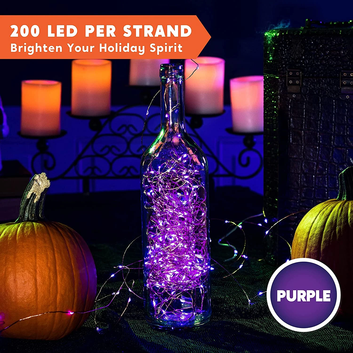 - Our Halloween LED Net Lights have a total of 100 LED Purple Bulbs with Copper Wire. 2W 3V. Total Lighted Length is 32.8 Feet. Total Wired Length is 33.8 Feet. Bulb Spacing 3.93 inches. Remote control. Battery powered.