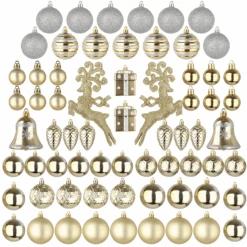 - Our Christmas ornament set includes 19 shiny balls, 13 matte balls, 8 glitter balls, 6 pine cones, 5 snowy balls, 5 swirls pattern balls, 4 diamond plaid balls, 2 gift boxes, 2 flying reindeer, 2 bells.