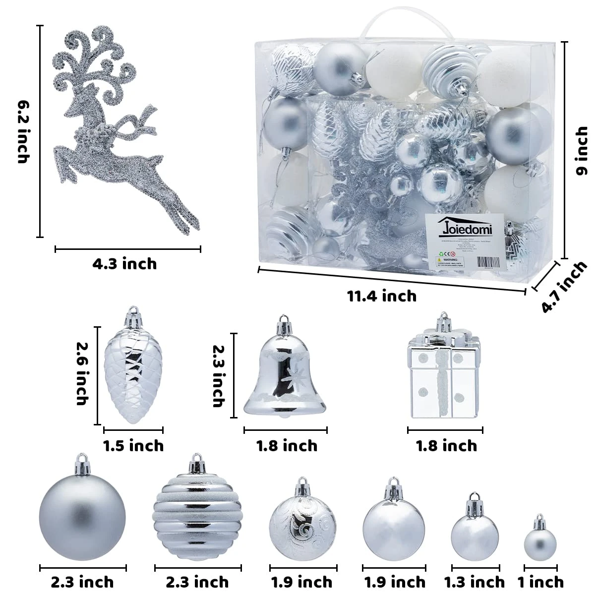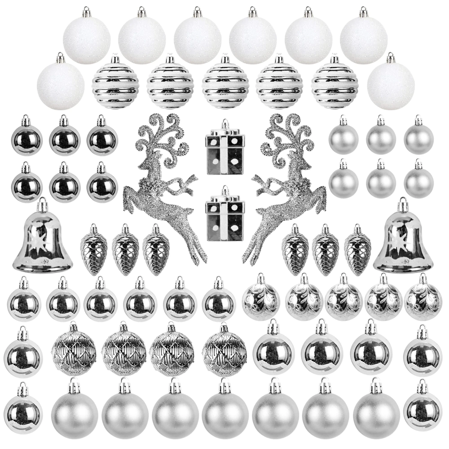 - Our Christmas ornament set includes 19 shiny balls, 13 matte balls, 8 glitter balls, 6 pine cones, 5 snowy balls, 5 swirls pattern balls, 4 diamond plaid balls, 2 gift boxes, 2 flying reindeer, 2 bells.