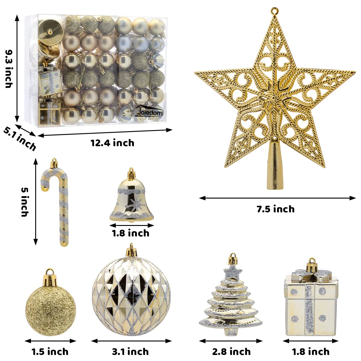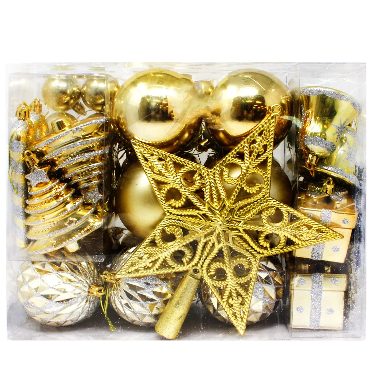 - Our Christmas ornament set includes 12 glitter balls, 12 shiny balls, 6 matte balls, 6 Christmas trees, 4 swirls balls, 4 bells, 4 gift boxes, 3 snowflake balls, 3 Christmas tree balls, 3 white snowflakes, 3 snowflakes, 3 diamond plaid balls, 2 candy canes, 1-star tree topper.