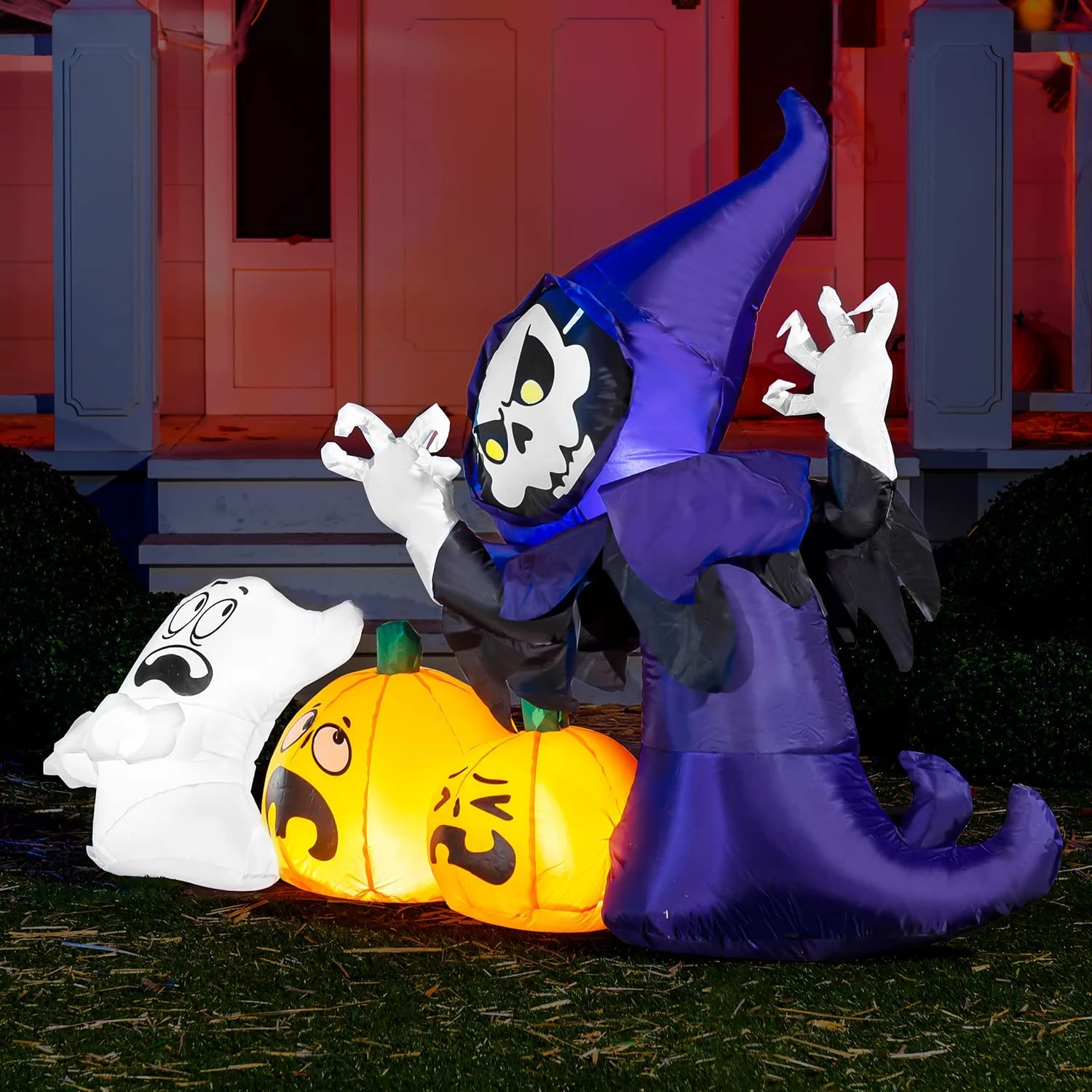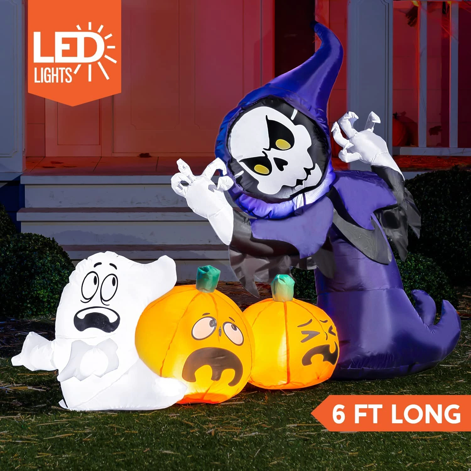 - Our 8 feet long Halloween Inflatable Ghost Grim Reaper comes with extended cords, fastened ropes, built-in sandbags, and a plug with UL certification.