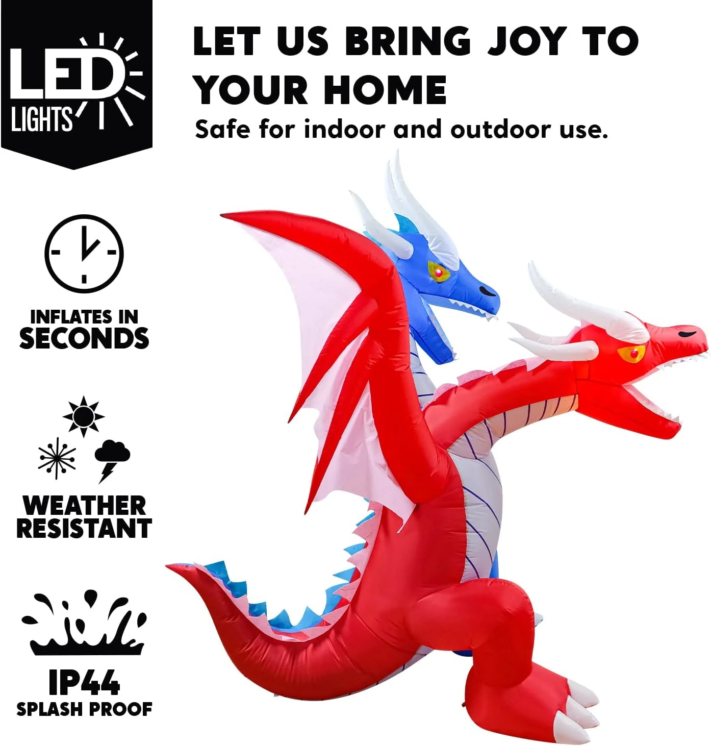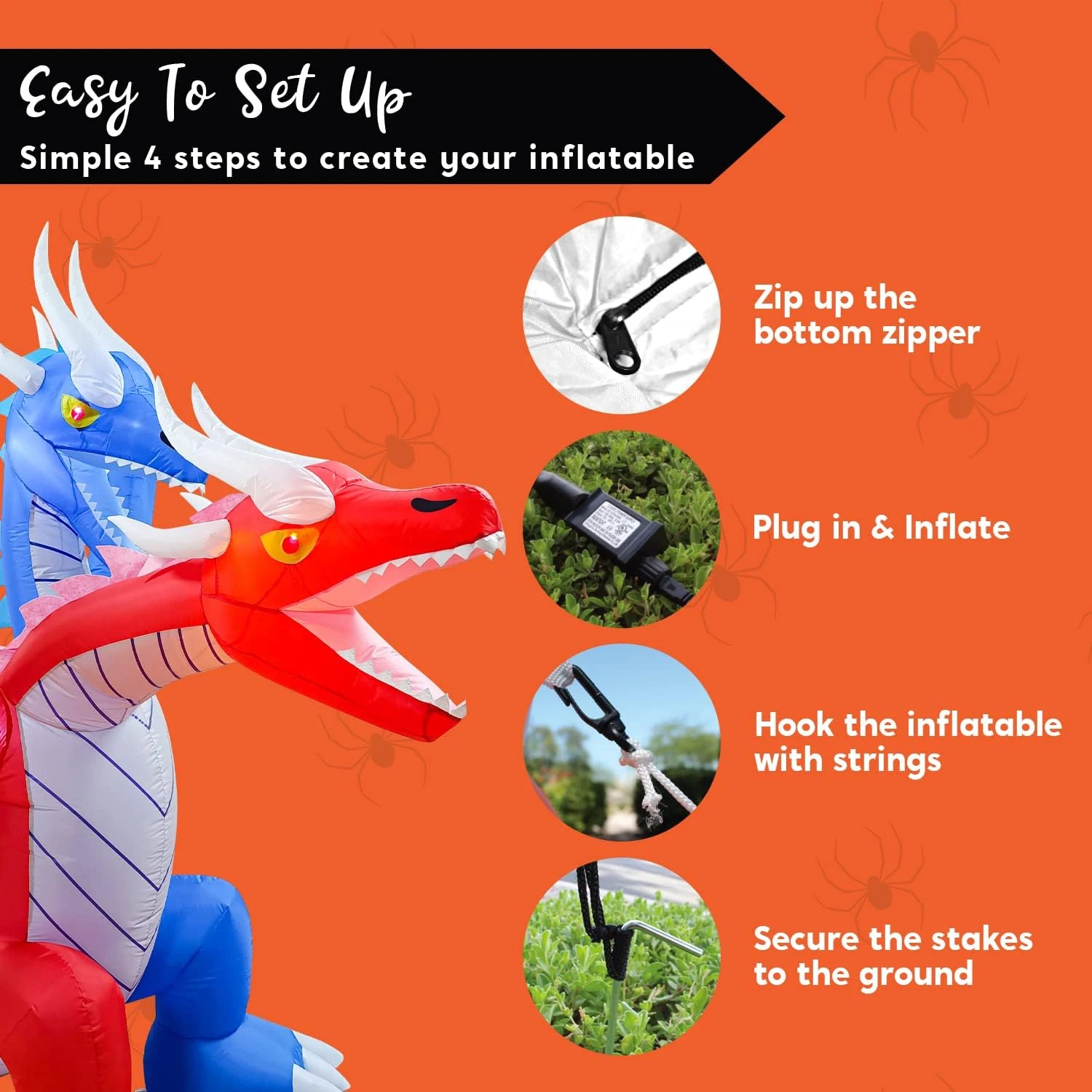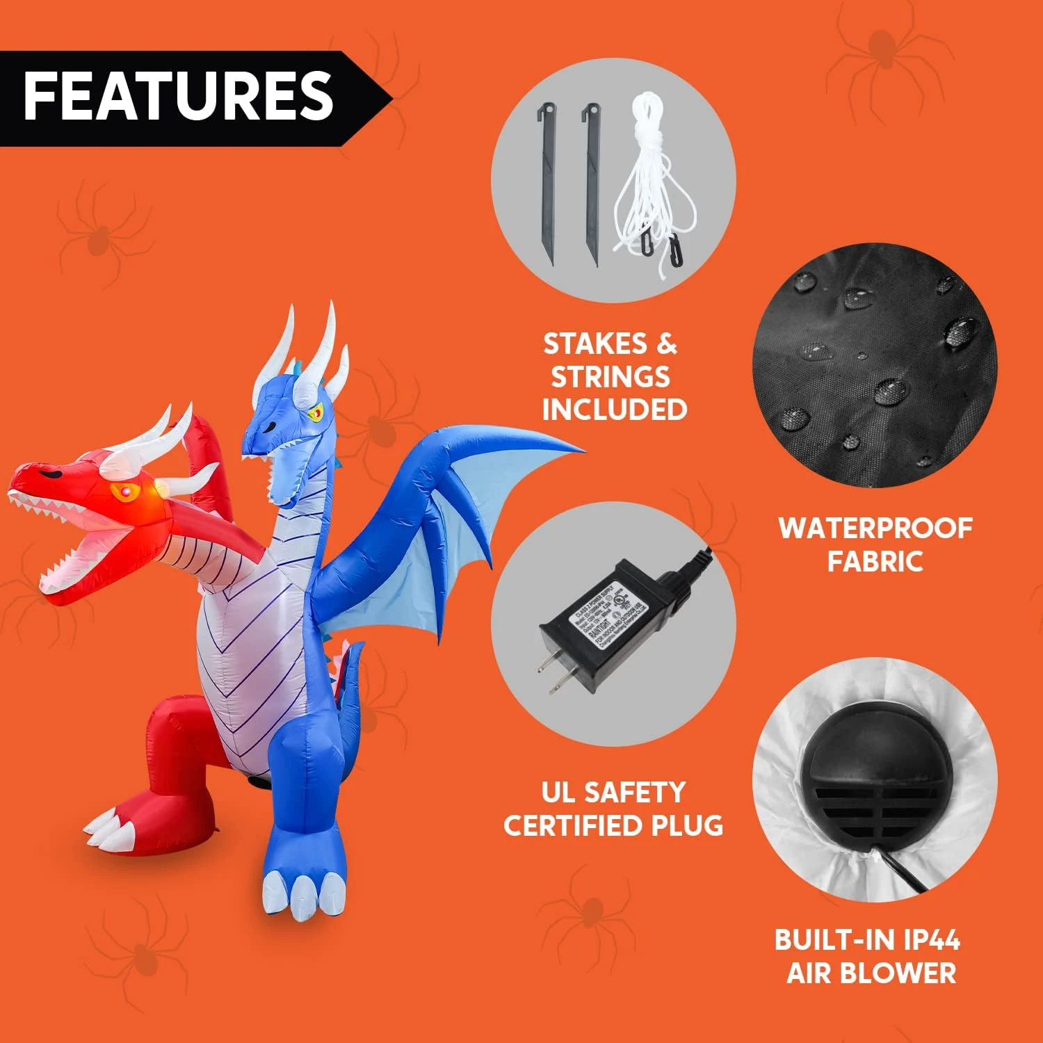 - Our 6 feet tall massive double headed dragon halloween inflatable comes with extended cords, ground stakes, fastened ropes, built-in sandbags, and a plug with UL certification.