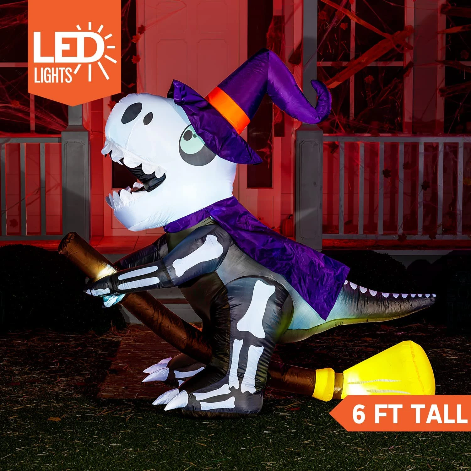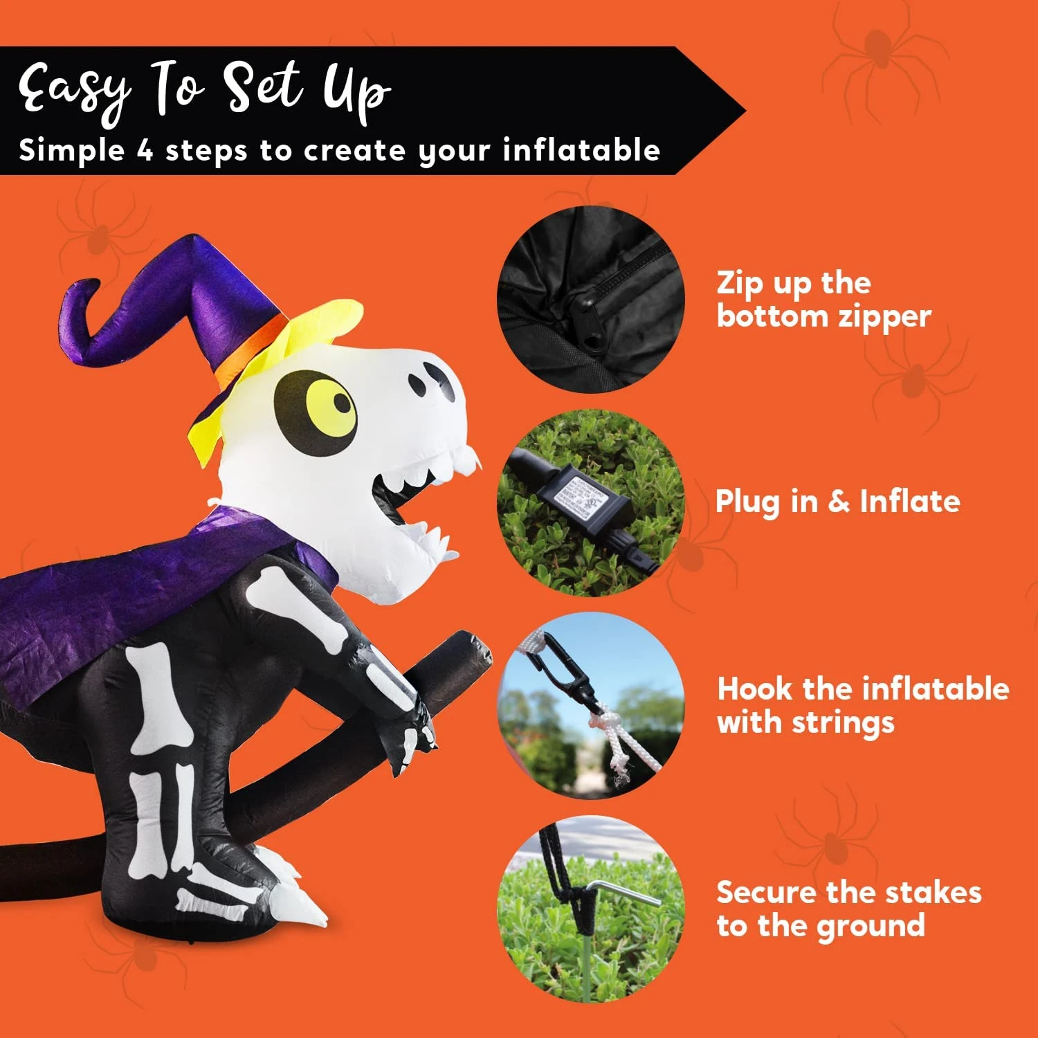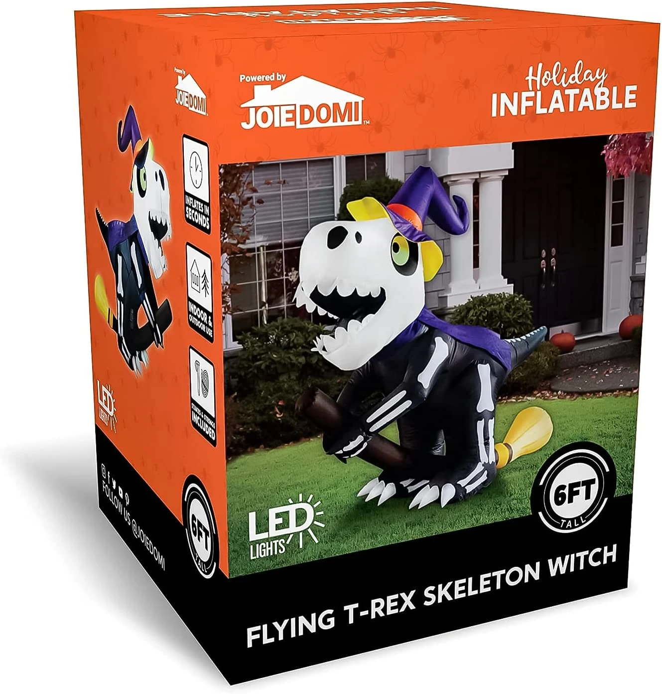 - Our 6 Feet tall skeleton flying witch T-rex inflatable comes with extended cords, ground stakes, fastened ropes, built-in sandbags, and a plug with UL certification.
