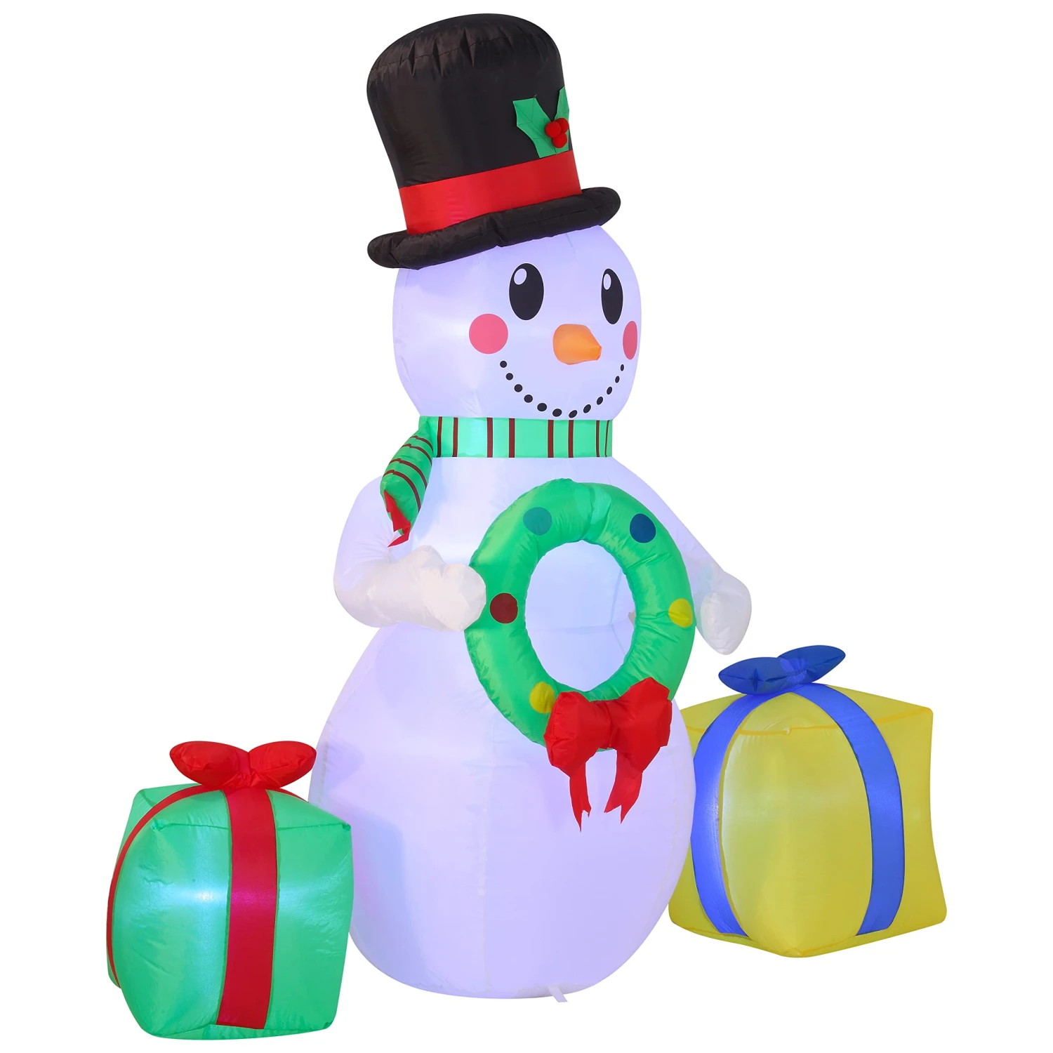 - 6 Feet Tall Snowman Holding A Christmas Wreath Inflatable comes with an extended cord, ground stakes, fastened ropes, built-in sandbags, and a plug with UL certification.