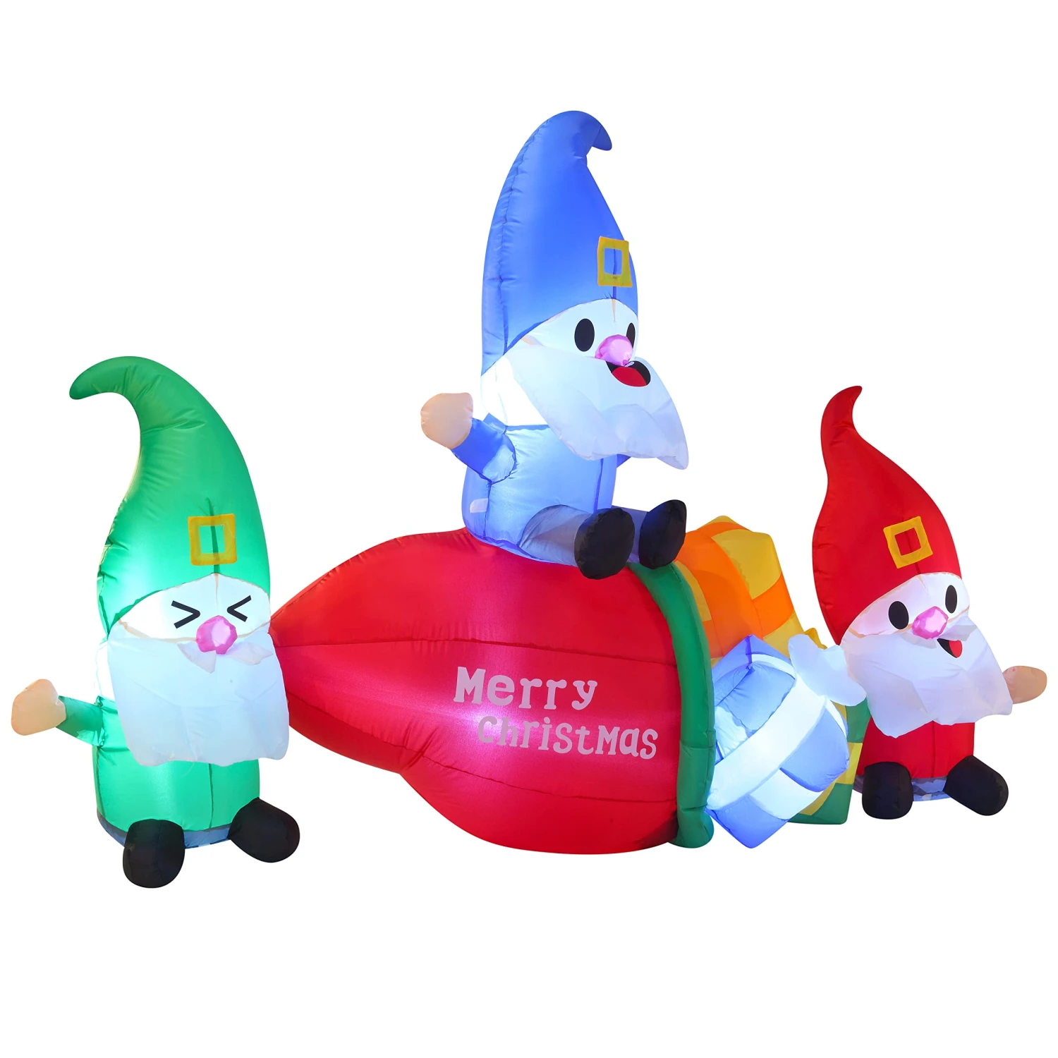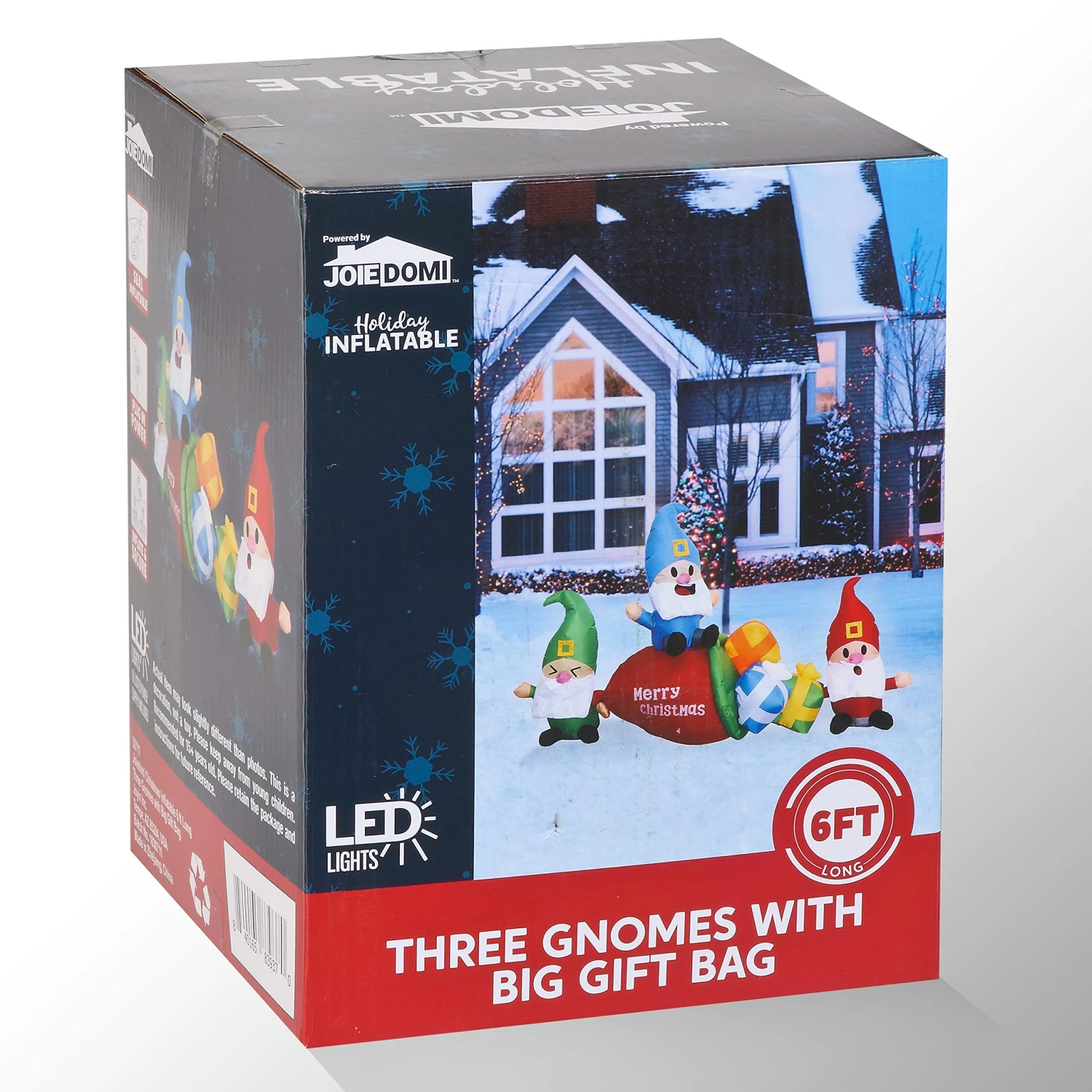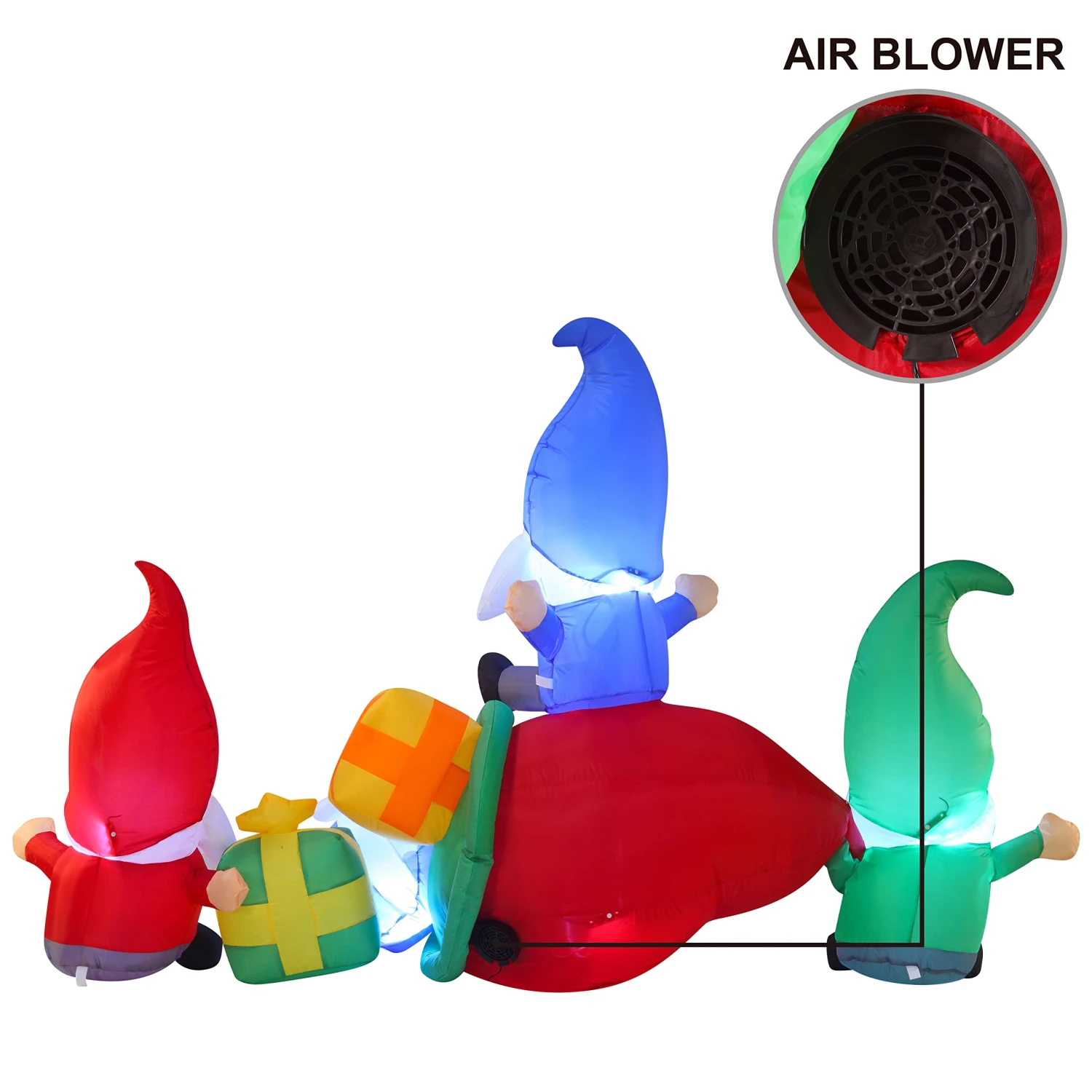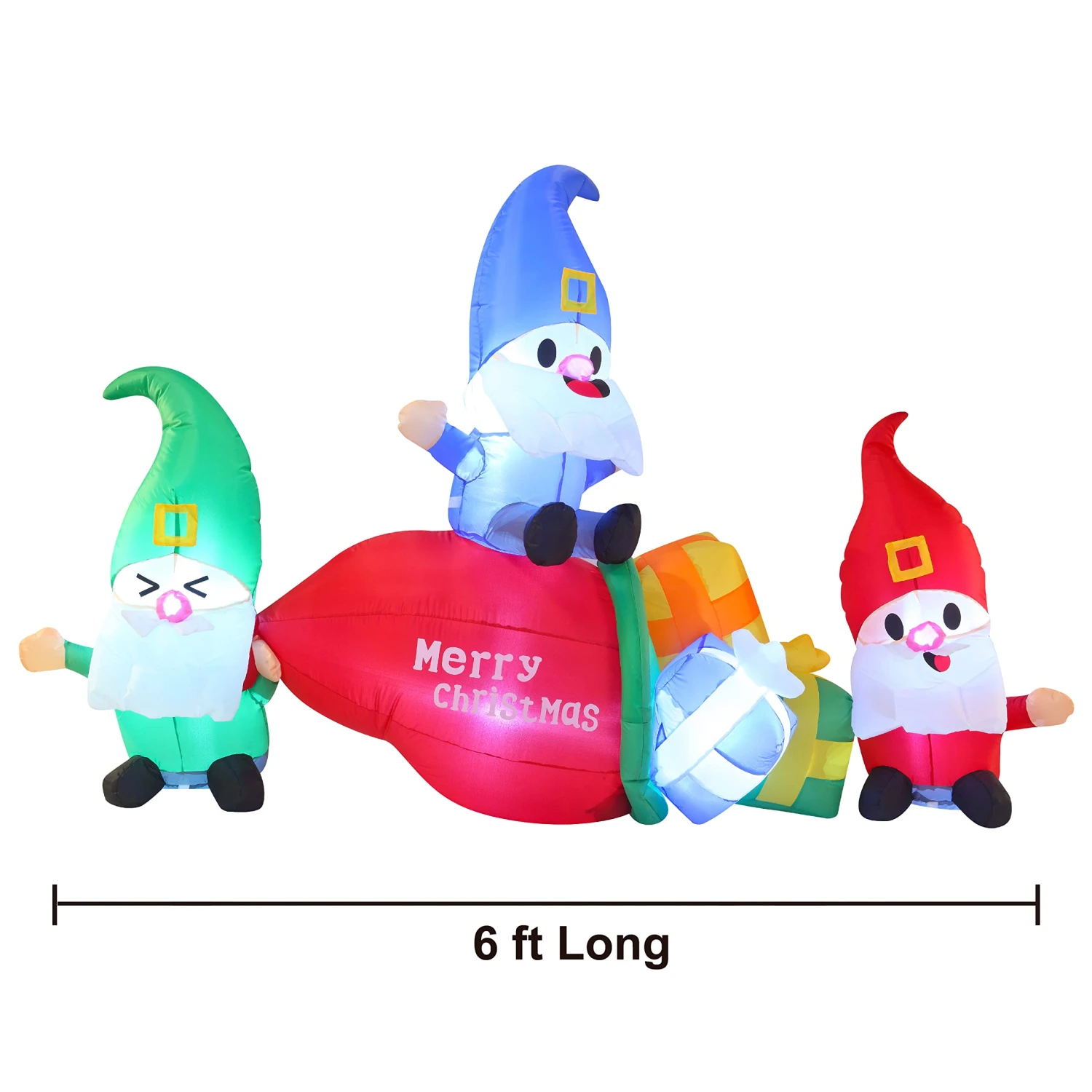 - 6 Feet Long Gnomes Gift Inflatable comes with an extended cord, ground stakes, fastened ropes, built-in sandbags, and a plug with UL certification.