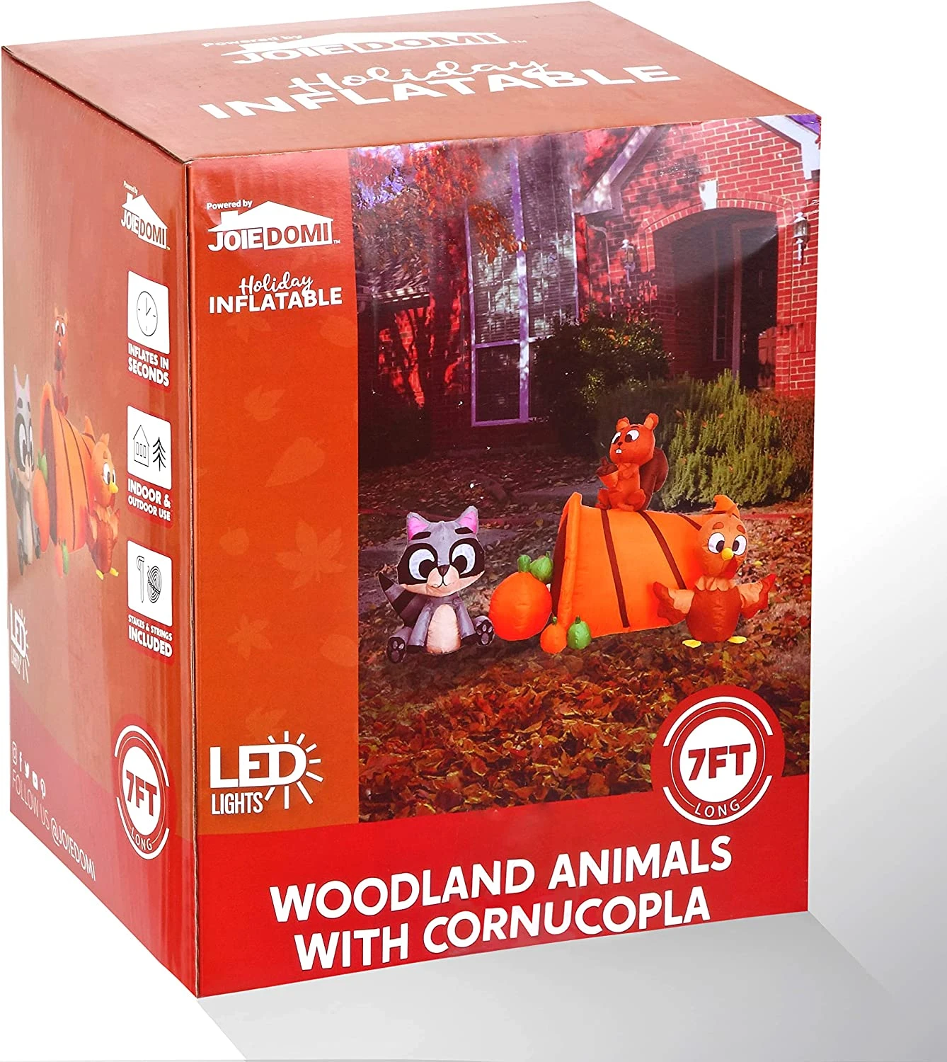 - 6 Feet Long Woodland Animals With Cornucopia Inflatable comes with an extended cord, ground stakes, fastened ropes, built-in sandbags, and a plug with UL certification.