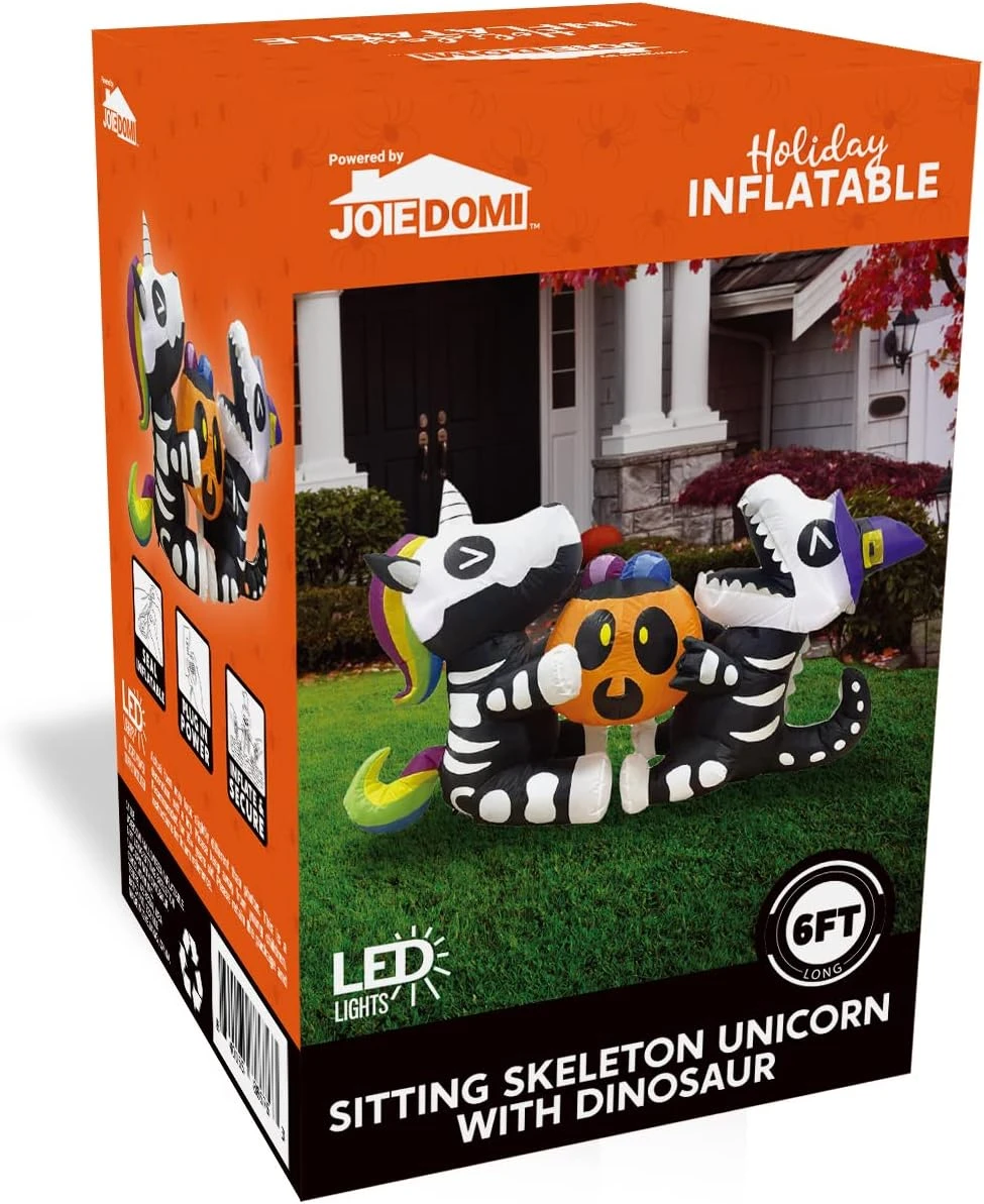 - Our 6 FT long sitting skeleton unicorn with dinosaur Halloween inflatable that comes with an extended cord, ground stakes, fastened ropes, built-in sandbags, and a plug with UL certification.