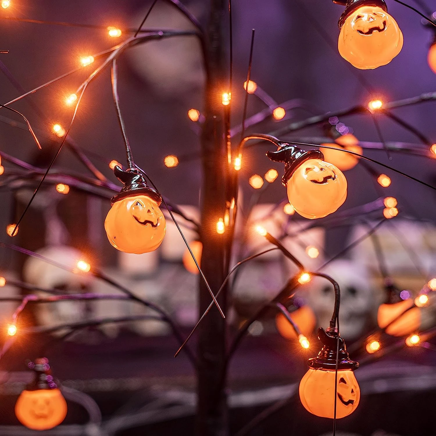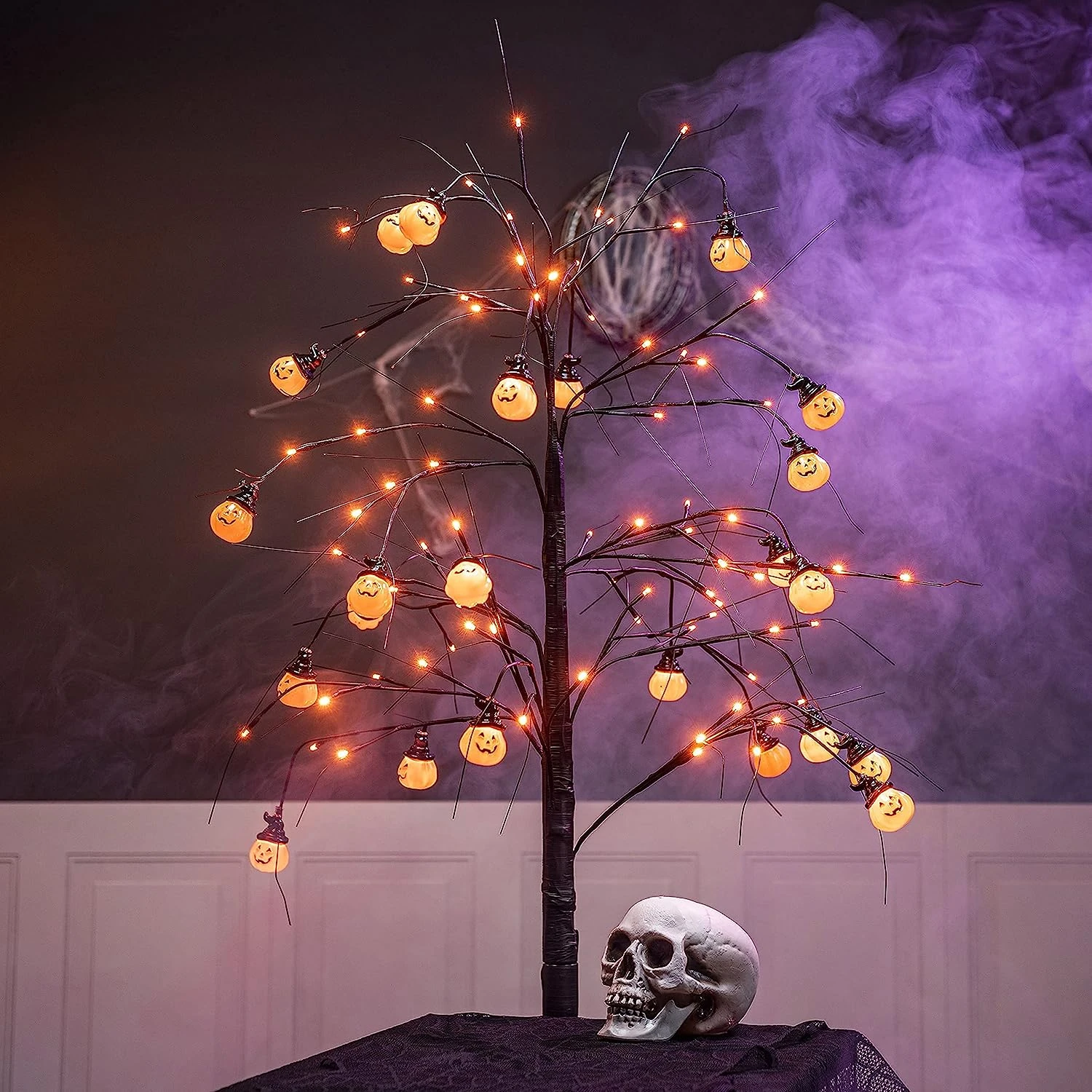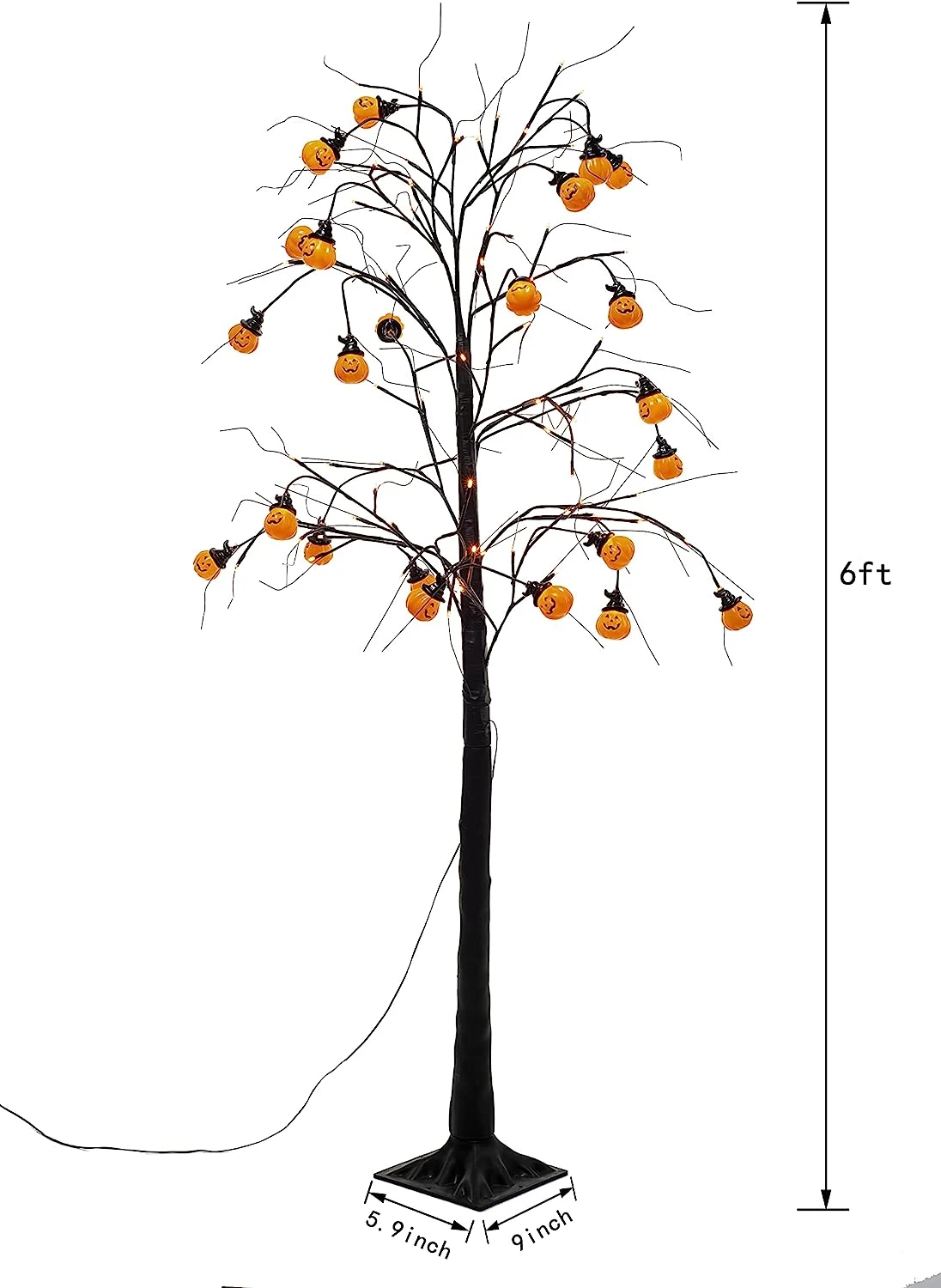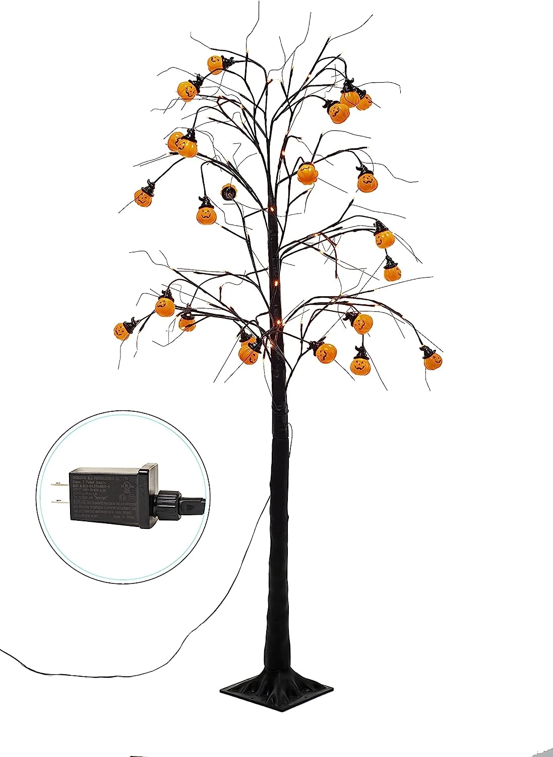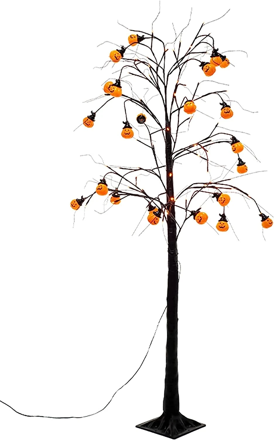- Our Halloween décor includes our glittered tree with 48 orange led lights and 24 pumpkin Halloween decorations that measures 6 ft. Lighted artificial tree with 120v input power for safe use. Branches and trees may be bent into whatever form you choose. You can make a variety of shapes using our tools.