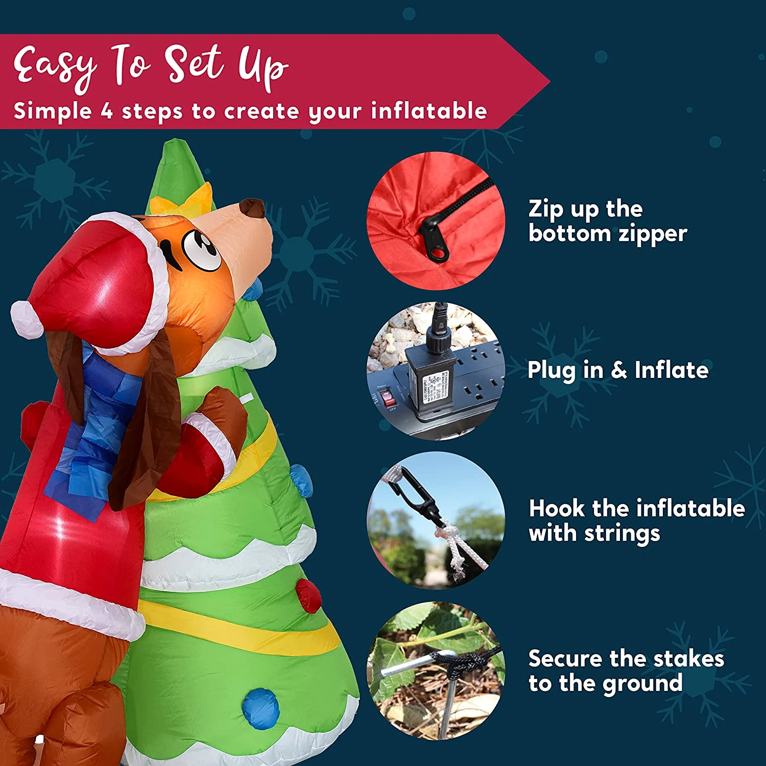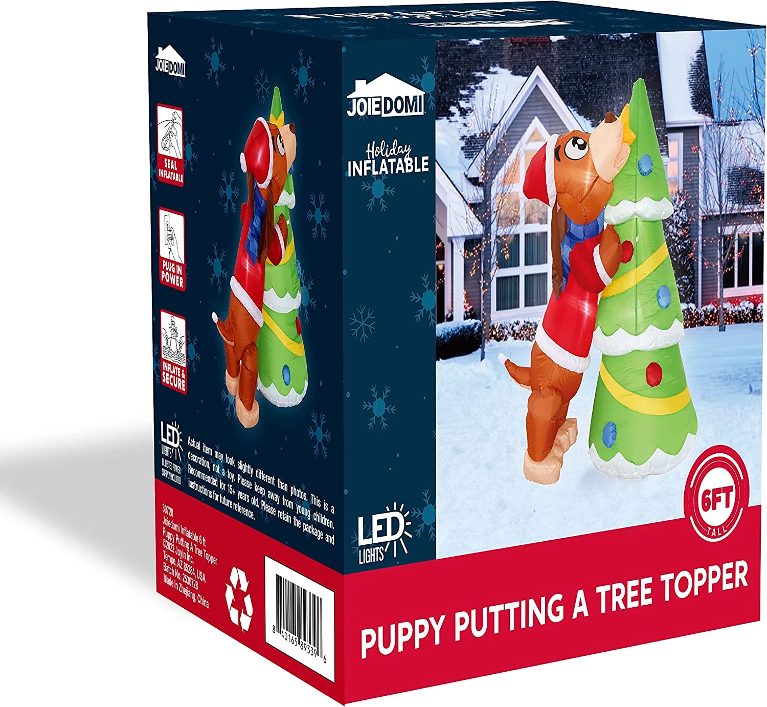 - 6 ft Tall Puppy Putting a Tree Topper Christmas inflatable comes with an extended cord, ground stakes, fastened ropes, built-in sandbags, and a plug with UL certification.