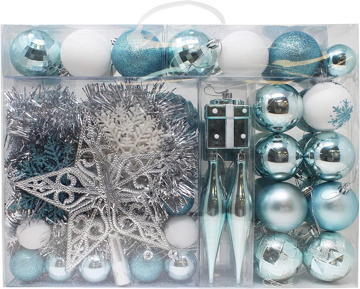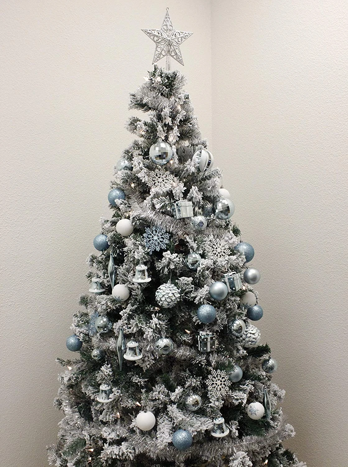 - Matte Balls, 8 Glittery Balls, 6 White Balls, 6 Shiny Balls, 6 Disco Balls, 6 Bells, 5 White Snowflakes, 5 Blue Snowflakes, 4 Geometric Balls, 4 Snowflake Balls, 4 Gift Boxes, 4 Snowflake Icicles, 2 Snowy Pinecones, 1 Swirls Balls, 1 Tinsel Garland, 1 Silver Star Tree Topper.