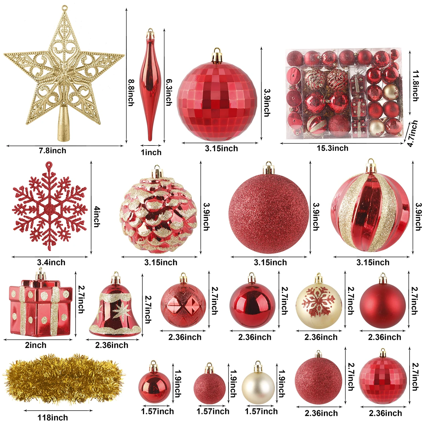 - Our Christmas ornament set includes 8 matte balls, 8 glittery balls, 6 white balls, 6 shiny balls, 6 disco balls, 6 bells, 5 white snowflakes, 5 blue snowflakes, 4 geometric balls, 4 snowflake balls, 4 gift boxes, 4 snowflake icicles, 2 snowy pinecones, 1 swirls balls, 1 tinsel garland, 1 silver star tree topper.