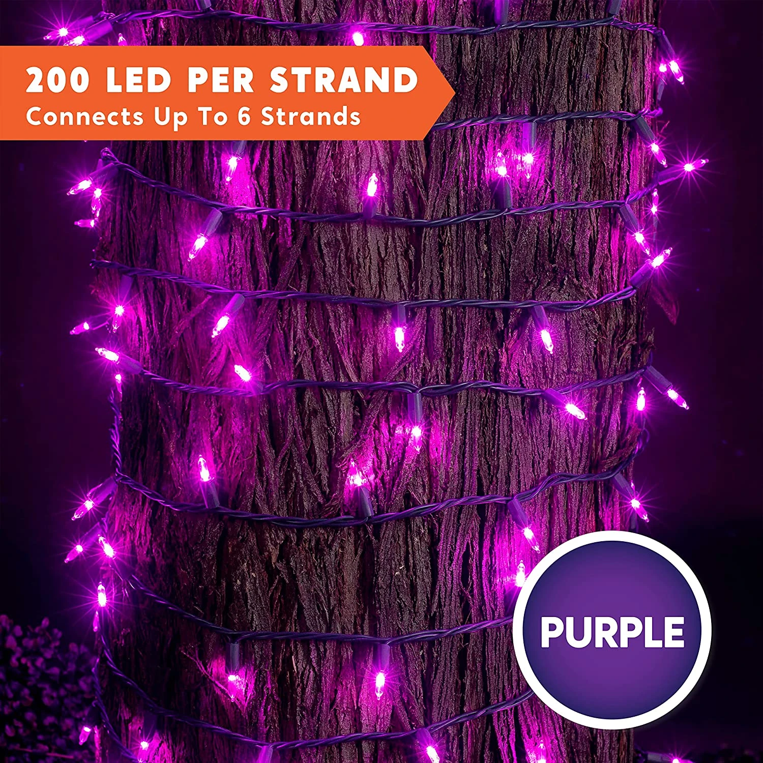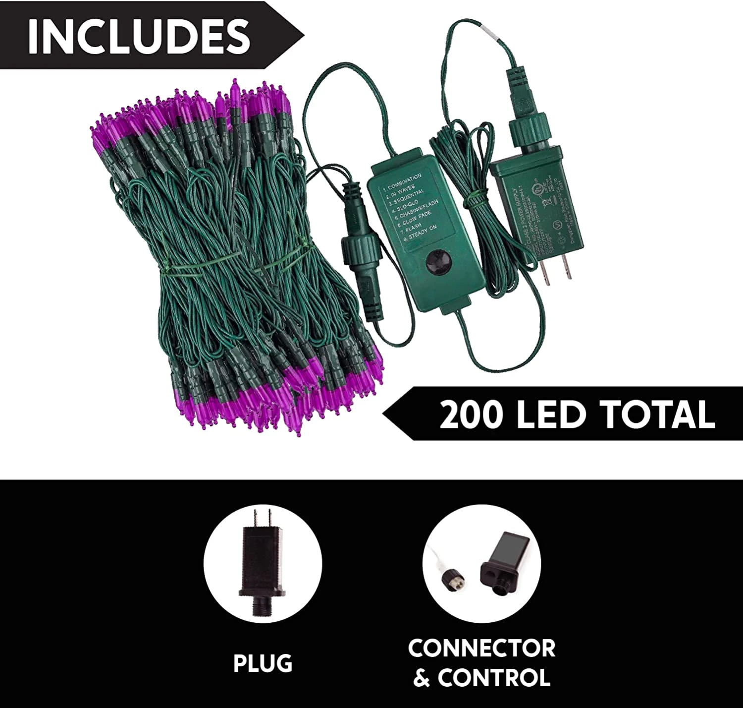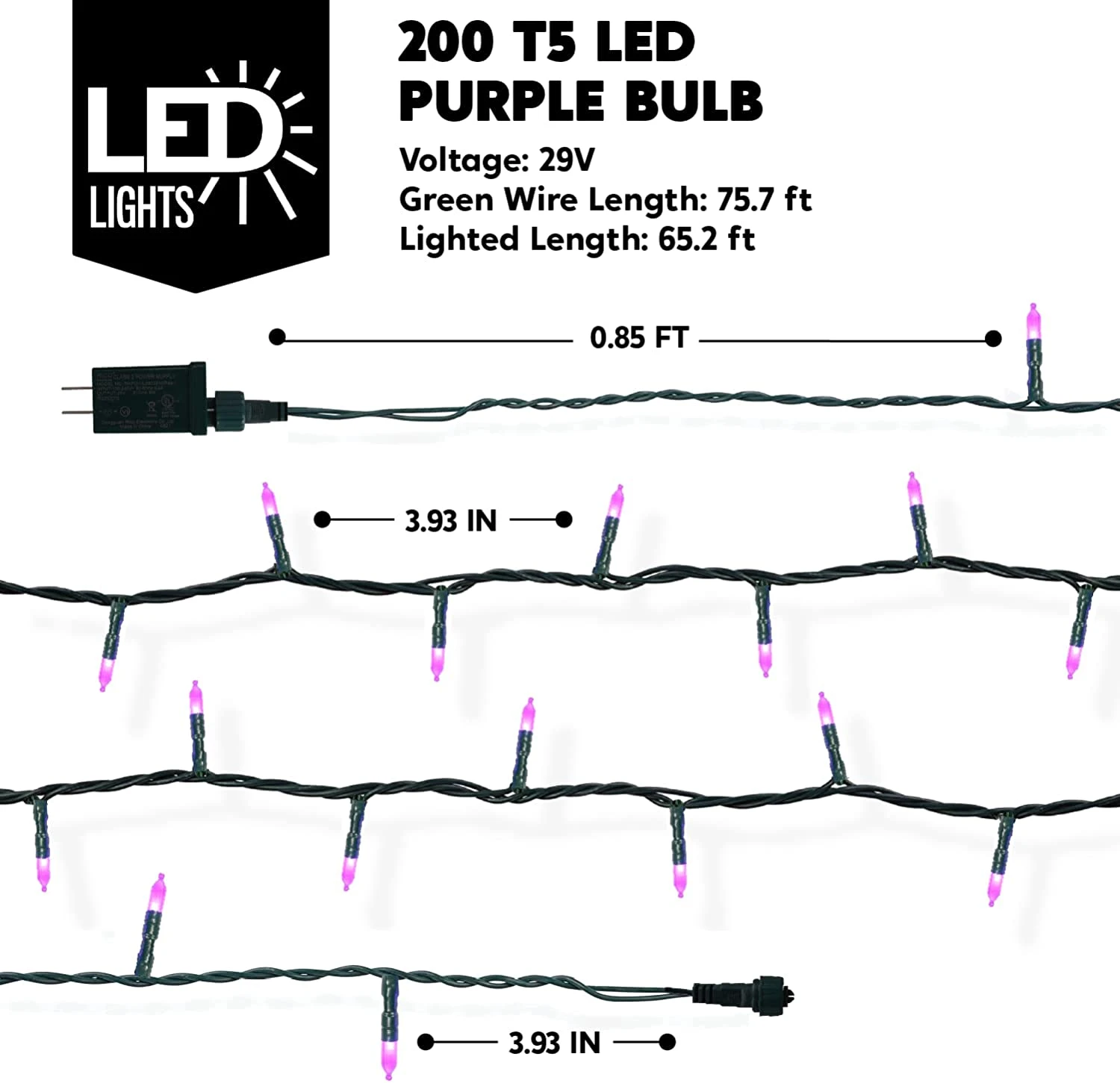 - Our Halloween LED String Lights have a total of 200 LED Purple T5 Bulbs with Green Wire. 29V. Total Lighted Length is 65.2 Feet. Total Wired Length is 75.7 Fee. Bulb Spacing 3.93 inches. Low Voltage.