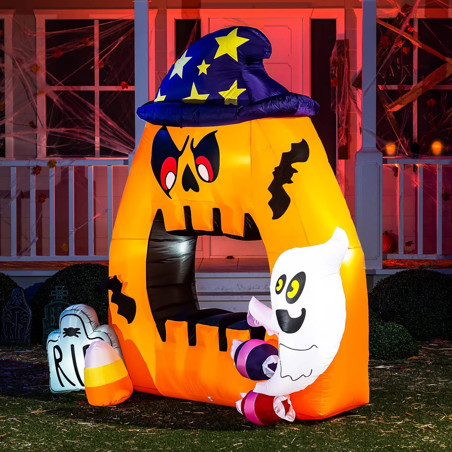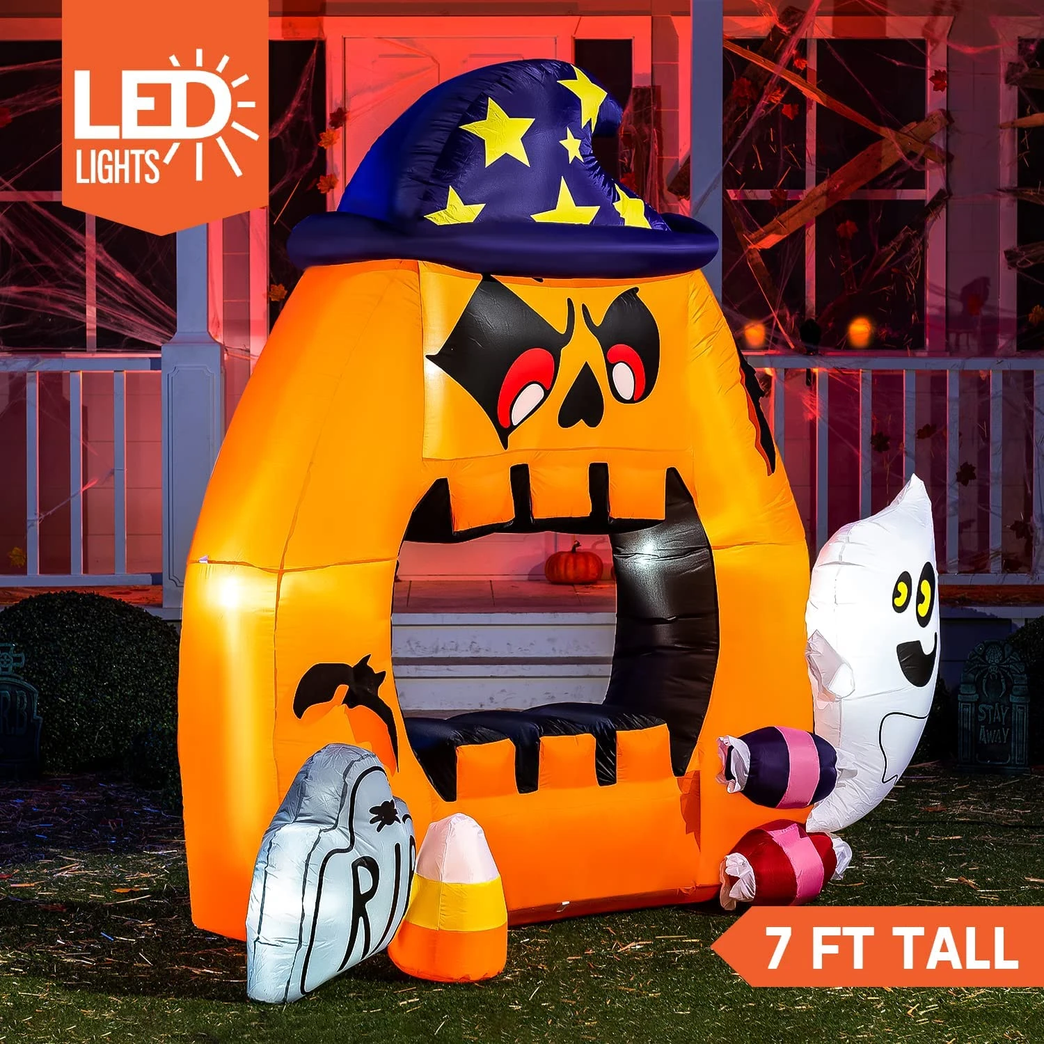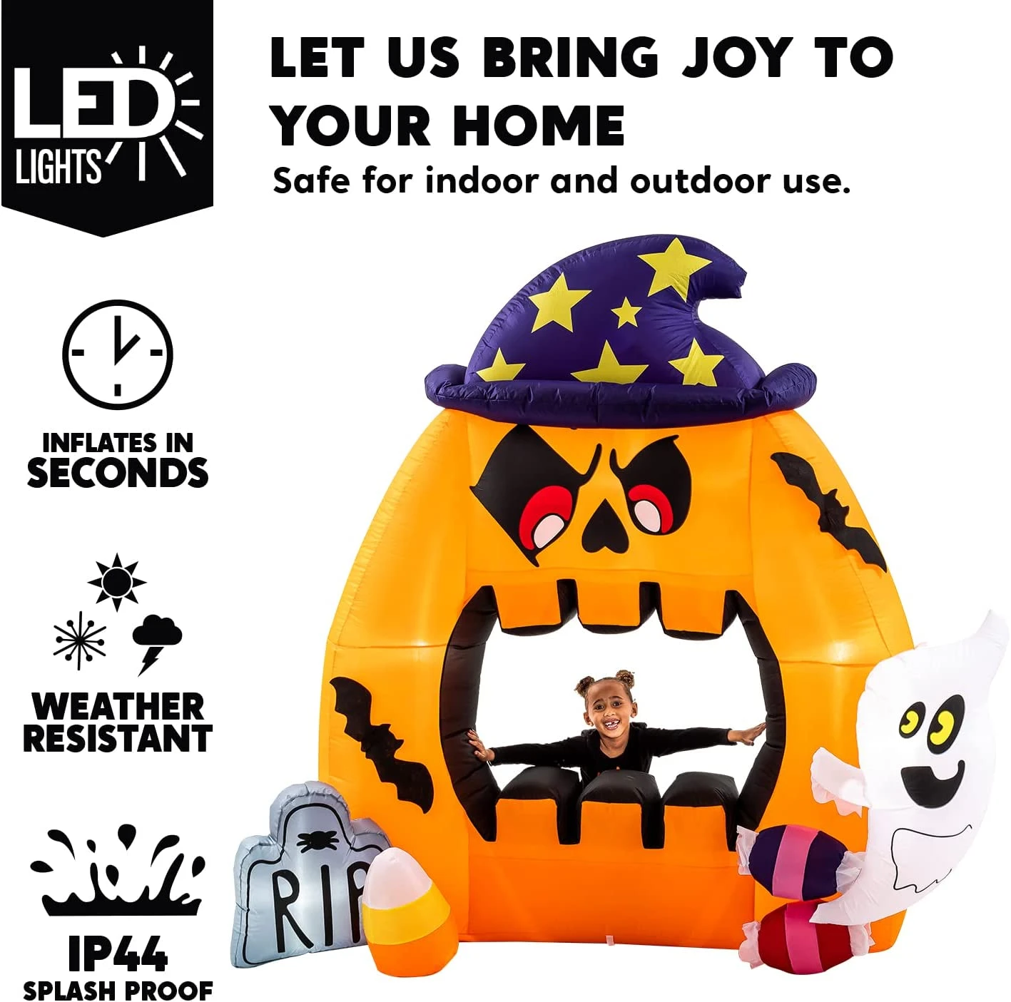 - Our 7 feet tall Halloween inflatable pumpkin photo booth comes with extended cords, ground stakes, fastened ropes, built-in sandbags, and a plug with ul certification.