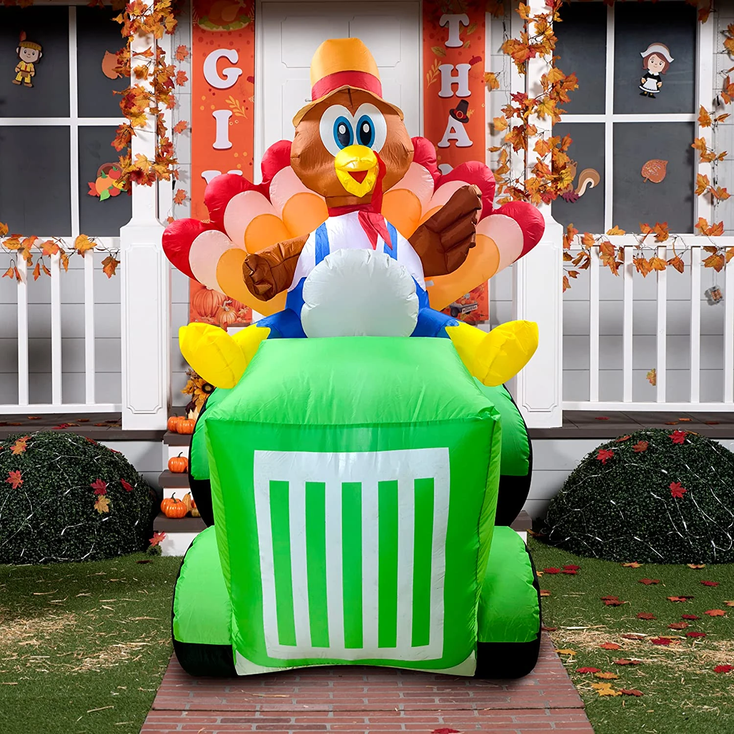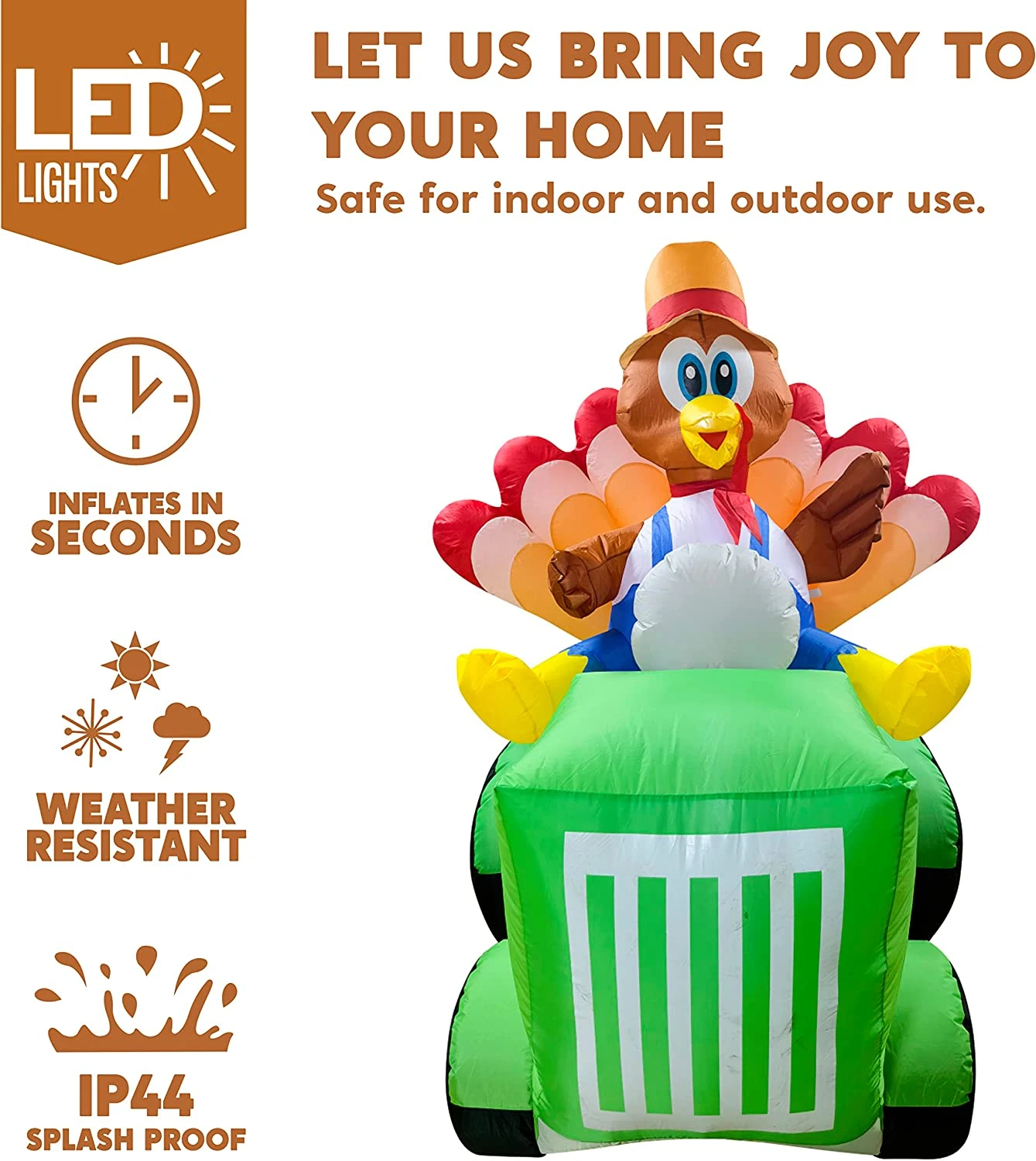- 8 Feet Long Turkey Driving Car Inflatable comes with an extended cord, ground stakes, fastened ropes, built-in sandbags, and a plug with UL certification.