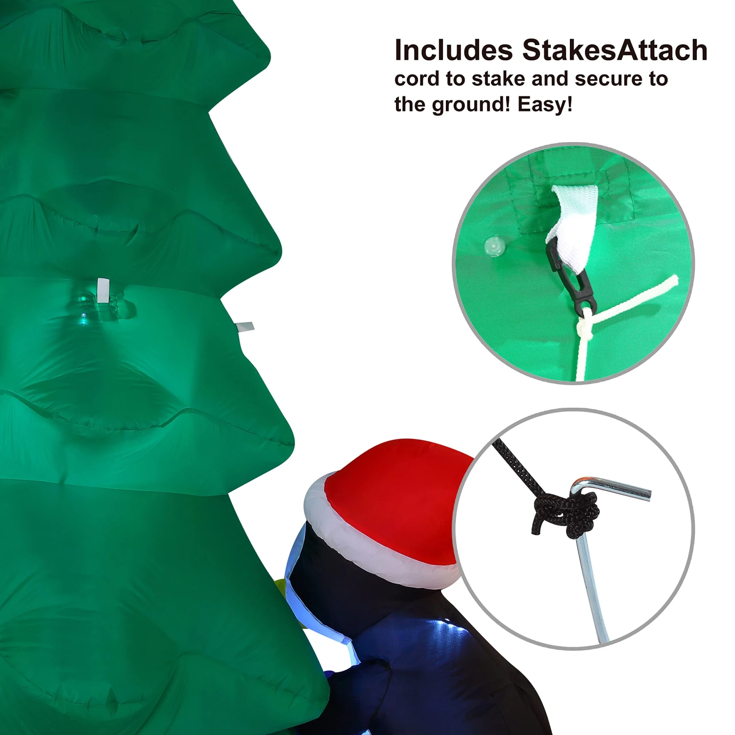 - 8 Feet Tall Penguins Decorating Tree Inflatable comes with an extended cord, ground stakes, fastened ropes, built-in sandbags, and a plug with UL certification.