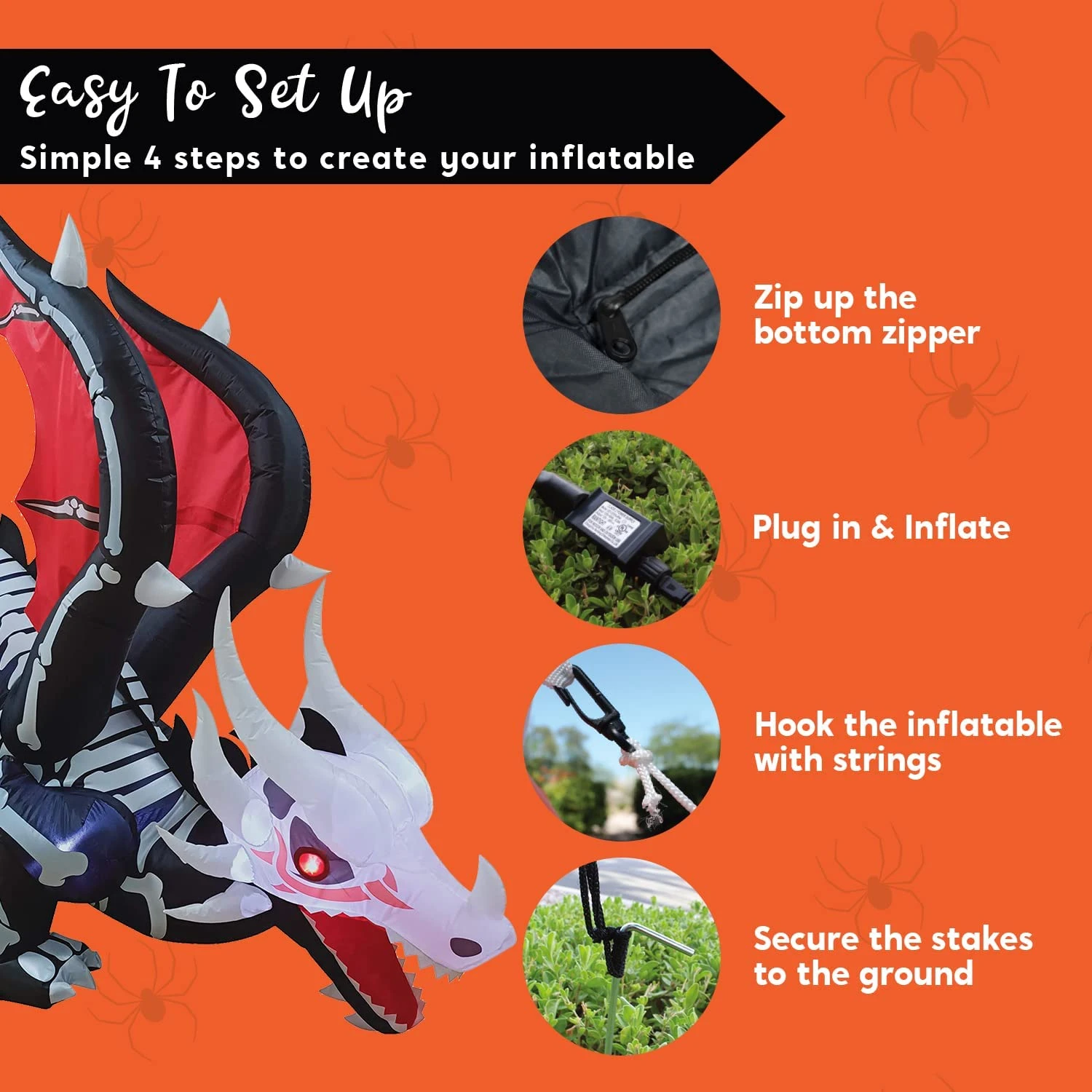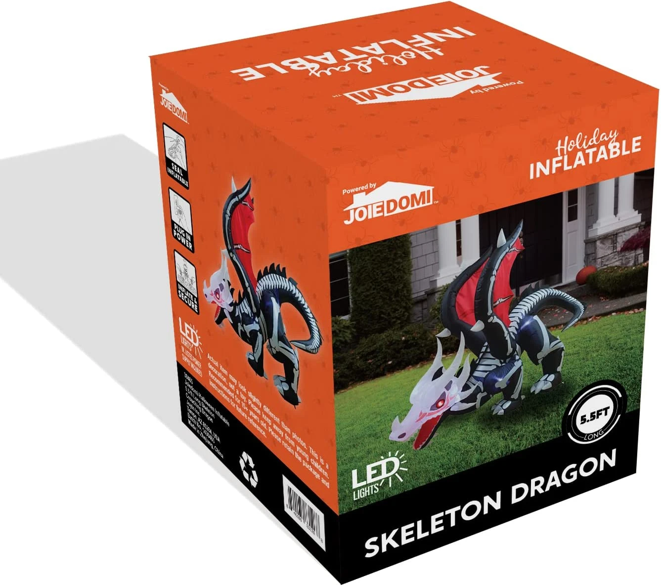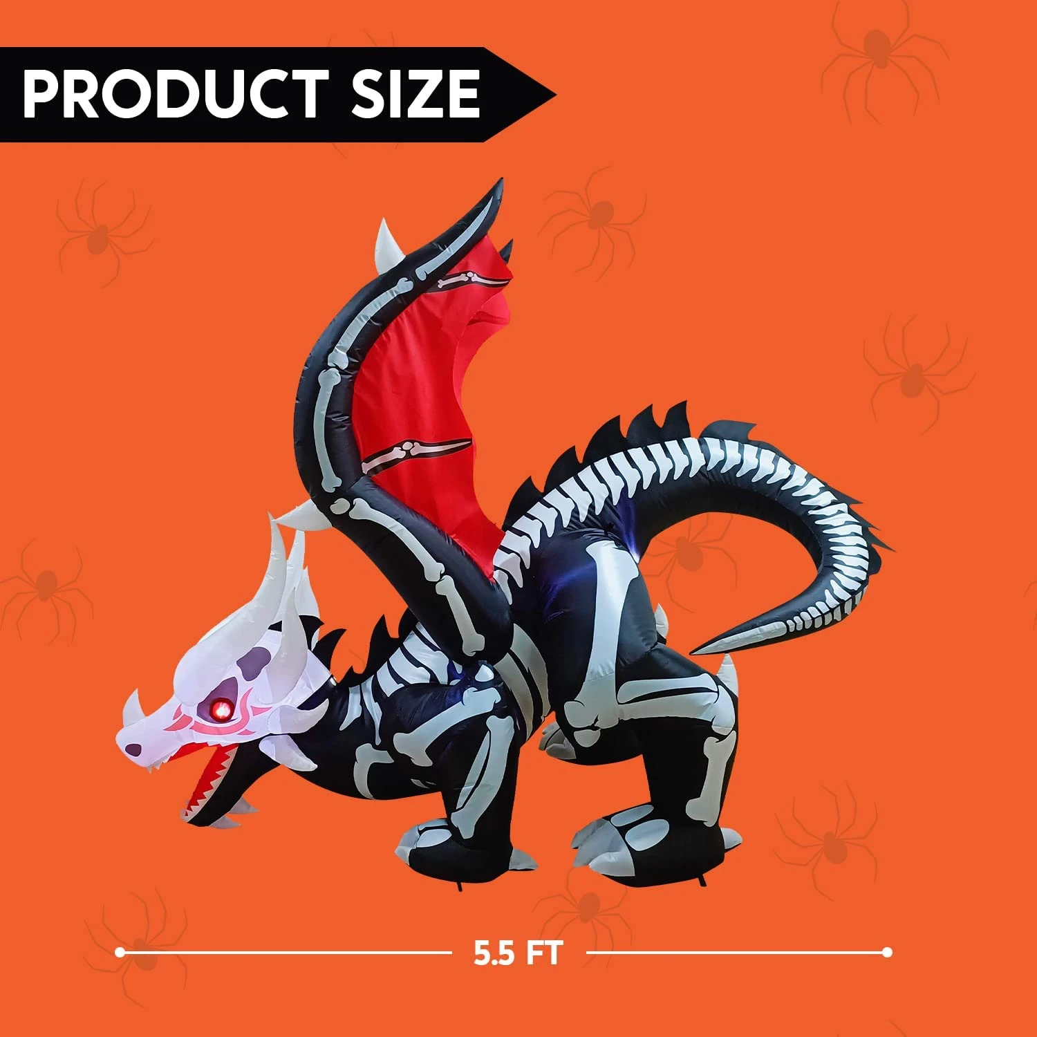 - Our 5.5 Feet Long skeleton dragon inflatable comes with an extended cord, ground stakes, fastened ropes, built-in sandbags, and a plug with UL certification.