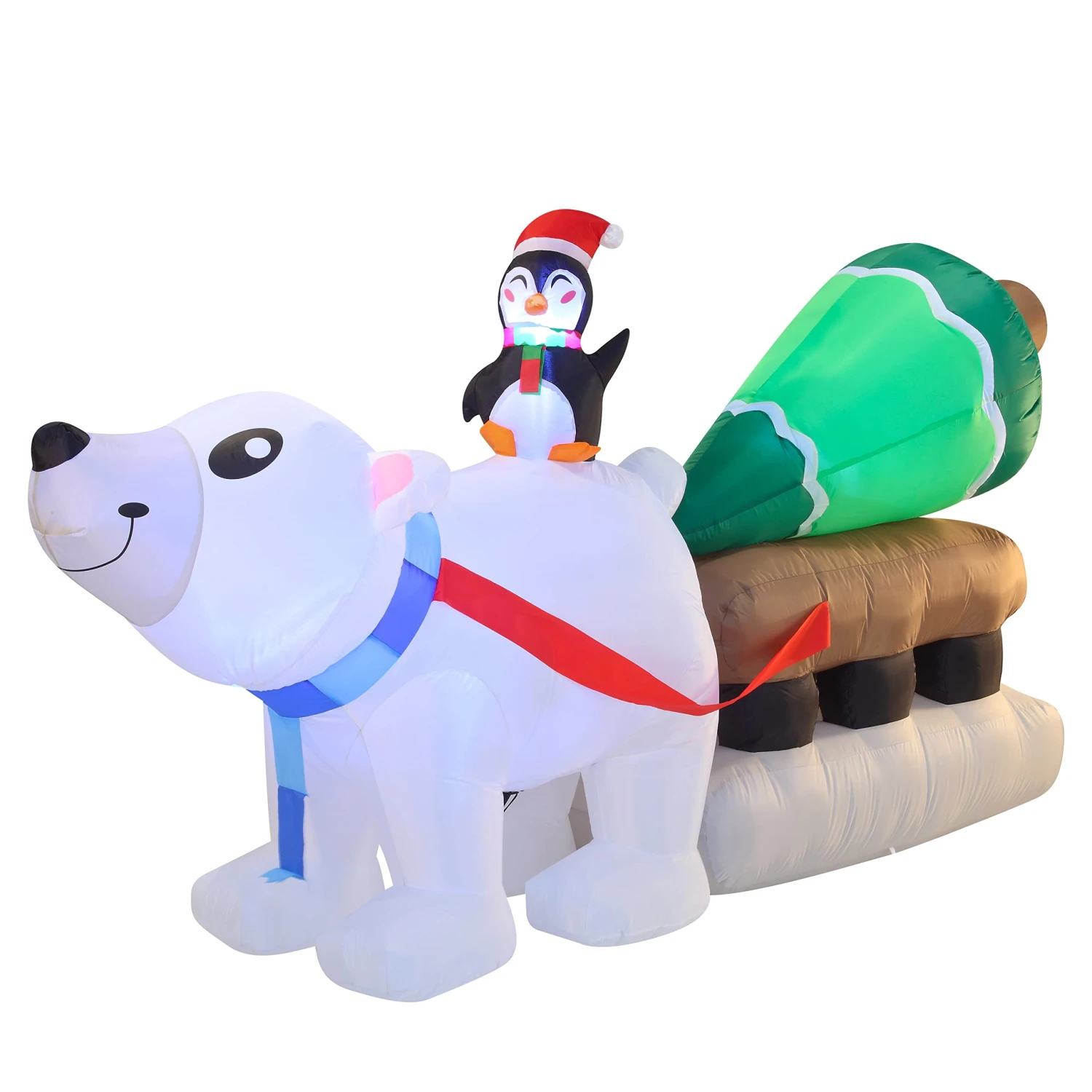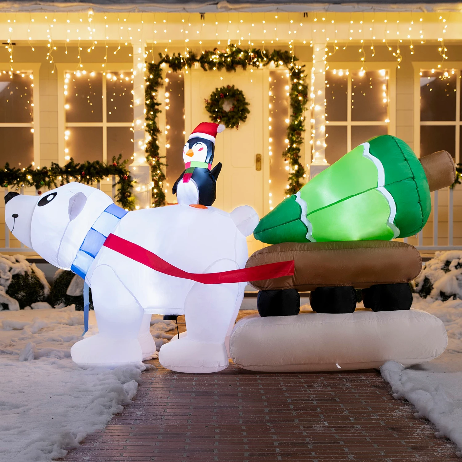 - 8 Feet Long Polar Bear Dragging A Christmas Tree Inflatable comes with an extended cord, ground stakes, fastened ropes, built-in sandbags, and a plug with UL certification.