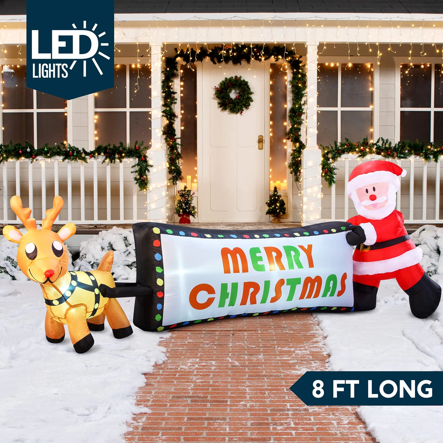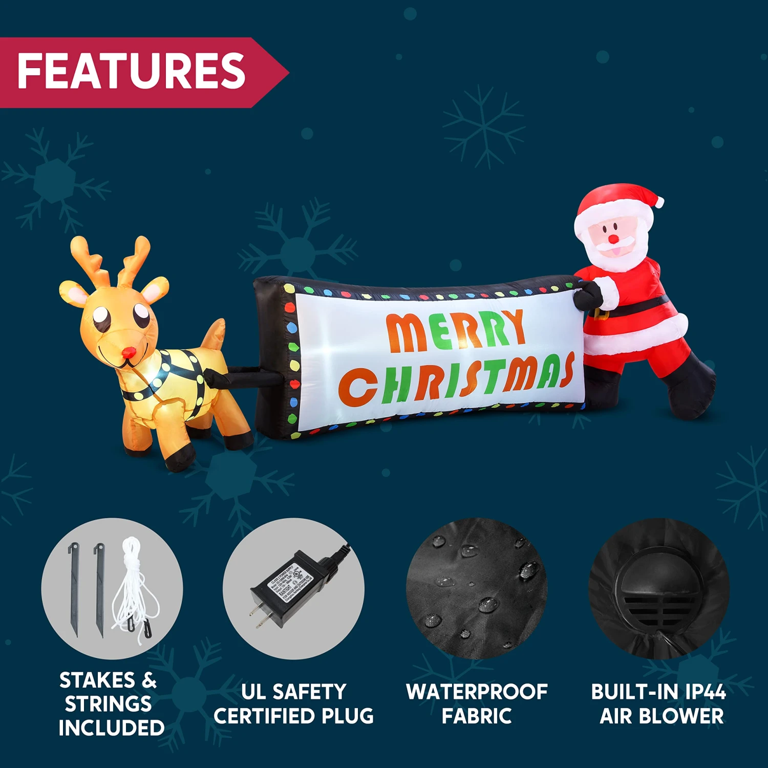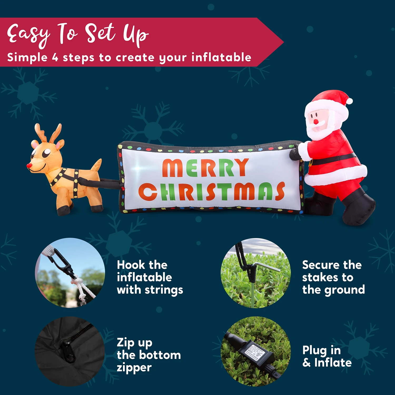 - Our 8 feet long reindeer pulling a banner with Santa banner inflatable comes with an extended cord, ground stakes, fastened ropes, built-in sandbags, and a plug with UL certification.