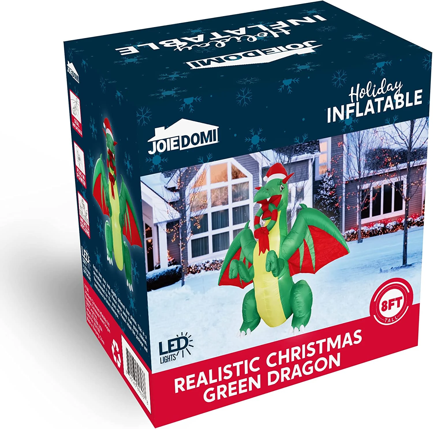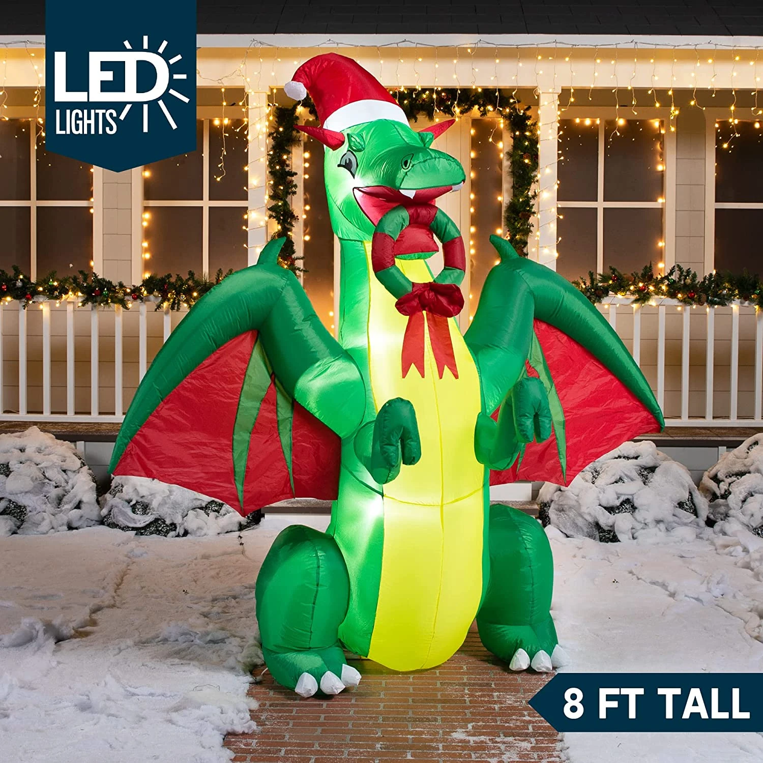 - Our 8 feet tall 8 ft Tall Realistic Christmas Green Dragon Christmas Inflatable comes with an extended cord, ground stakes, fastened ropes, built-in sandbags, and a plug with UL certification.