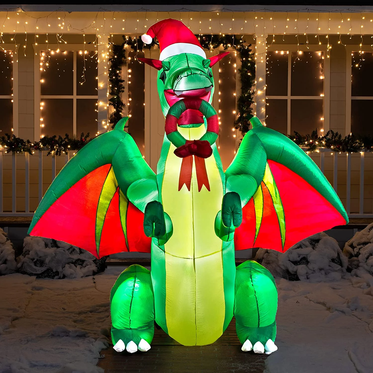 - SPECIAL FEATURE.Create a charming holiday display in your front yard this year with an inflatable fire-breathing dragon. Adorned with a Santa hat and red wings, this dragon drinks hot chocolate and greets passersby in true Christmas fashion.